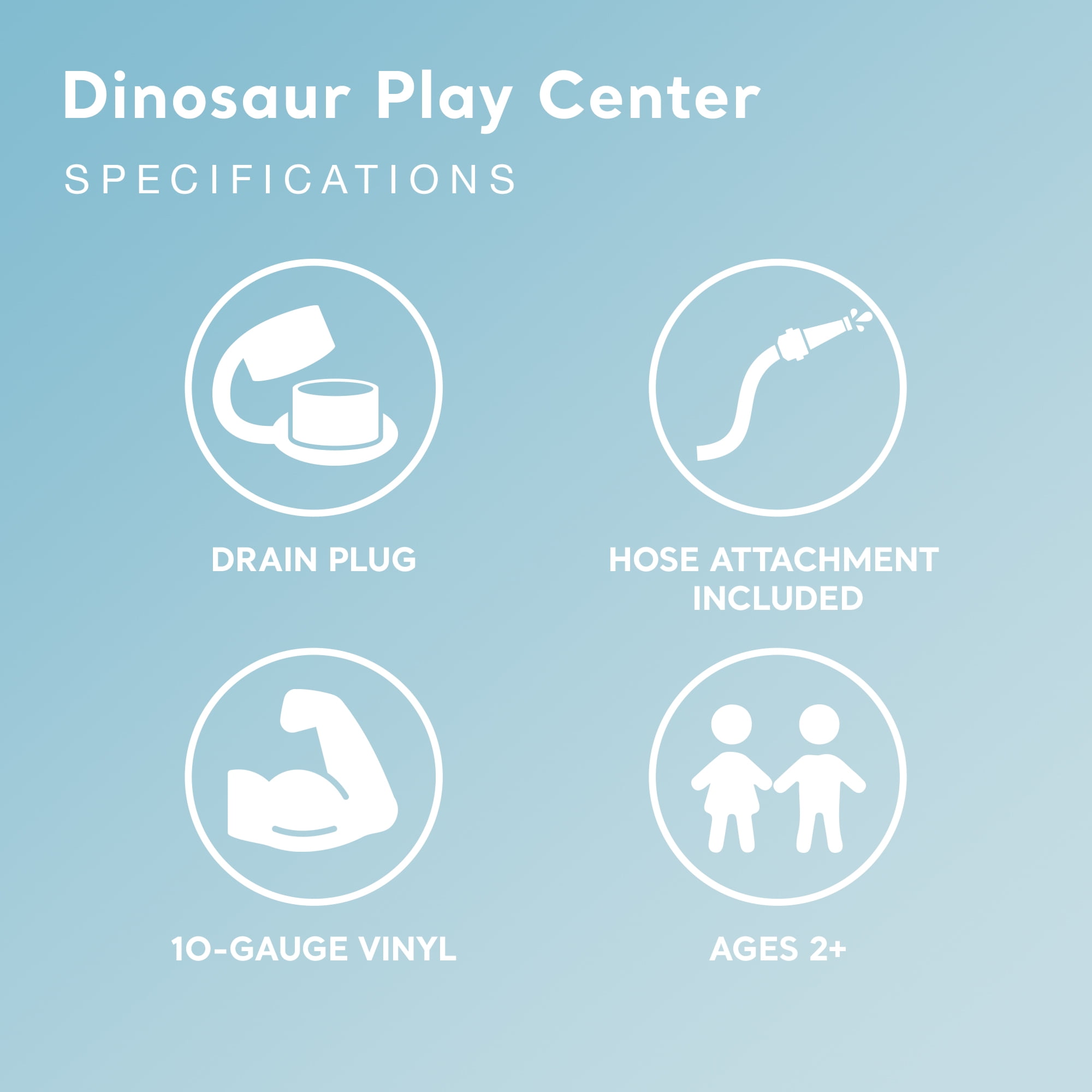 Dinasour water park will have kids playing and splashing in the pool or sliding down the volcano water slide Built-in palm tree water sprayer and waterfall are sure to keep kids cool on hot summer days Includes 6 multi-color balls that fit into the wall for more playtime fun Constructed of durable 10-gauge vinyl materials that hold tough for summer after summer usage Slide is designed with a soft landing mat for comfort and ultimate safety Conveniently drain plug allows you to quickly empty the pool and easily deflate for efficient storage Quickly inflate the inflatable play center and hit the water (pump is not included) Heavy-duty repair patch is included Recommended for kids ages 2 years and up Maximum weight limit: 178 pounds Water capacity: 72 gallons Material: PVC Color: Multicolor Dimensions (L x W x H): 95 x 75 x 43 inches Weight: 10 pounds Manufacturer warranty: 30-day warranty