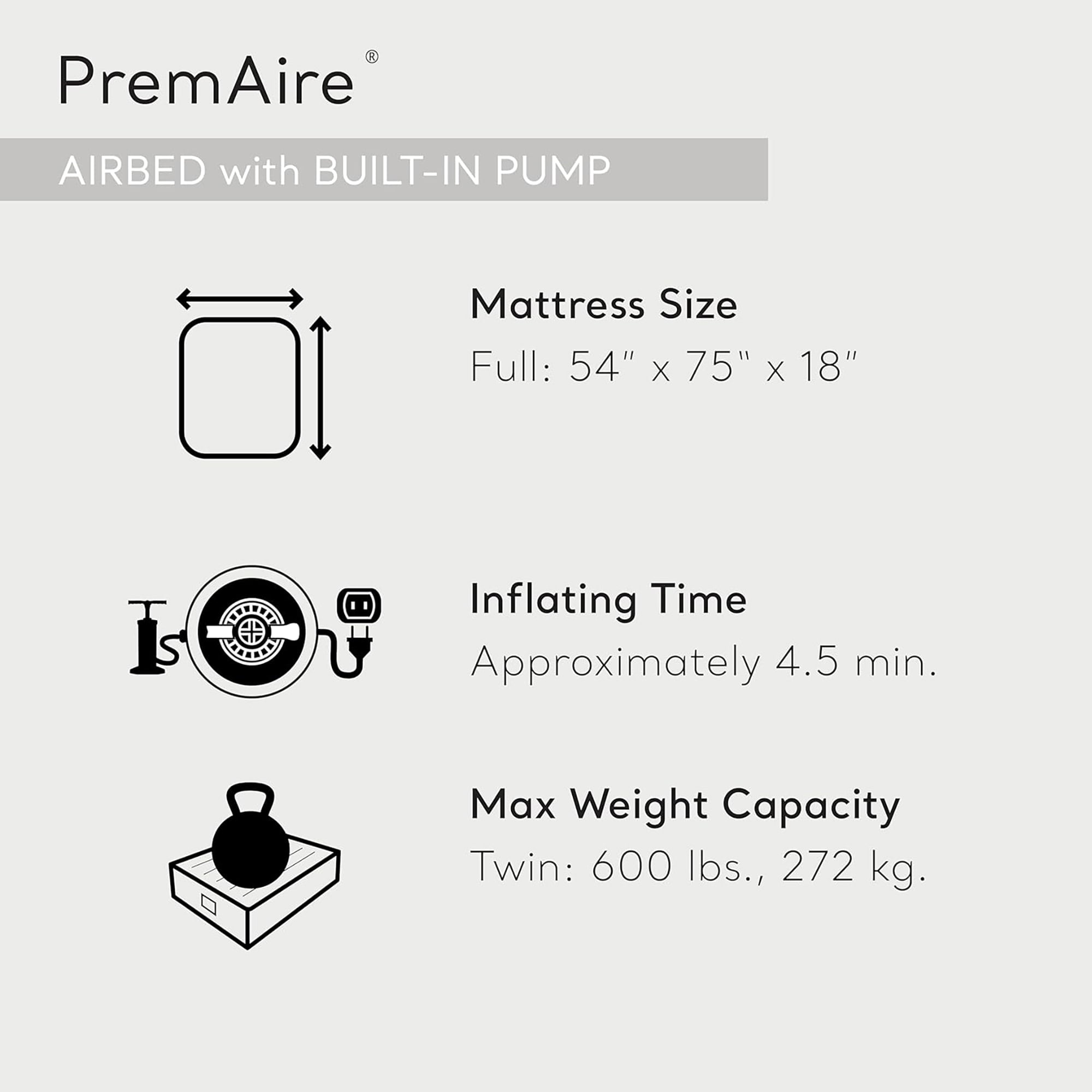INTEX: PREMAIRE I: FULL – ELEVATED AIRBED – Elevate your sleeping experience with the Intex PremAire I Full Airbed, the ultimate blend of luxury, durability, and convenience. Engineered with patented Fiber-Tech Construction, this airbed offers unparalleled structural stability and support, ensuring you rest comfortably whether you’re at home or on the go. The soft pillow-top surface features specially designed air chambers that allow air to flow smoothly, delivering a plush and supportive feel. For added durability, the 2-ply laminated PVC sides and bottom provide exceptional puncture resistance while maintaining optimal air retention. Standing at 18 inches in height, this elevated airbed offers the convenience of easy entry and exit, mimicking the feel of a traditional mattress. The powerful internal pump inflates the bed in approximately 2.5 minutes, making setup effortless. The bed deflates just as quickly for easy storage in the stylish lightweight carry bag included with your purchase. With dimensions of 54″ x 75″ x 18″, a maximum weight capacity of 600 lbs, and a 1-year limited warranty, the Intex PremAire I Full Airbed is designed to deliver premium comfort and long-lasting performance. Whether you’re hosting guests or heading on an adventure, this airbed ensures a restful night’s sleep every time. KEY FEATURES OVERVIEW: 1) 64903ED Intex 18in Full PremAire I Airbed with Internal Pump. 2) Built with our patented Fiber-Tech construction, our PremAire I beds offer superb structural stability and support. The high-strength fibers provide an interior with amazing durability and unmatched comfort. The bottom and sides of the mattress are made of laminated PVC to provide high-quality puncture resistance. The mattress pillow top is made up of air pockets that allow air to flow smoothly and gradually across the surface for an unparalleled sleeping experience. 3) Soft pillow top sleeping surface – Specially designed chambers allow air to flow smoothly across the top of the airbed for added comfort. 4) Durable 2-ply material – Laminated PVC side walls and bottom firmly retain air while providing a high-quality puncture resistant surface. 5) 18in bed height – The bed´s elevated height makes it easier to get in out of the bed. 6) Lightweight carry bag – stylish carry bag for easy storage and transport. 7) Powerful internal pump for rapid inflation and deflation. 8) Approximate inflation time is 3.5 mins. 9) Approximate inflated size 54″ x 75″ x 18″. 10) Max weight capacity 600 lb. 11) 1-Year Limited Warranty.