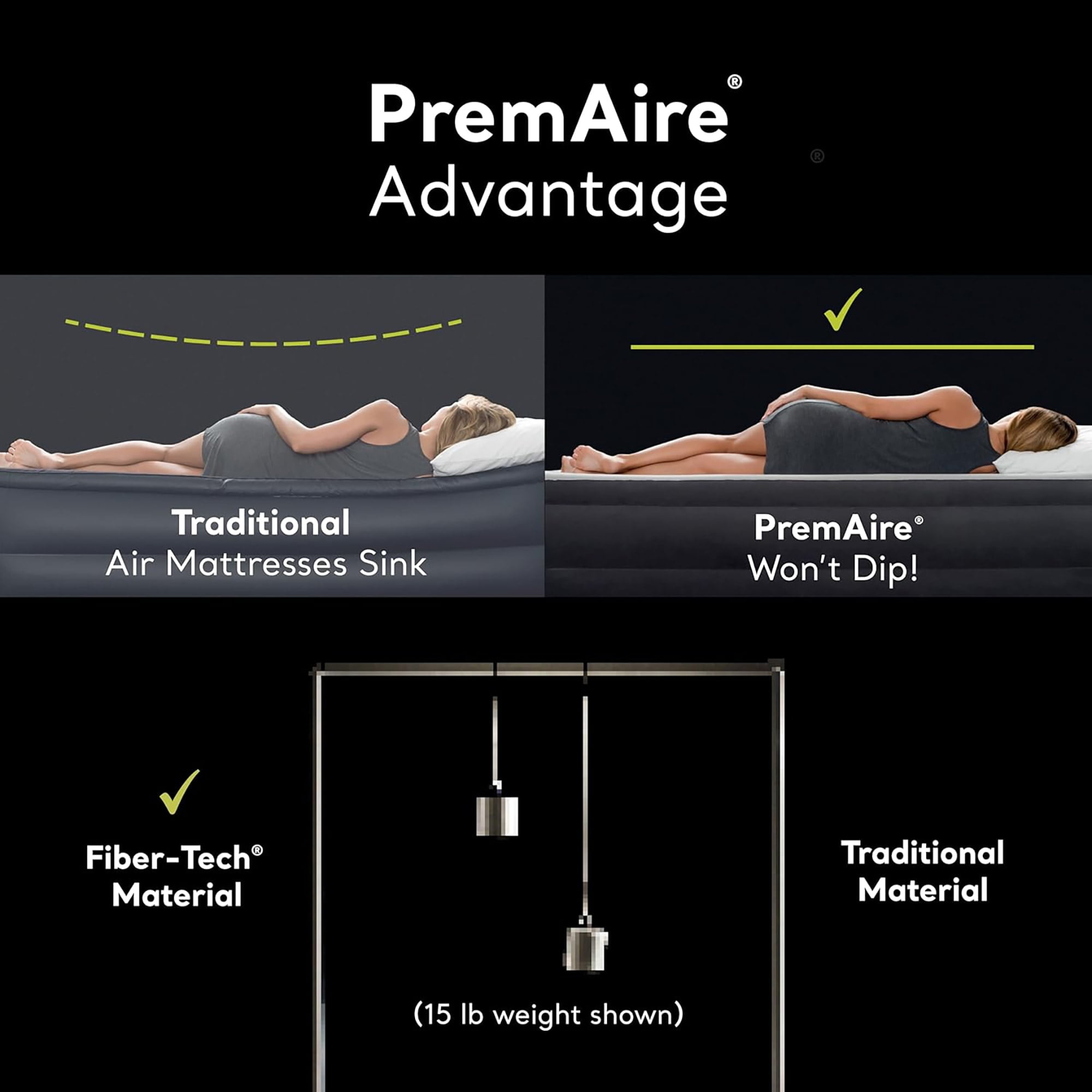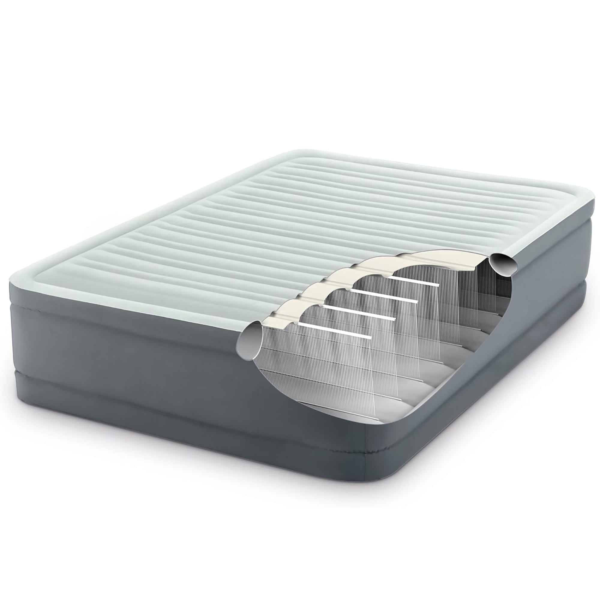 COMFORT TOP: Sleep on a pillowtop air mattress of pure luxury with this Intex PremAire Elevated II Air Mattress; Provide your guests with a cozy comfort top Airbed during their next visit. FIBER-TECH CONSTRUCTION: Engineered with the Fiber-Tech construction, high-strength polyester Fiber-Tech fibers do not stretch over time; PremAire provides enhanced comfort, stability, and support. ADJUSTABLE COMFORT: The luxurious pillowtop has hundreds of inter-connected air pockets engineered in a way that allows air to flow gently across the surface, creating comfort; Ultra-lightweight bed adjusts to your personal firmness. ELEVATED DESIGN: The bed’s elevated height makes it easier to get in and out of, much like a traditional mattress. Stay securely in place on the sleeping surface, thanks to the raised support around the top and bottom edges. DURABLE 2-PLY MATERIAL: 2-ply fully laminated PVC walls and bottom firmly retains air while providing a high-quality puncture-resistant surface.