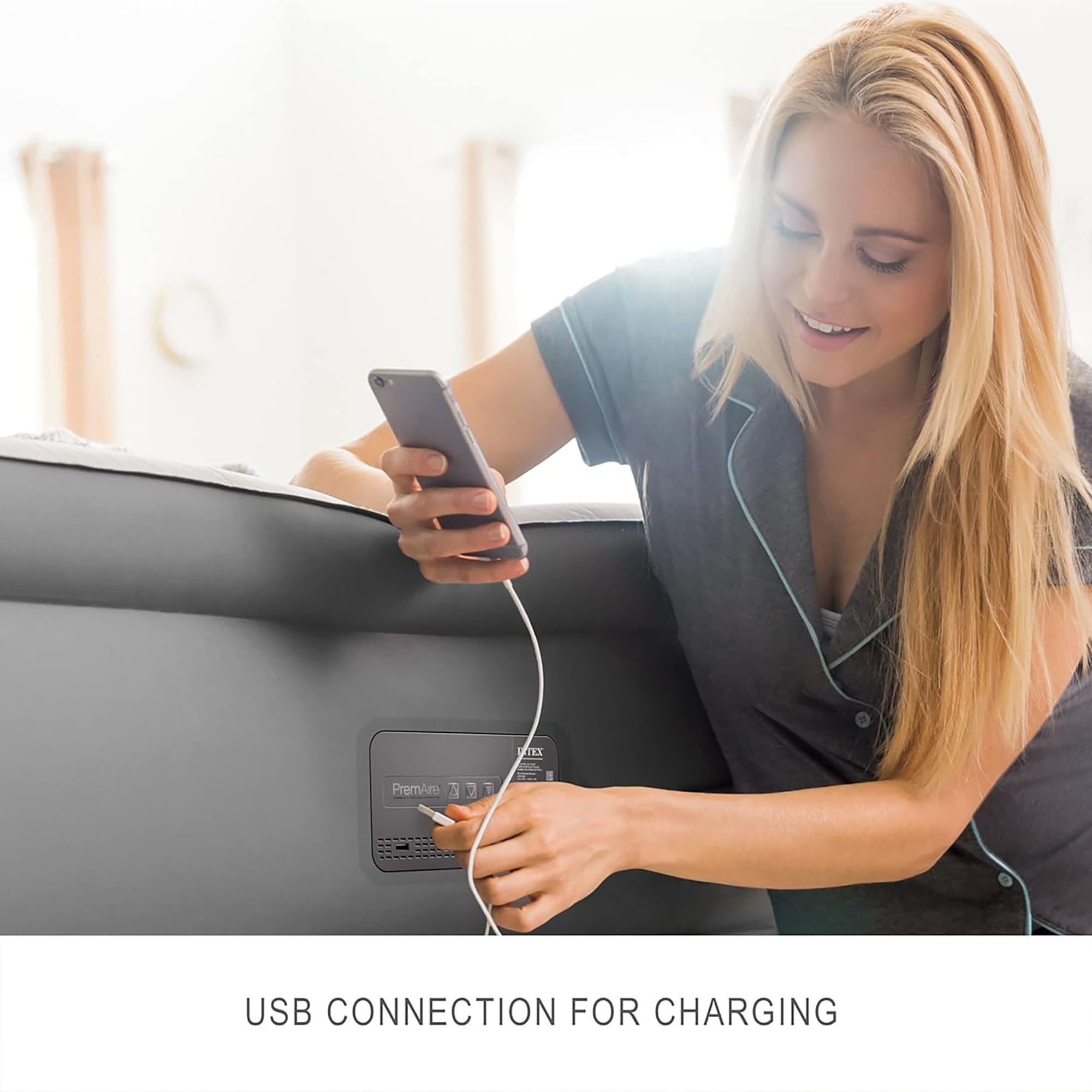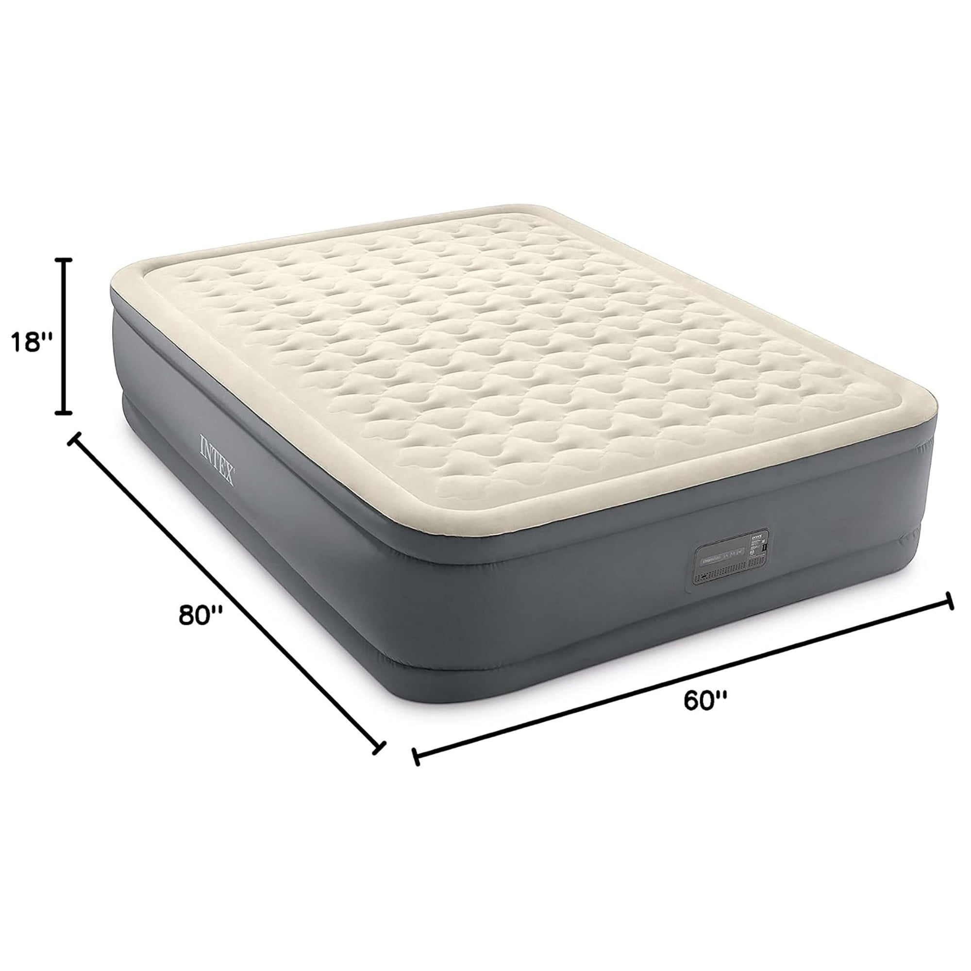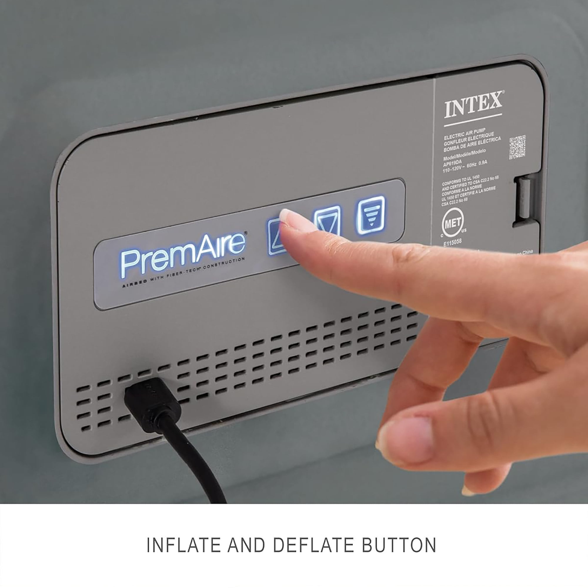 INTEX: PREMAIRE II: QUEEN – ELEVATED AIRBED – Experience unmatched luxury and support with the Intex PremAire II Queen Airbed. Designed for ultimate comfort and durability, this airbed is crafted with patented Fiber-Tech Construction, offering superb structural stability and support for a restful night’s sleep. The velvety comfort top provides a soft and plush surface, while the 2-ply fully laminated side walls and bottom ensure superior durability, firmness, and air retention. Perfect for both indoor and outdoor use, this airbed is built to last in any environment. The innovative digital comfort pump panel allows you to effortlessly adjust firmness to your preference, while the integrated USB port ensures your devices stay charged. For added convenience, the pump panel includes a storage compartment for cords and small personal items. The 2-in-1 valve provides flexibility for inflation with a manual pump, making it ideal for outdoor adventures. Standing at 18 inches high, the bed is easy to get in and out of, mimicking a traditional mattress. The powerful 110-120V internal pump inflates the airbed in approximately 4 ½ minutes, and it deflates just as quickly for seamless storage in the stylish carry bag included. With dimensions of 60″ x 80″ x 18″, a 600-lb weight capacity, and a 1-year warranty, the Intex PremAire II Queen Airbed combines elegance, functionality, and peace of mind. Whether you’re hosting guests or heading outdoors, this premium airbed delivers a sleeping experience that’s second to none. KEY FEATURES OVERVIEW: 1) 64925EP Intex 18in Queen PremAire II Airbed with Digital Comfort Pump. 2) Fiber-Tech Construction. 3) Luxurious velvety comfort top with heavy duty 2-ply laminated side walls and bottom. 4) Revolutionary, patented Fiber-Tech support system provides the perfect combination of superb structural stability and support. 5) The 2-ply fully laminated airbed firmly retains air while providing a perfect combination of superior durability, firmness, and comfort. 6) Newly designed pump panel with firmness control dial and USB port. 7) Convenient storage for cord and small personal items. 2-in-1 valve included for easy inflation and deflation with manual pump. Idea for outdoor use. 8) Powerful 110-120V internal pump for rapid inflation and deflation. 9) Approximate inflation time is 4 1⁄2 minutes. 10) Peace of mind 1 year warranty. 11) Stylish carry bag for easy storage and transport. 12) Dimensions 60″ x 80″ x 18″. 13) Weight capacity 600 lbs.
