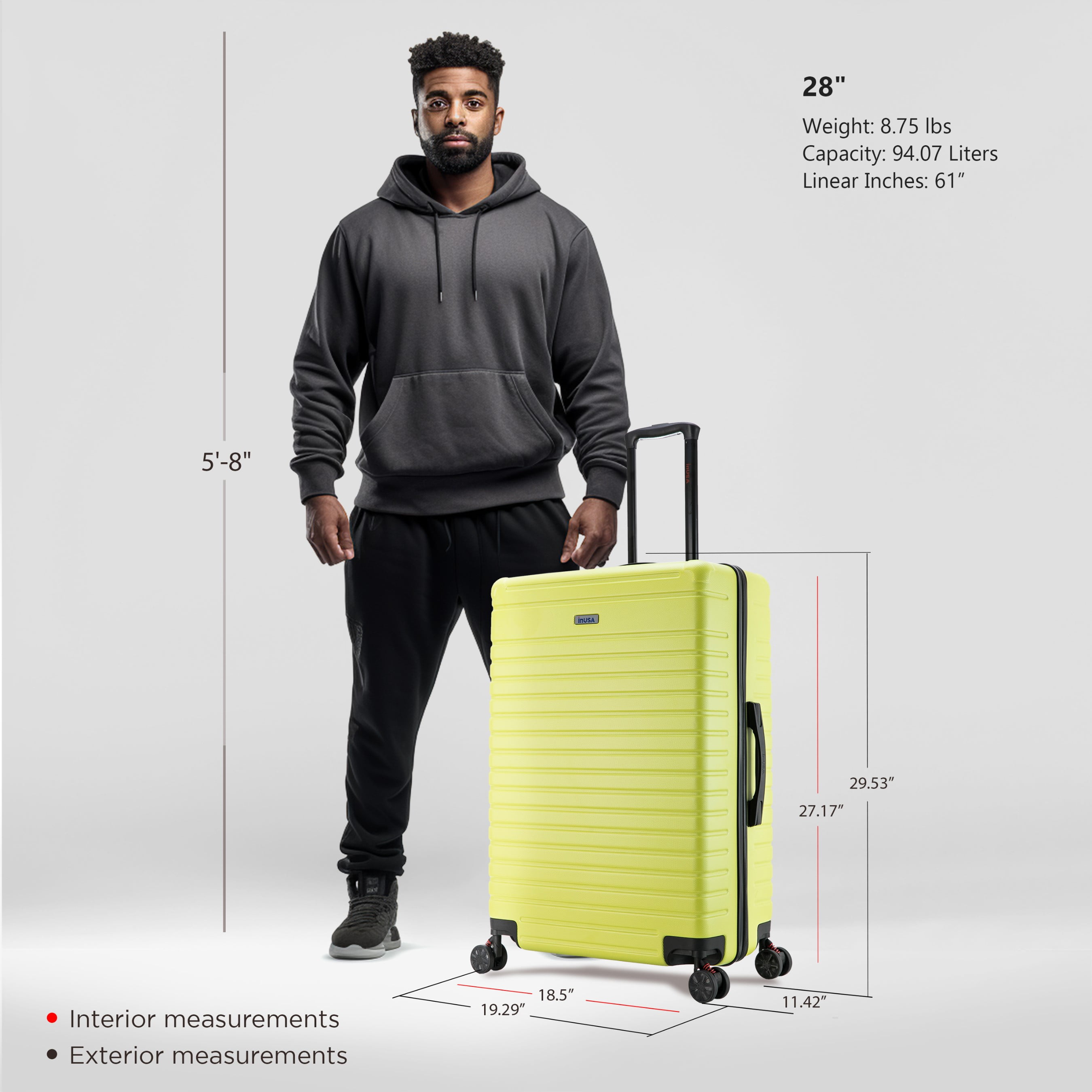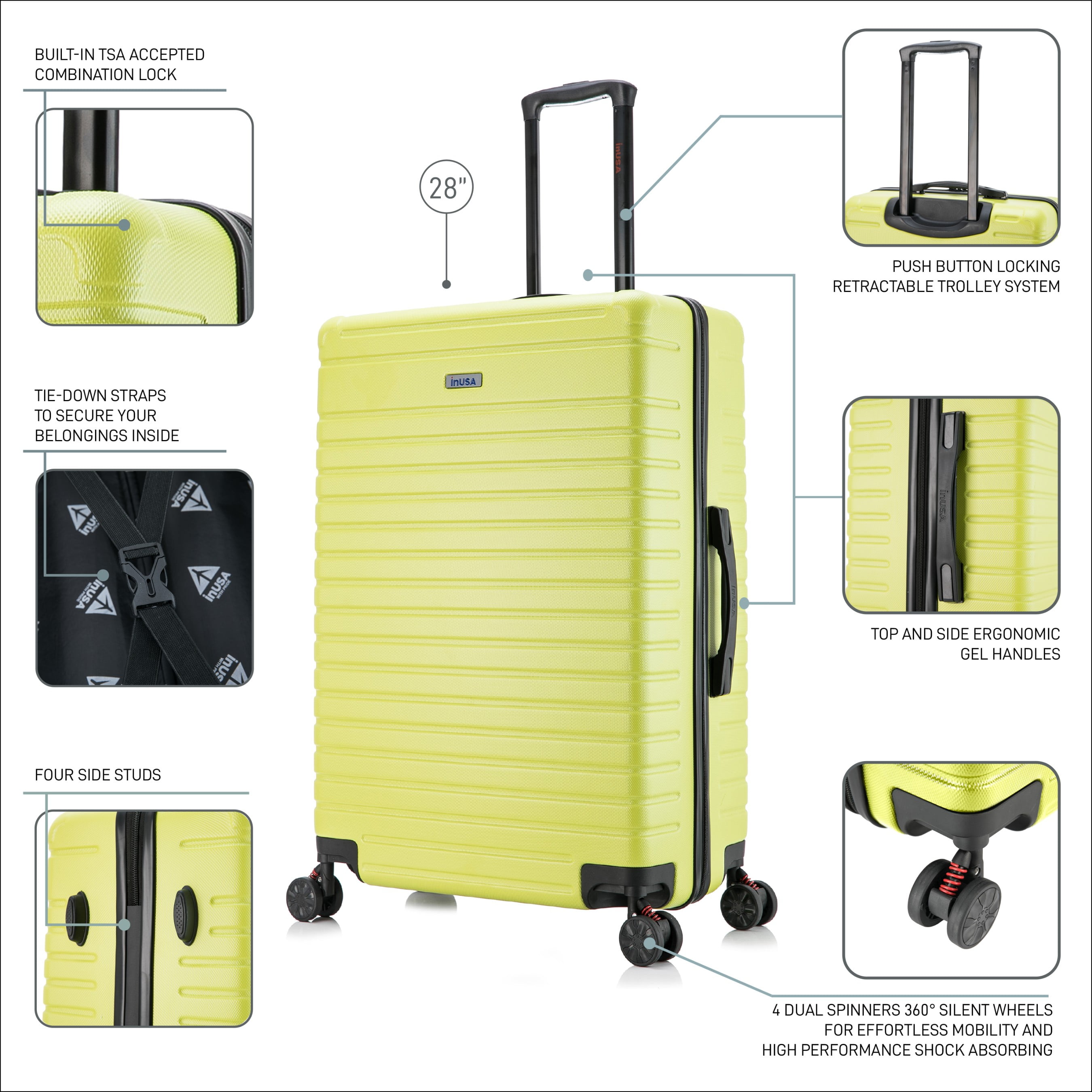 STURDY AND LIGHTWEIGHT: The lightweight shell of the travel suitcase makes this hard luggage easy to carry anywhere, It only weighs 8.75 pounds and is your perfect companion for any trip DURABLE AND TOUGH: The hard-flex body with the micro-diamond finish on the large checked bag hard suitcase makes it durable, strong, and stylish, with a scratch and water-resistant surface ORGANIZED AND SPACIOUS: The 28 inch hardside large checked suitcase luggage bag is perfect for long trips, The large checked luggage meets all the standards for most domestic and international flights across the world MANEUVERABLE AND CONTROLED: The trolley of the large checked suitcase has a push-button which makes the hardshell luggage easy to handle. The GEL handles provide a comfortable lifting HASSLE-FREE TRIP: The 4 spinner luggage wheels from rolling luggage are silent with a 360° movement and max stability, InUSA large suitcase will make you travel with comfort and style