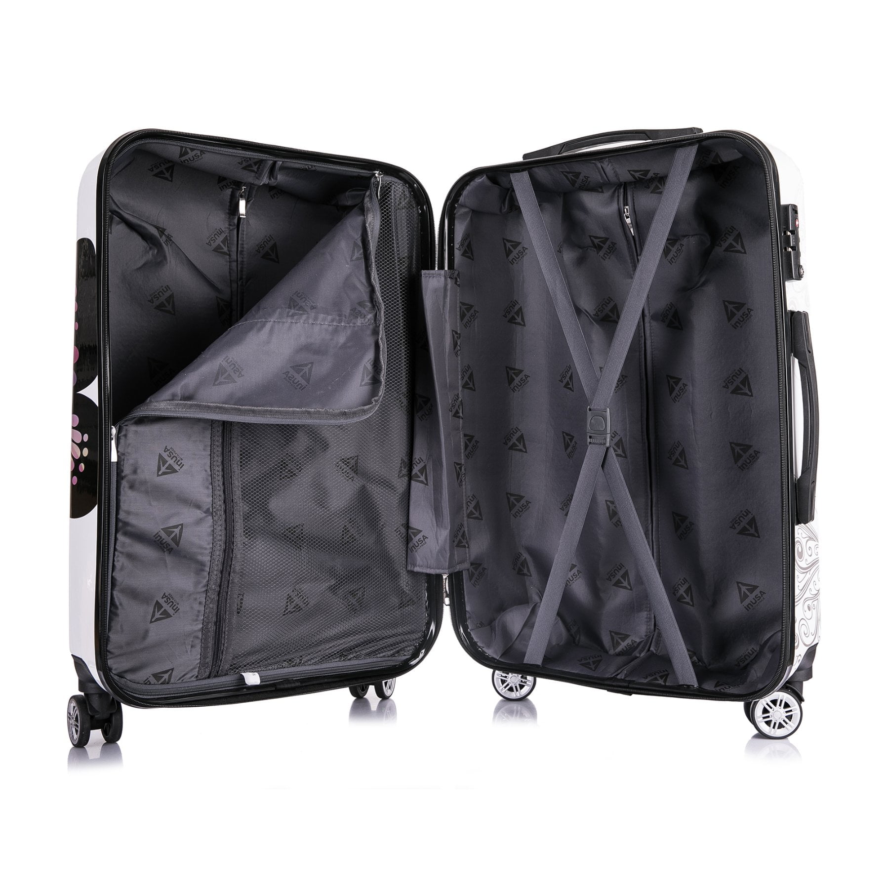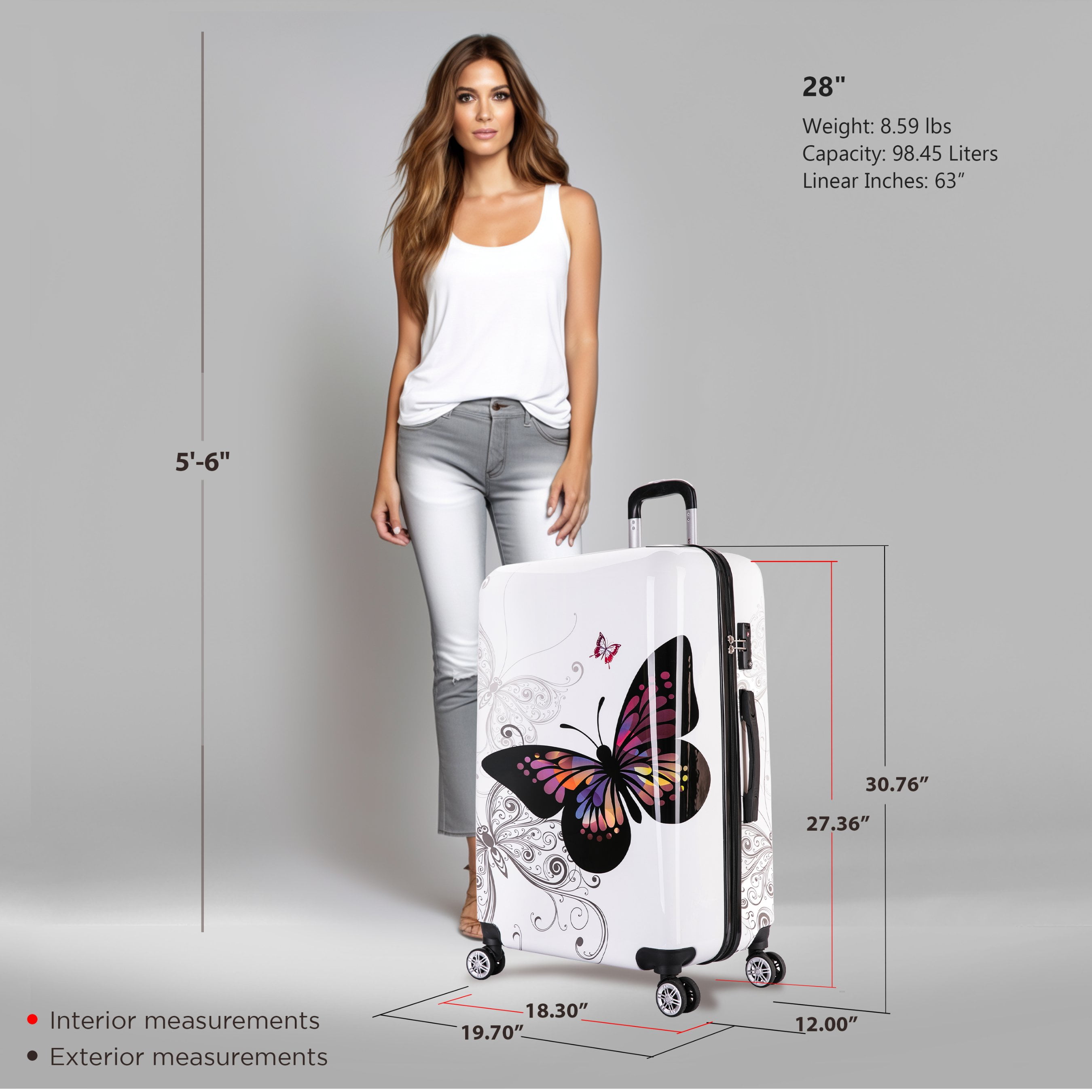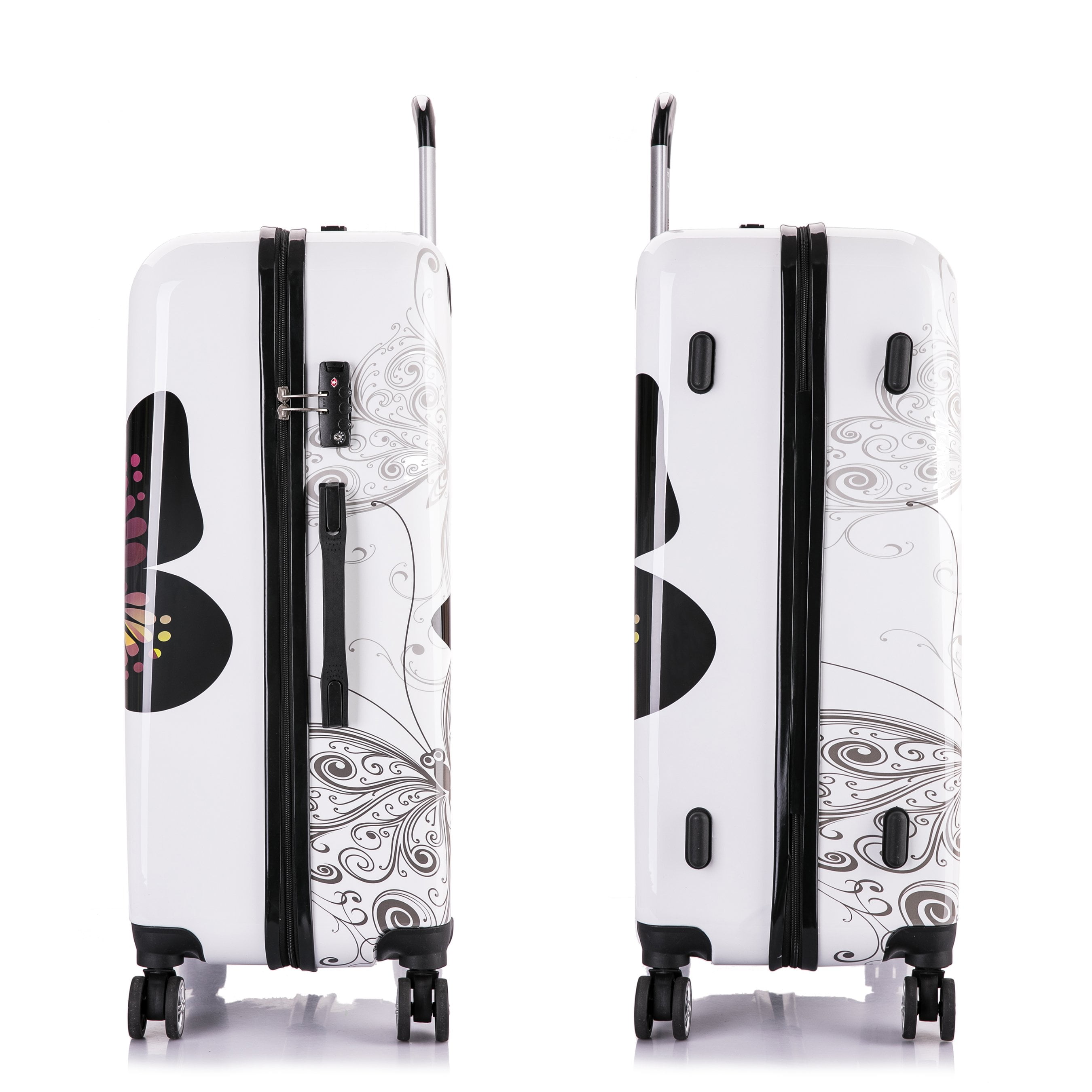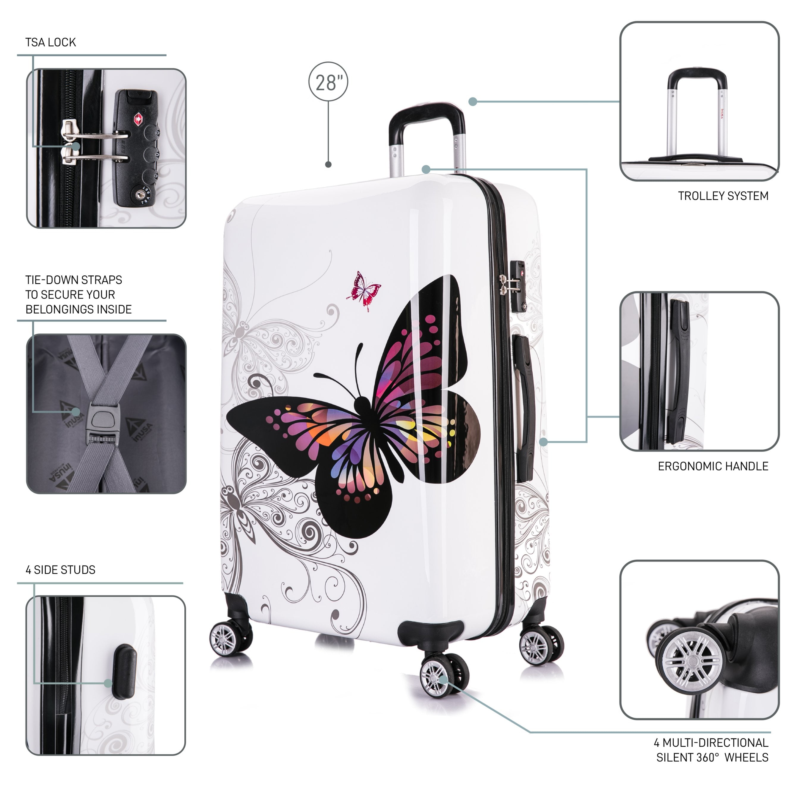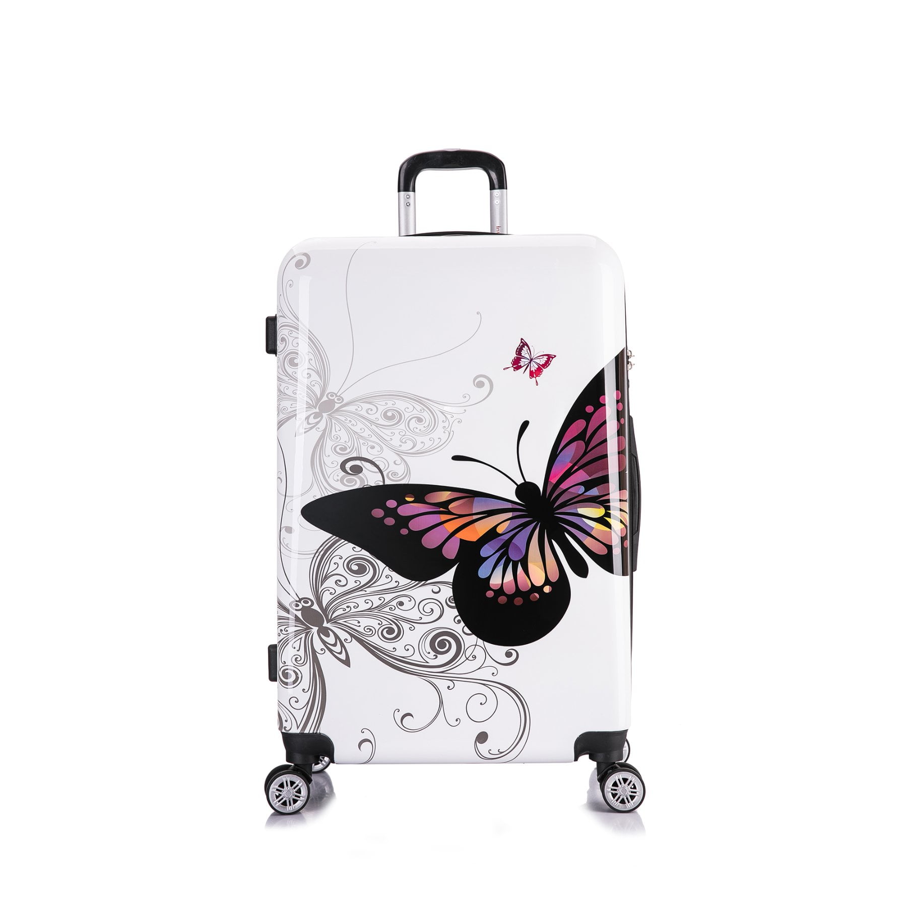 The InUSA Butterfly collection is made of lightweight ABS and PC printed Film engineered material with a polished metallic finish. The sturdy construction offers maximum strength, durability and a water/scratch resistant finish. Smooth gliding oversized zipper. Functional style with 4 airplane design dual spinner multi-directional silent 360 degree wheels for effortless mobility. Full interior fabric lining with a zippered compartment on one side and tie-down straps on the opposite side for easy packing. Also, one inside pocket for your convenience. Integrated 3 digit TSA approved combination lock and push button locking internal retractable trolley system and top and side ergonomic GEL handles for comfortable and easy lifting. This product can be purchased in different colors.