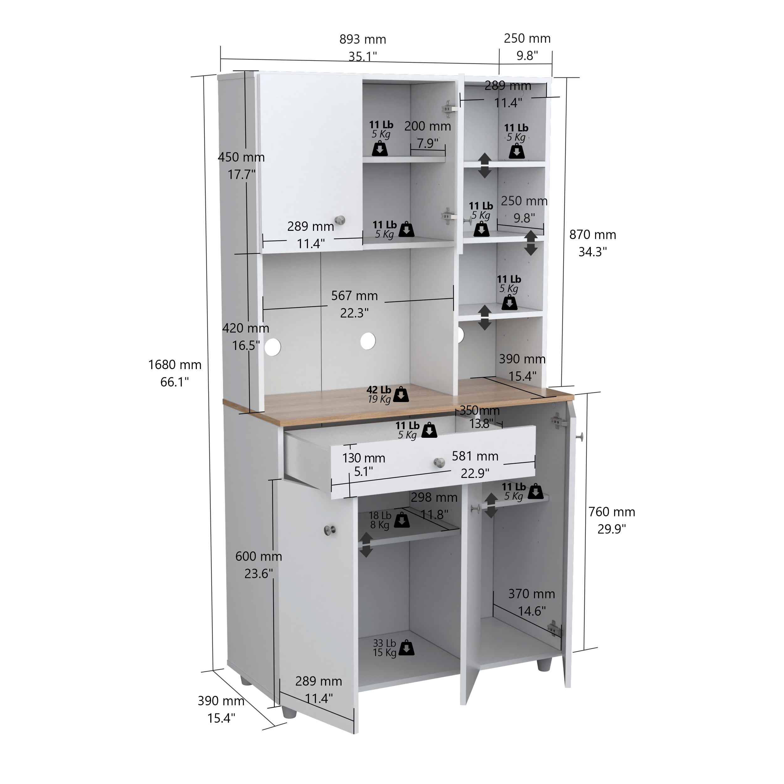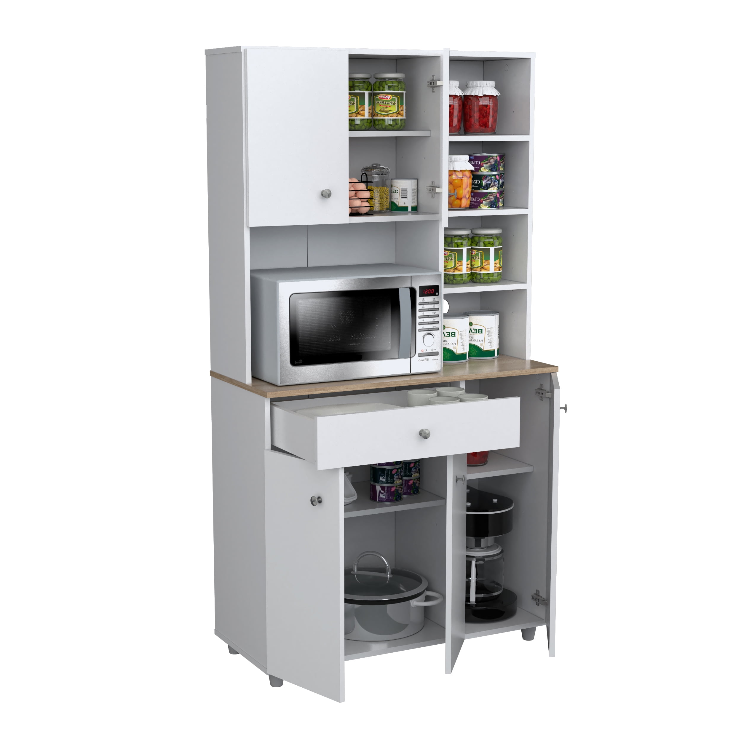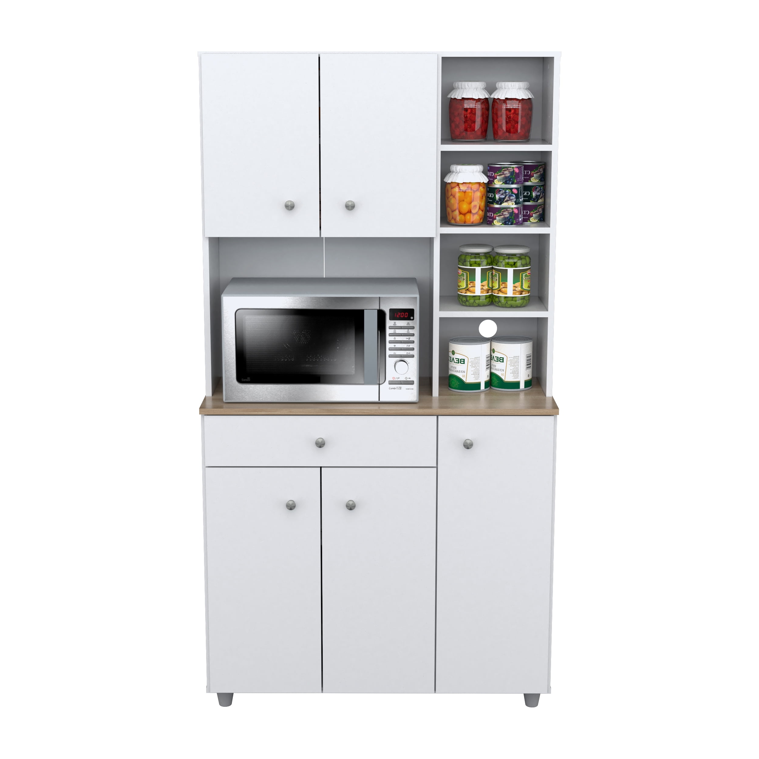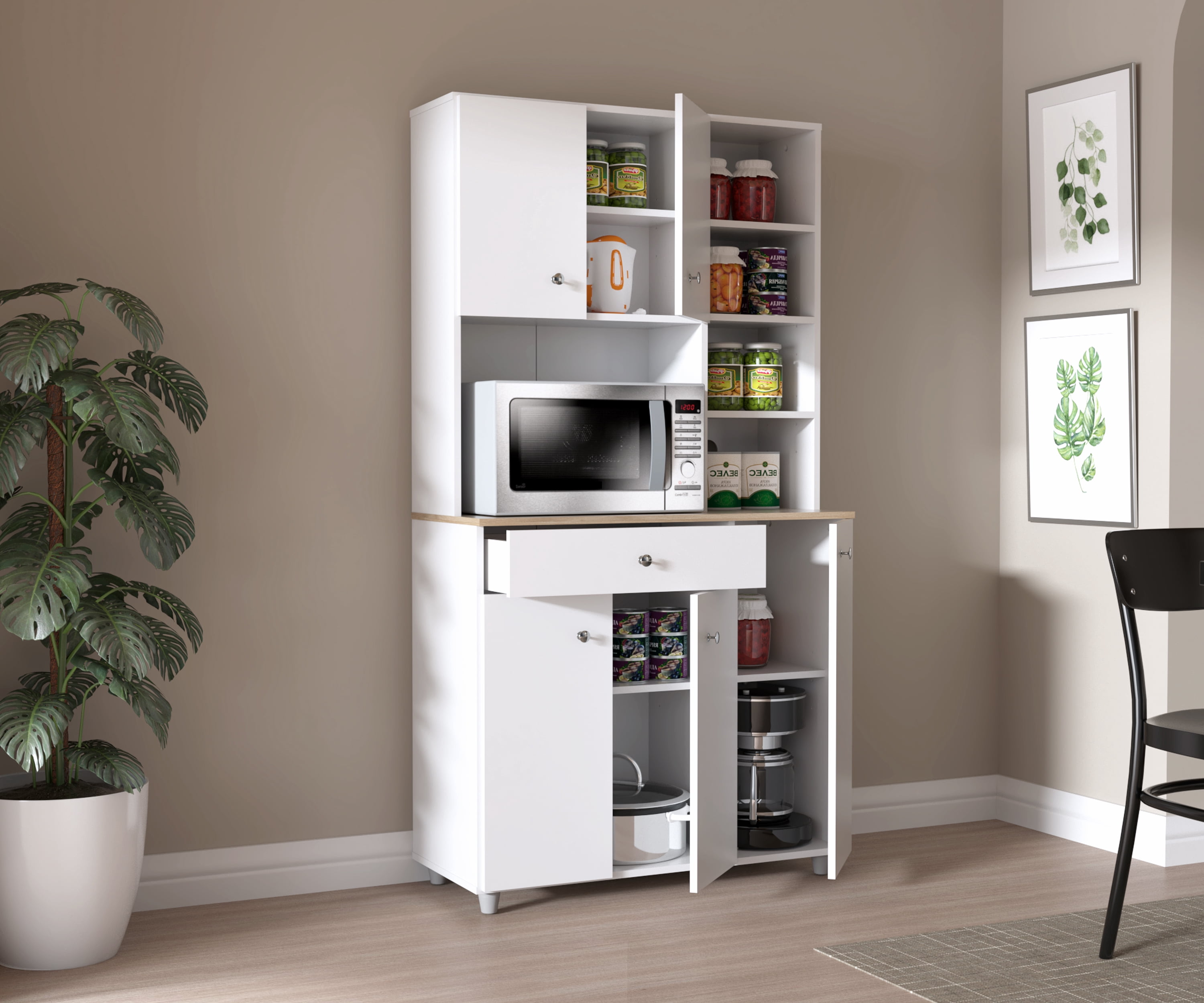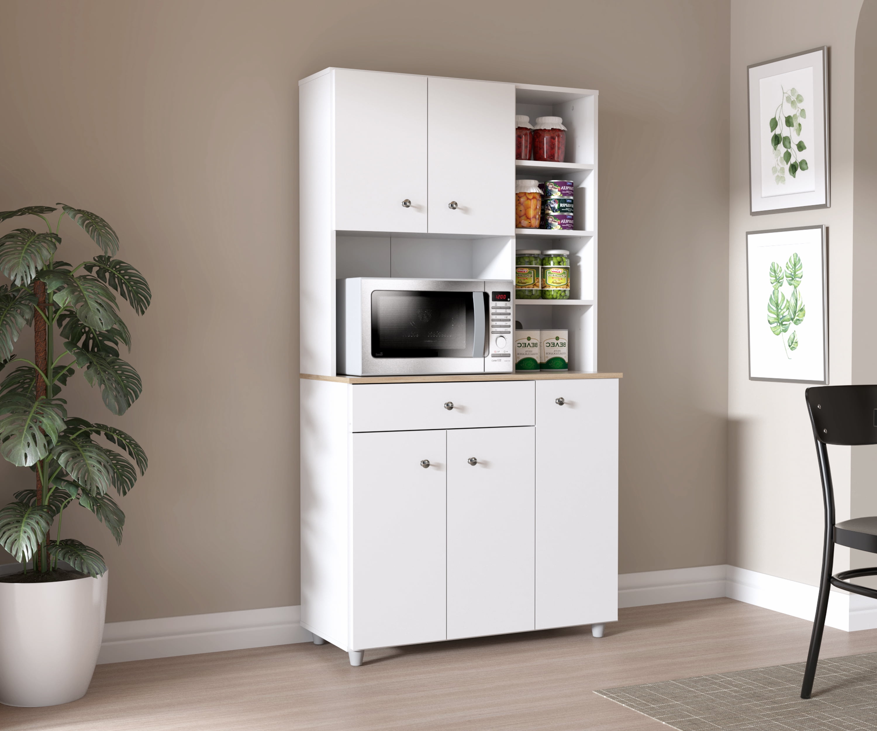 Kitchen Microwave Storage Cabinet brings additional storage and function to your kitchen and dining space Features 10 shelves (5 adjustable) and 1 drawer to store and organize kitchen essentials Microwave shelf measures 16.5”H x 22.3”W x 15.4”D Concealed European door hinges and brushed metal pulls Durable melamine laminate finish in White Engineered wood construction Stain, heat, and scratch-resistant Please see detailed dimensions image for additional information Product Dimensions: 66.1”H x 351”W x 15.5”D Product weight: 104.5 lbs. Two adults recommended for assembly 1-year limited warranty
