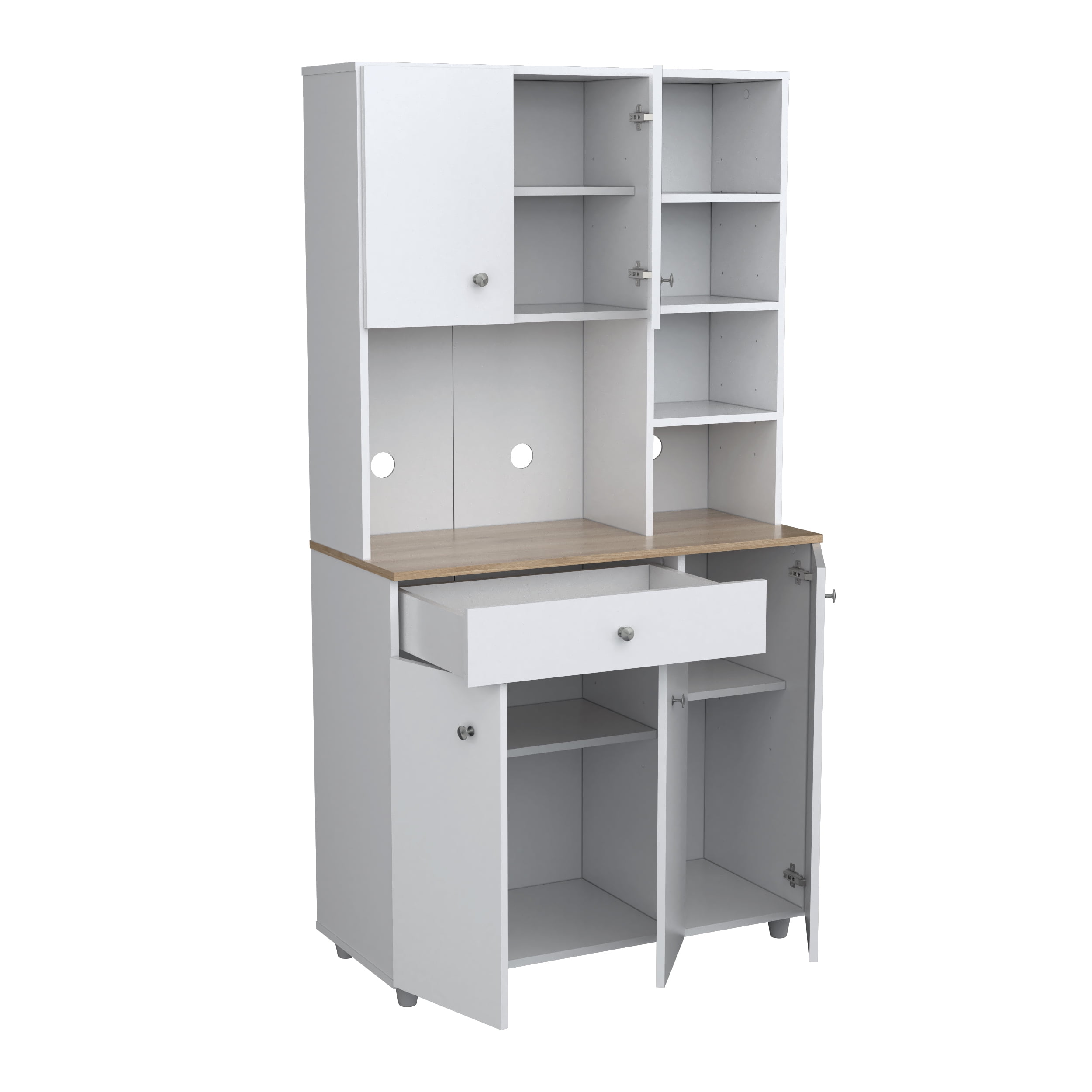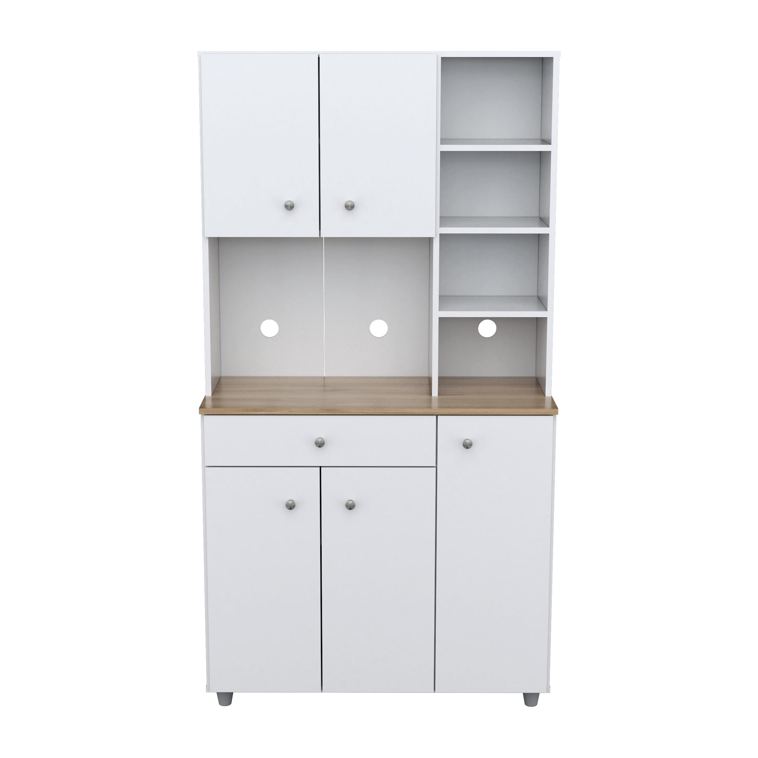 The Kitchen/Microwave Storage Cabinet from Inval is finished in a clean White laminate, crafted with durable melamine that resists stains, heat, and scratches. Constructed from manufactured wood, this cabinet offers ample storage space, including five doors that conceal storage areas and one drawer with metal slides for accessories. The cabinet features ten shelves in total, with five adjustable shelves, and four open shelves for storing kitchen or pantry items. The center shelf/work surface is designed to accommodate a standard-size microwave. For convenience, the back of the unit includes a pass-through opening for easy cable management. All doors are equipped with concealed European hinges, and the doors and drawers are accented with brushed metal pulls. Assembly is required, and a 1-year manufacturer’s warranty is included.