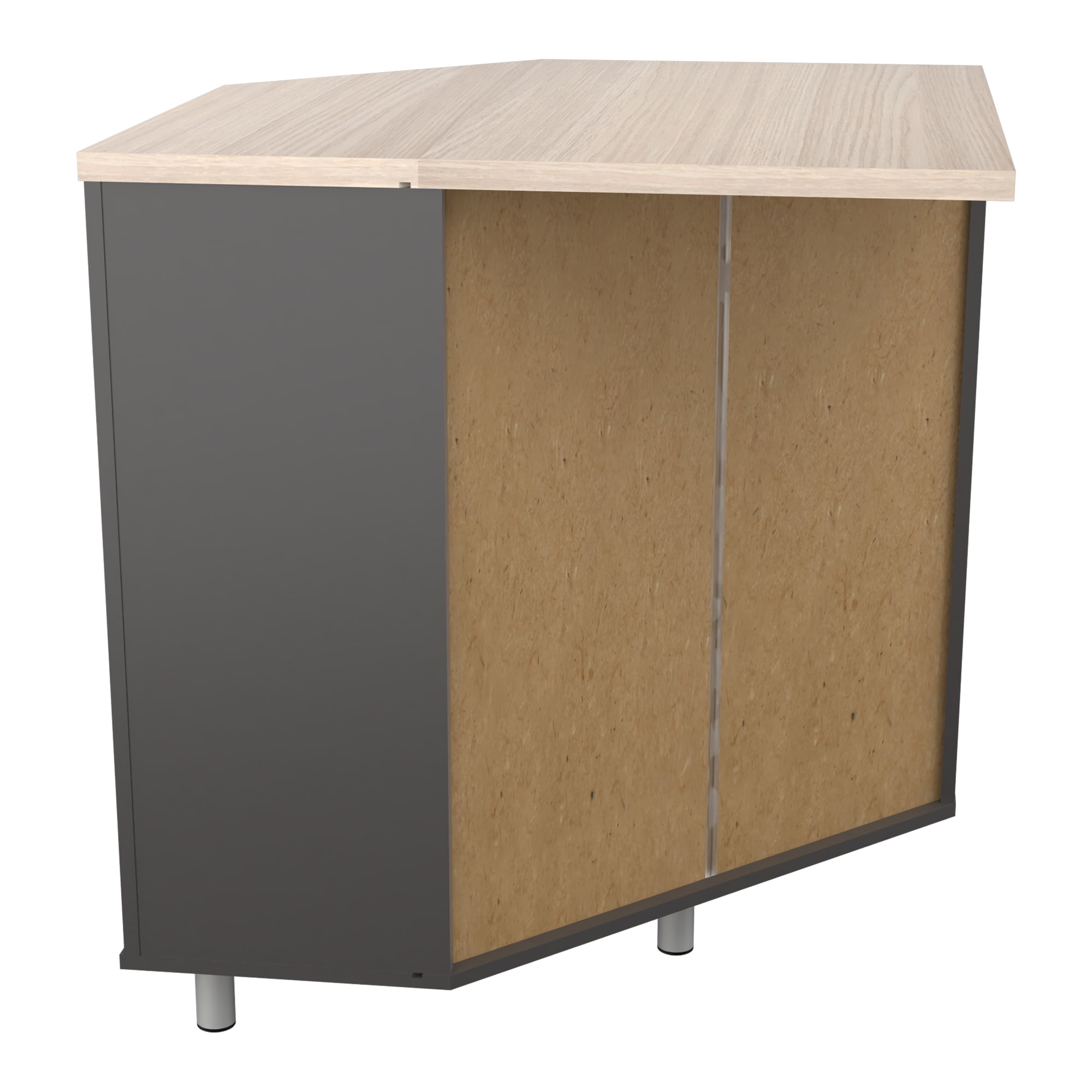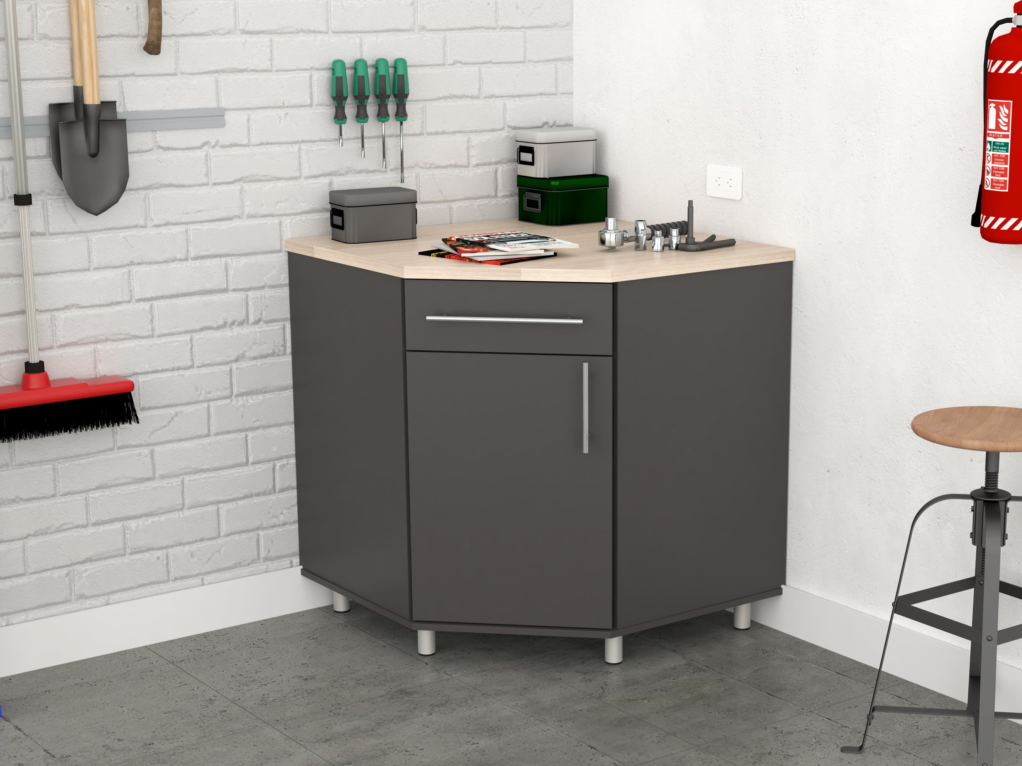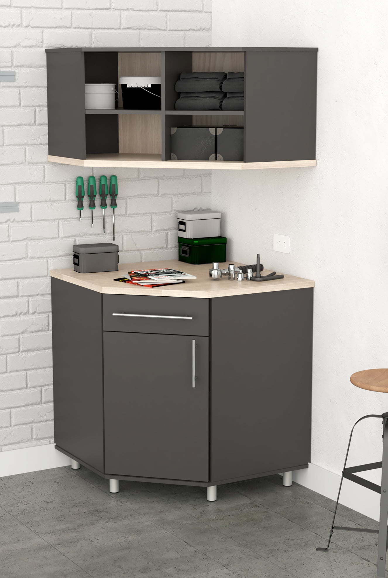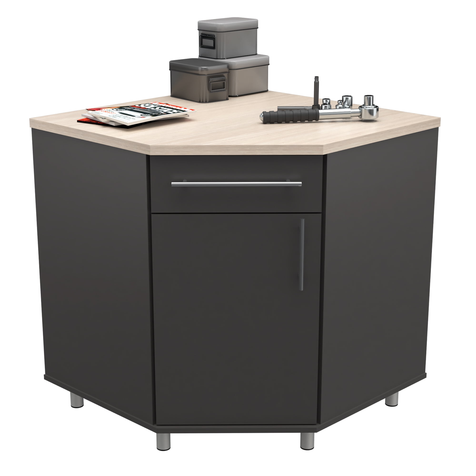 The Kratos Series Garage Corner Storage Cabinet by Inval features a rich Dark Gray/Maple finish. It includes one drawer and one door with concealed European hinges and large brushed metal handles. The concealed storage area has two shelves, ideal for storing tools, cleaning supplies, sporting equipment, or gardening items. This cabinet helps optimize space by fitting snugly into corners, making use of often wasted areas. Its design enhances functionality, keeping your garage organized and clutter-free. Made from manufactured wood laminated on both sides with durable, stain, heat, and scratch-resistant melamine, this cabinet is built to last. Assembly is required.