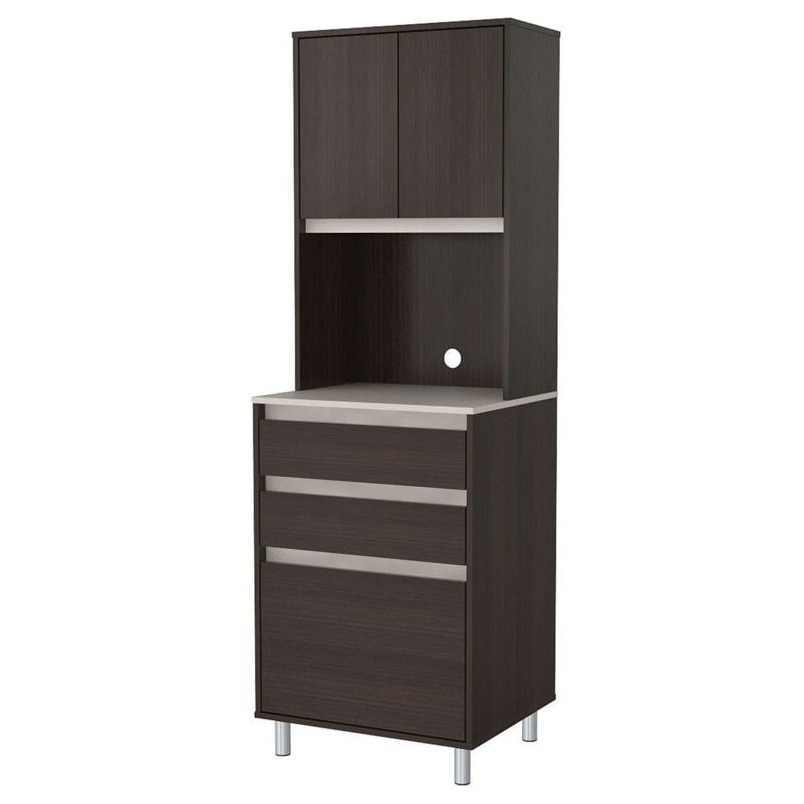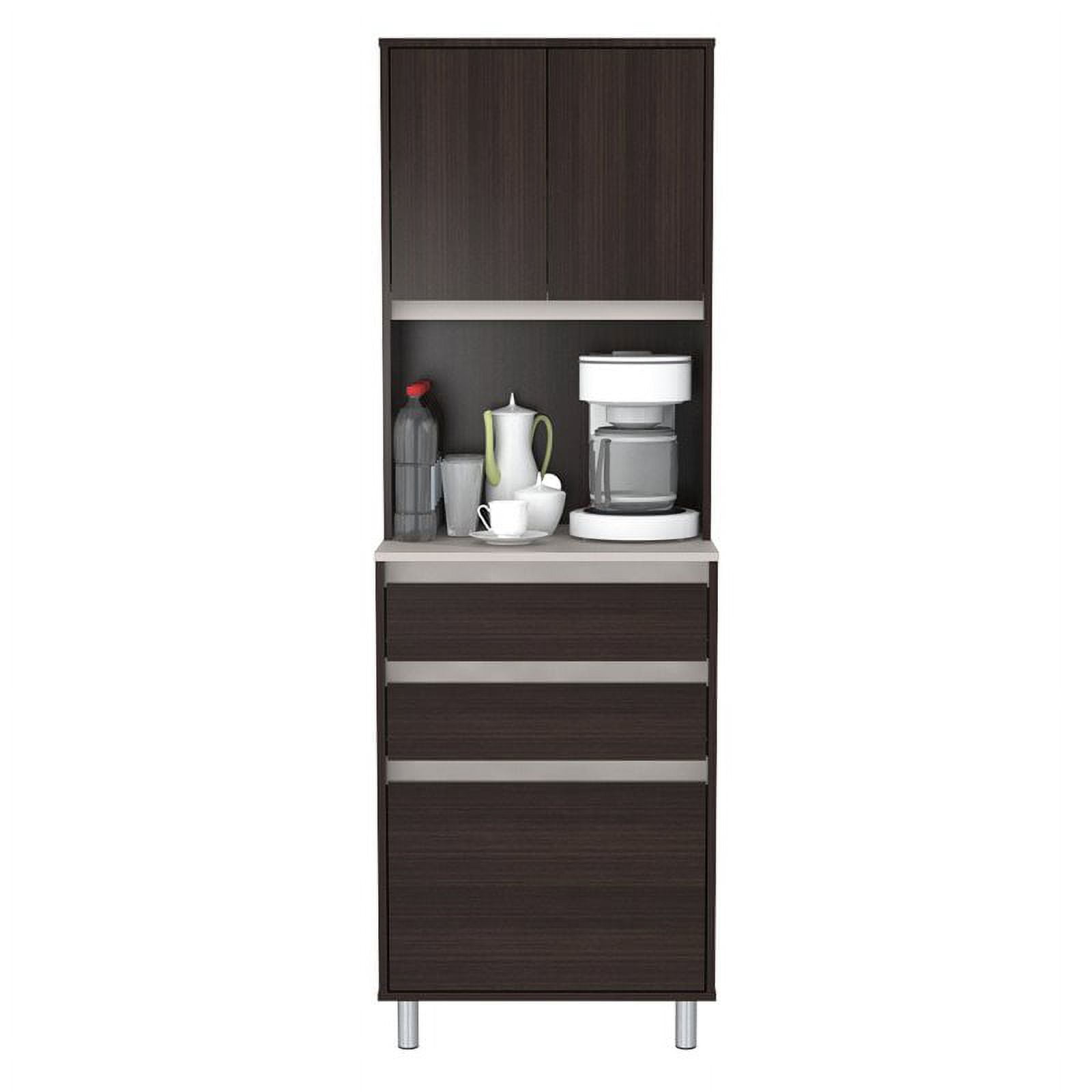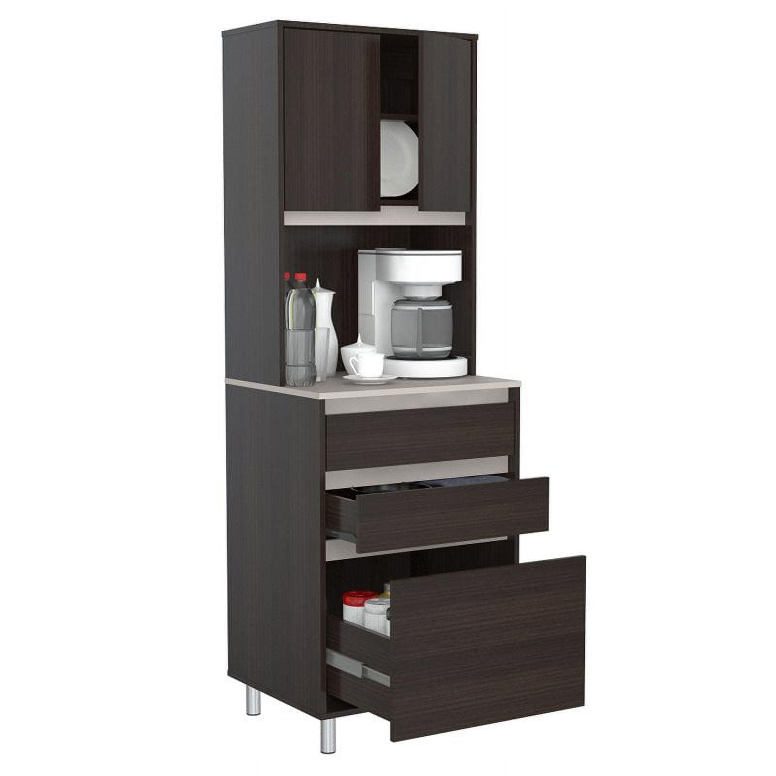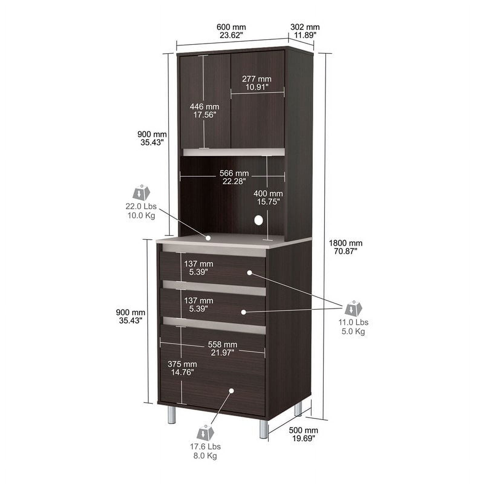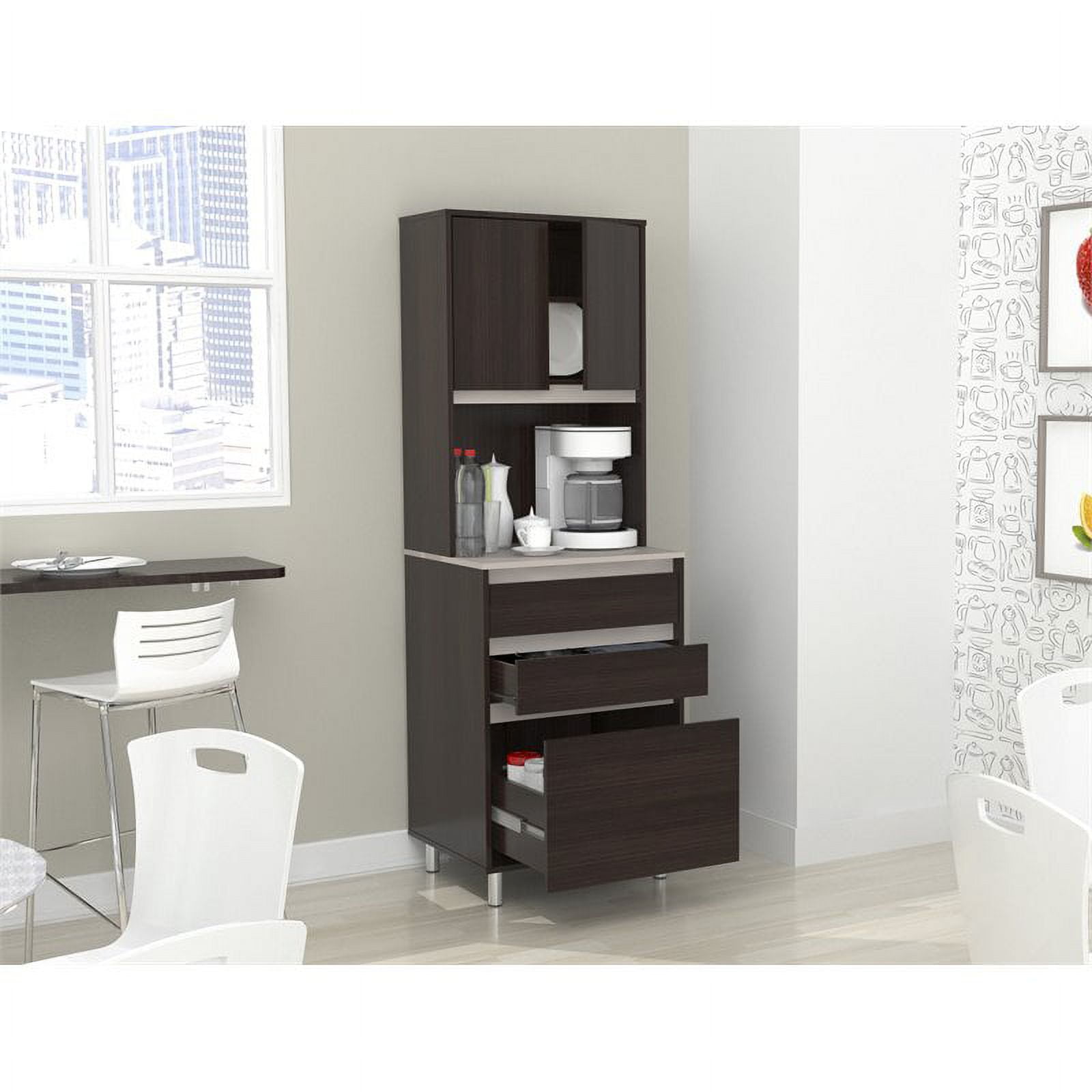 AMBROSSIA? Breakroom Cabinet by Inval® finished in rich ?Espresso and Amber Grey? laminates in durable melamine which is stain, heat and scratch resistant. Constructed from manufactured wood and features a functional modern design that is an excellent choice for your home or office break room. It includes two (2) top doors with adjustable shelves featuring concealed European hinges, one (1) large and two (2) smaller bottom drawers featuring metal drawer glides. This unit is ideal for easy storage of all your breakroom needs. The large work area with the convenient pass-through cable is ideal for your appliances. It is also conveniently equipped with adjustable, easy to level feet. Anti-tip hardware is included. Assembly is required.