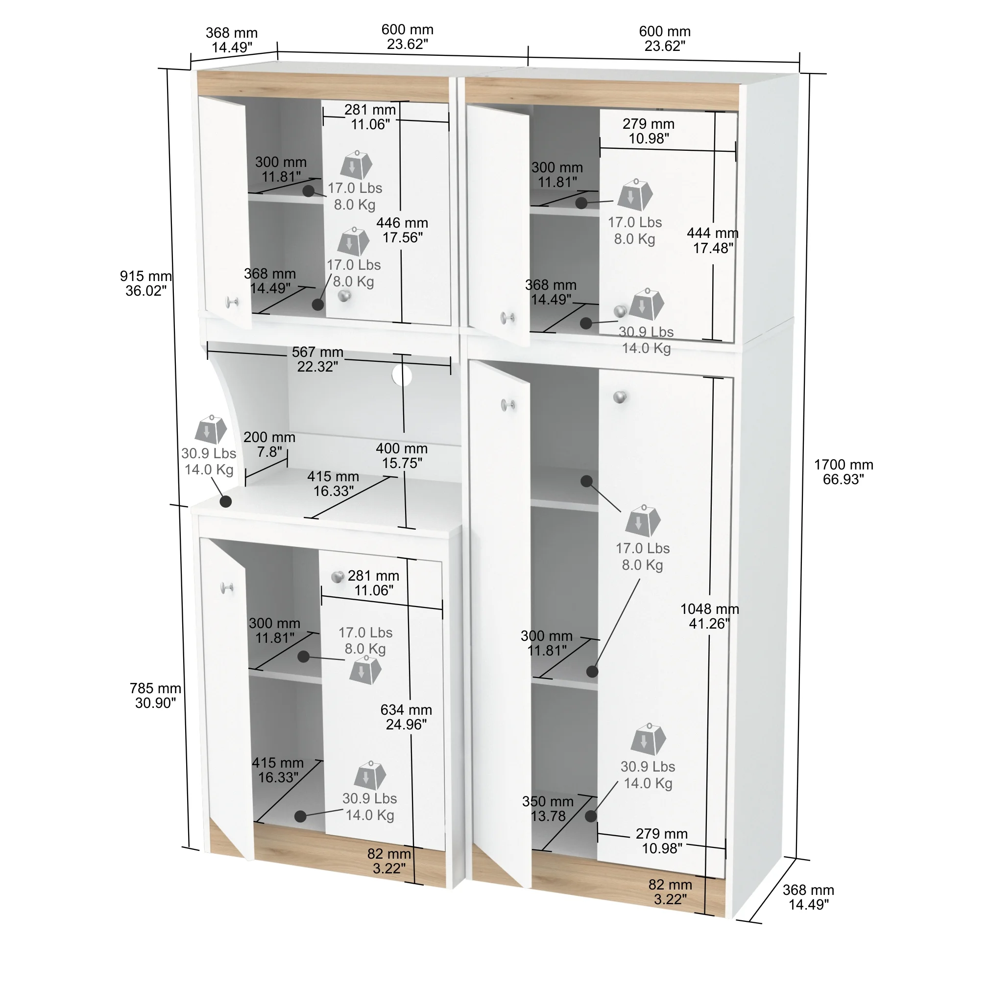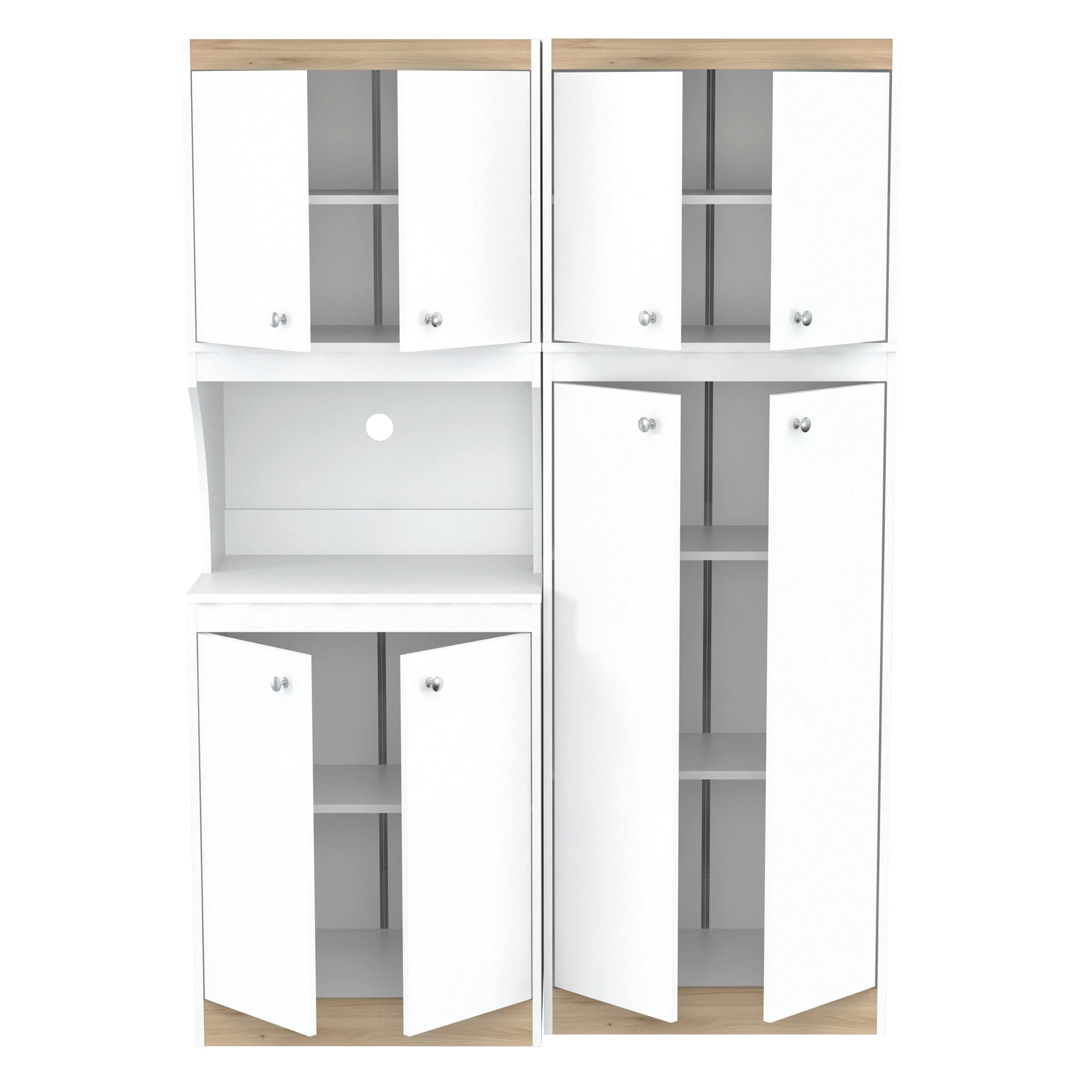 Includes two (2) cabinets Open storage compartment ideal for a microwave or other small appliance Features European style hinges and brushed metal knobs Large work area with a convenient cable pass-through Engineered wood and melamine laminate construction Durable White and Vienes Oak finish Two people recommended for assembly Overall product weight: 164.73 lbs. Overall product dimensions: 66.93″H x 23.62″W x 14.49″D Complete your space with other items from the Inval Kratos collection 1-year limited warranty Assembly required