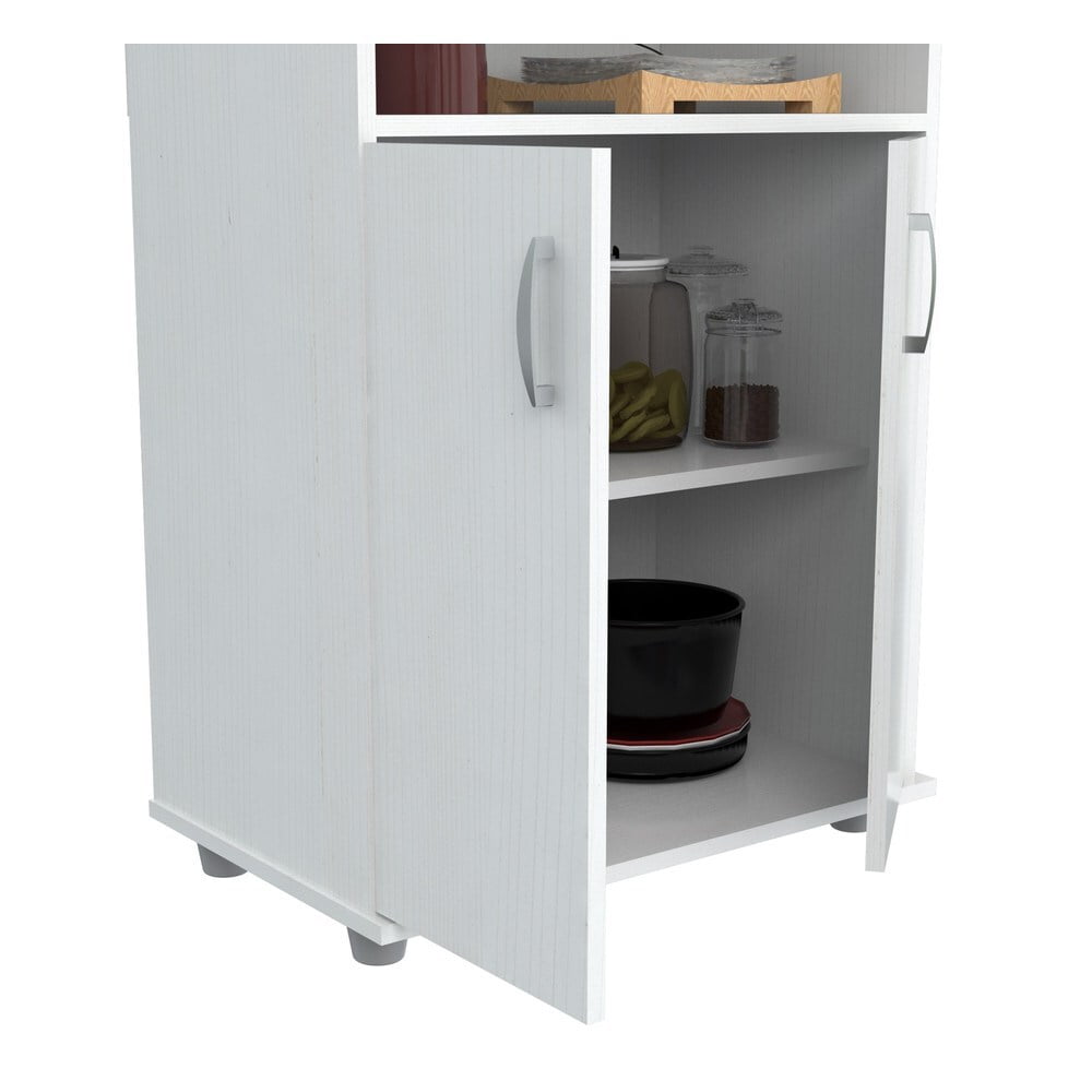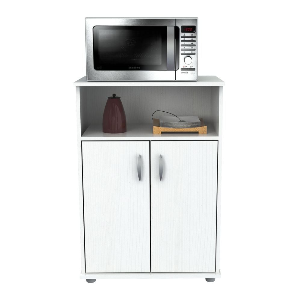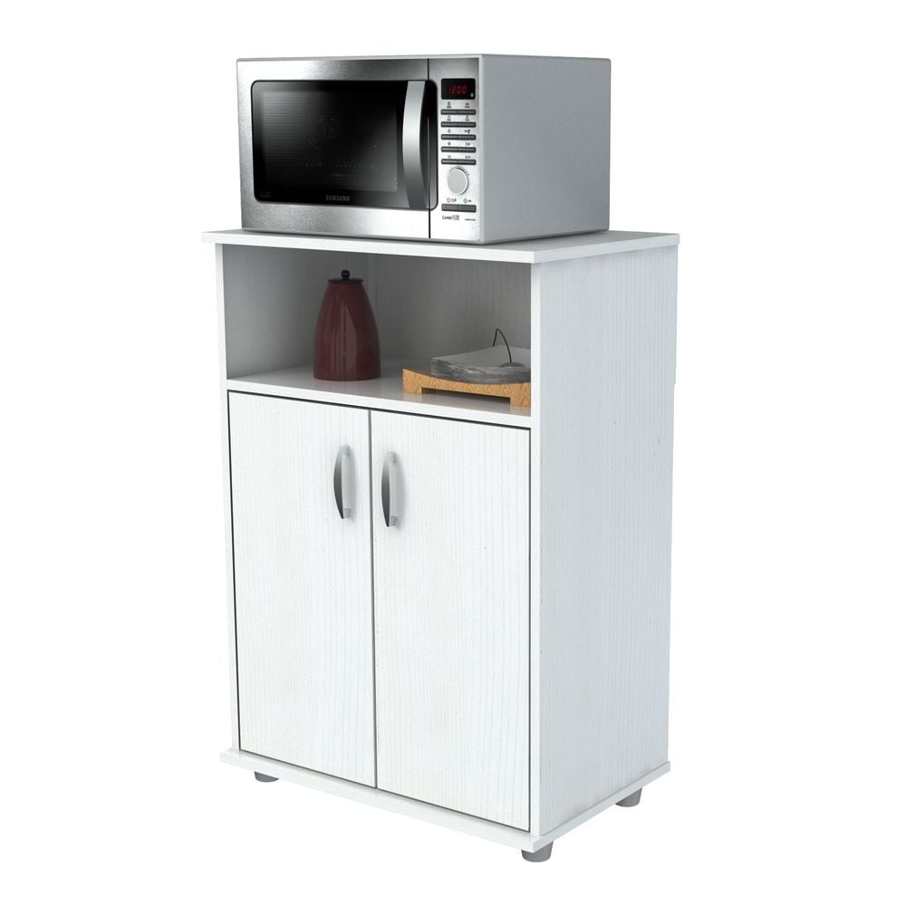 Create extra storage space with the functional Inval Kitchen Cart. Finished in larcinia white, this cabinet will complement any decor. Featuring closed door storage and a shelf to house your microwave, this cabinet is the perfect solution to any kitchen organizational needs.