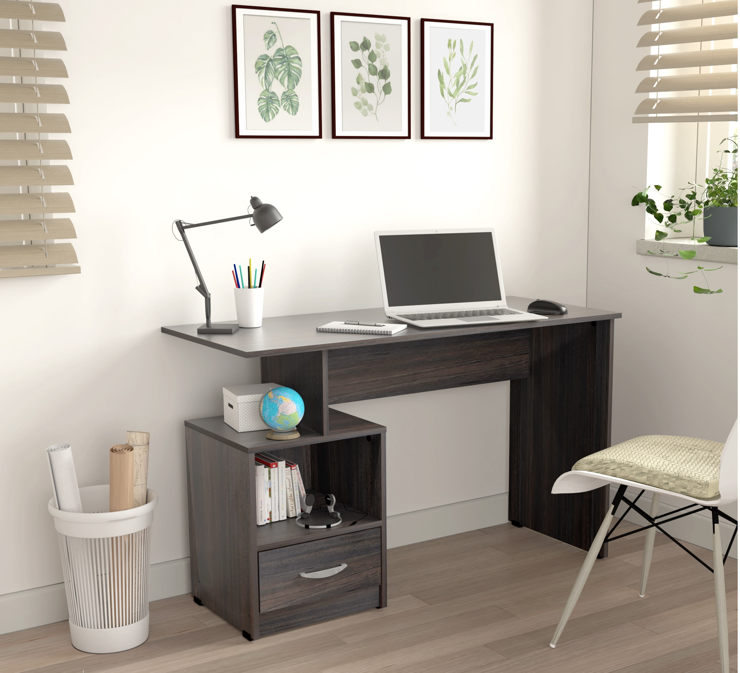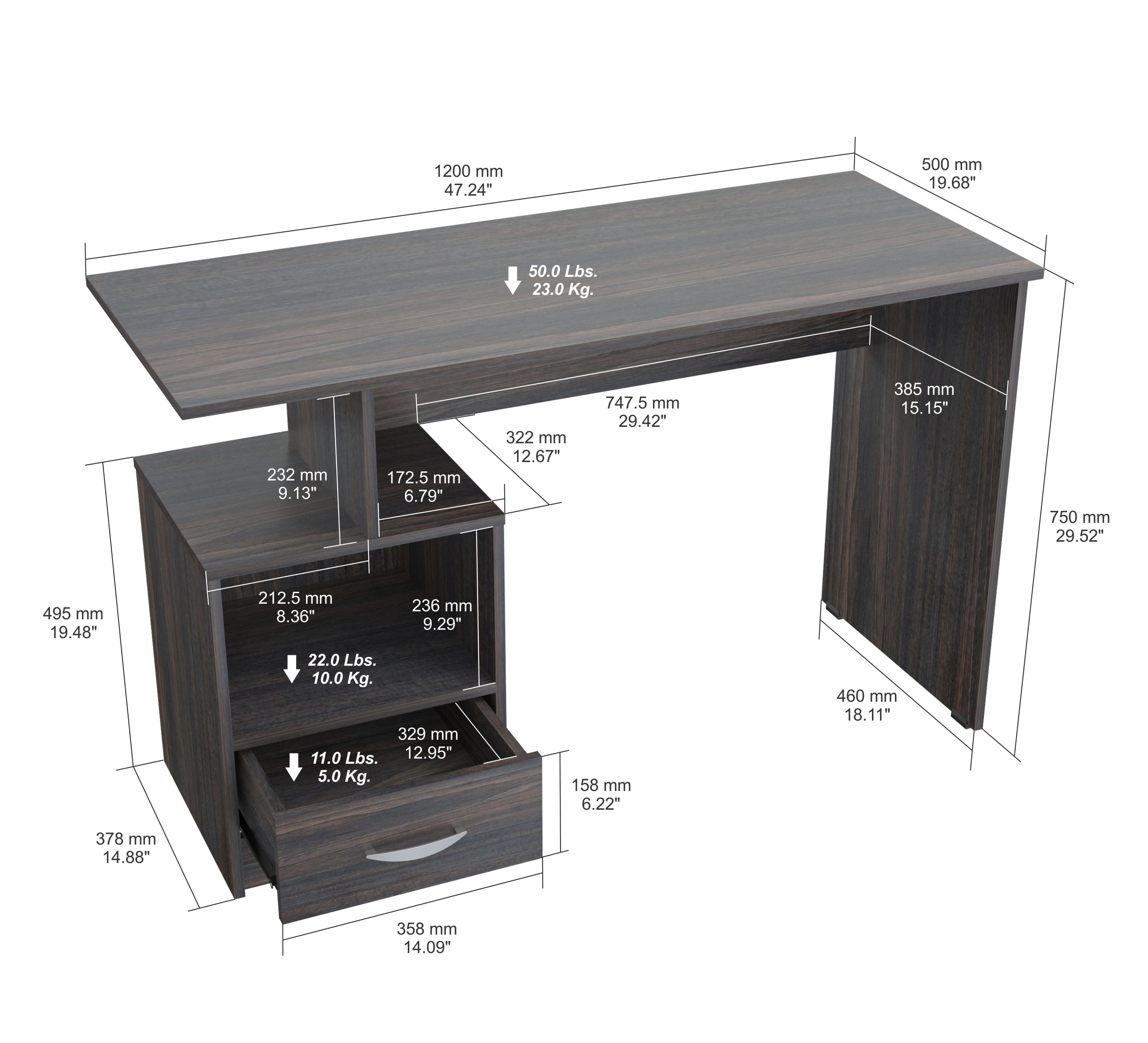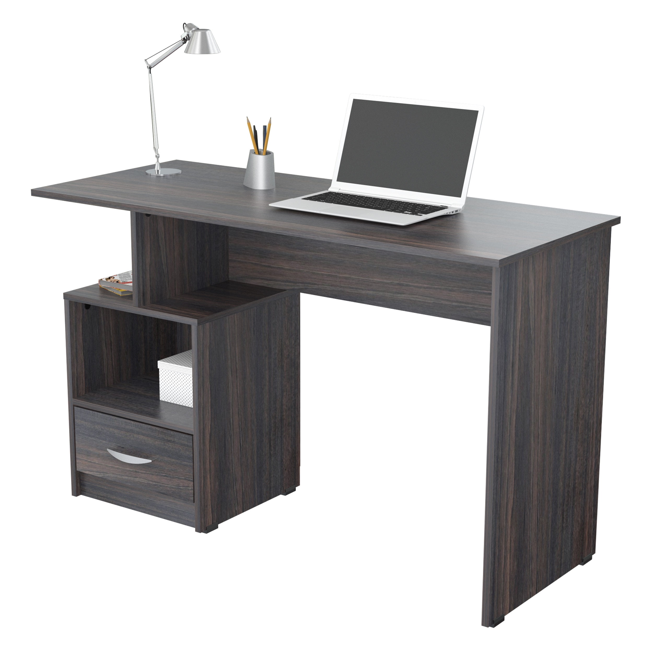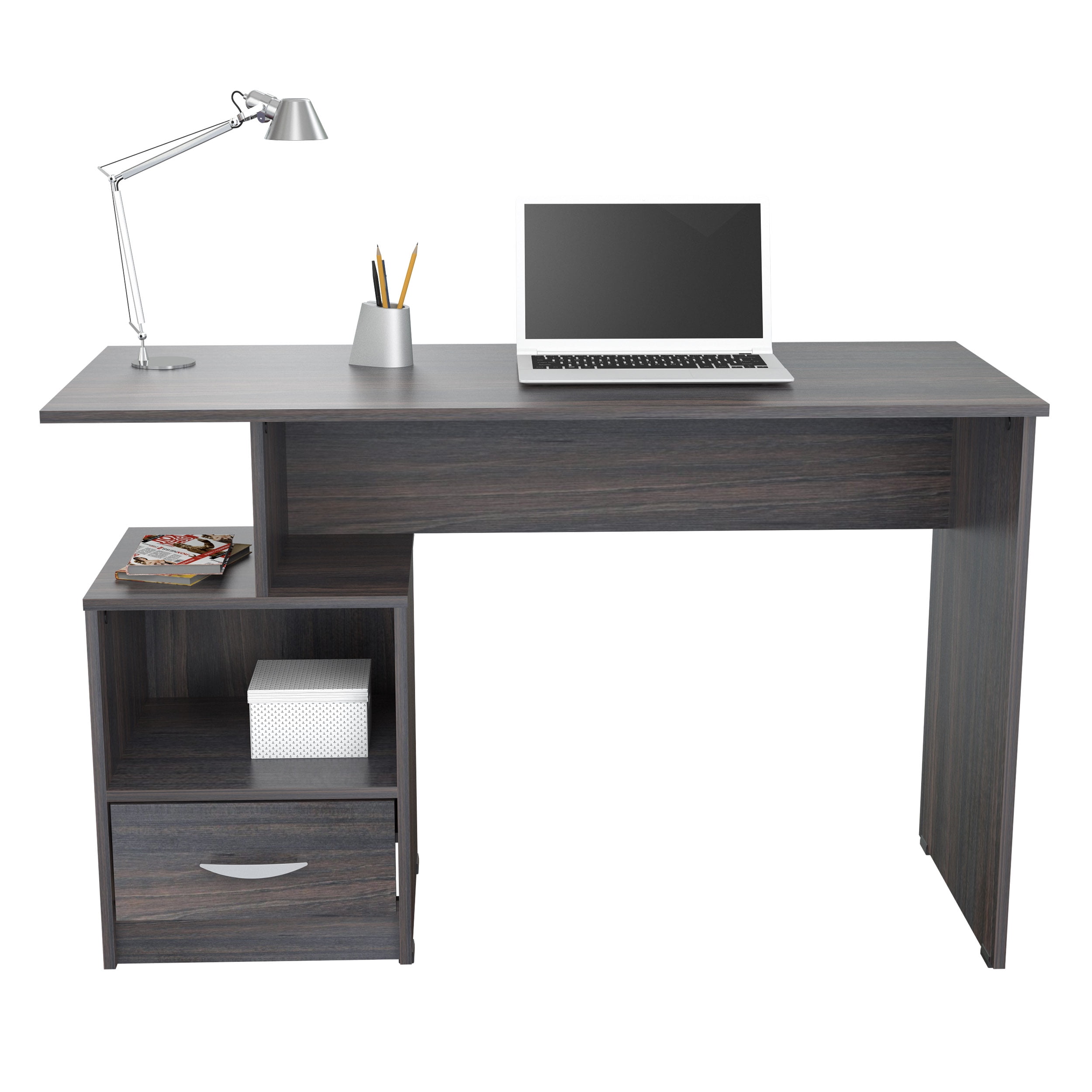 Inval Modern Writing Desk with Drawer and Open Storage, Espresso Writing desk offers a spacious work surface and additional storage Durable melamine laminate finish Engineered wood construction Stain, heat, and scratch resistant Ample shelf space for office essentials Convenient drawer for additional storage 5-year limited warranty Product weight: 49.2 lbs. Package dimensions:3.7”H x 52.8”W 25.6”D Overall dimensions: 29.5″H x 47.2″W 19.7″D Assembly required