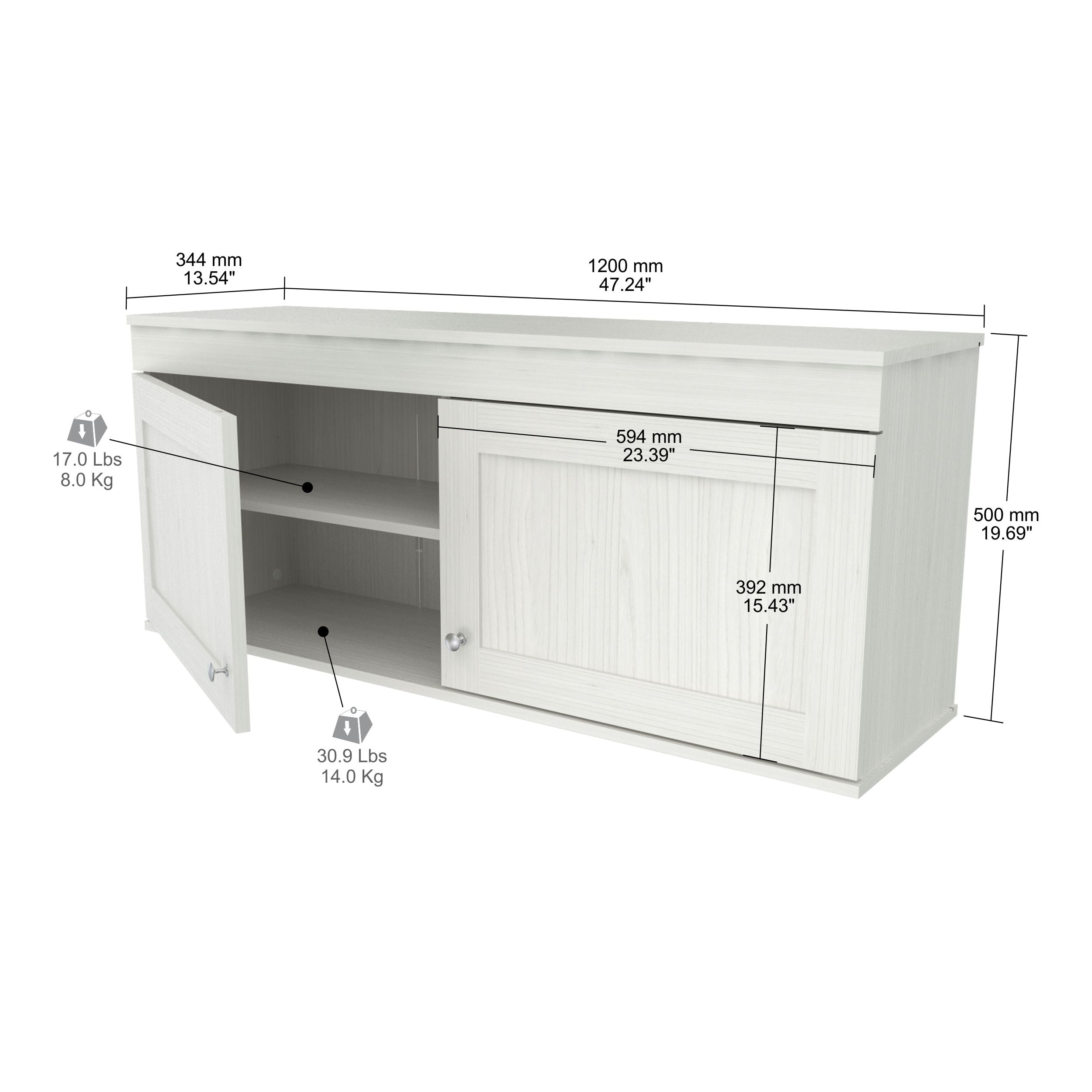 Upper cabinet includes two (2) doors featuring European-style concealed hinges and embellished with brushed metal knobs Interior adjustable shelf offers ample storage space Manufactured wood and melamine laminate construction Washed Oak finish Complete your space with other pieces from the Inval Shaker Collection Dimensions: 13.54″ D x 47.24″ W x 19.69″ H Product weight: 54.32 lbs. Two adults recommended for assembly 1-year limited warranty
