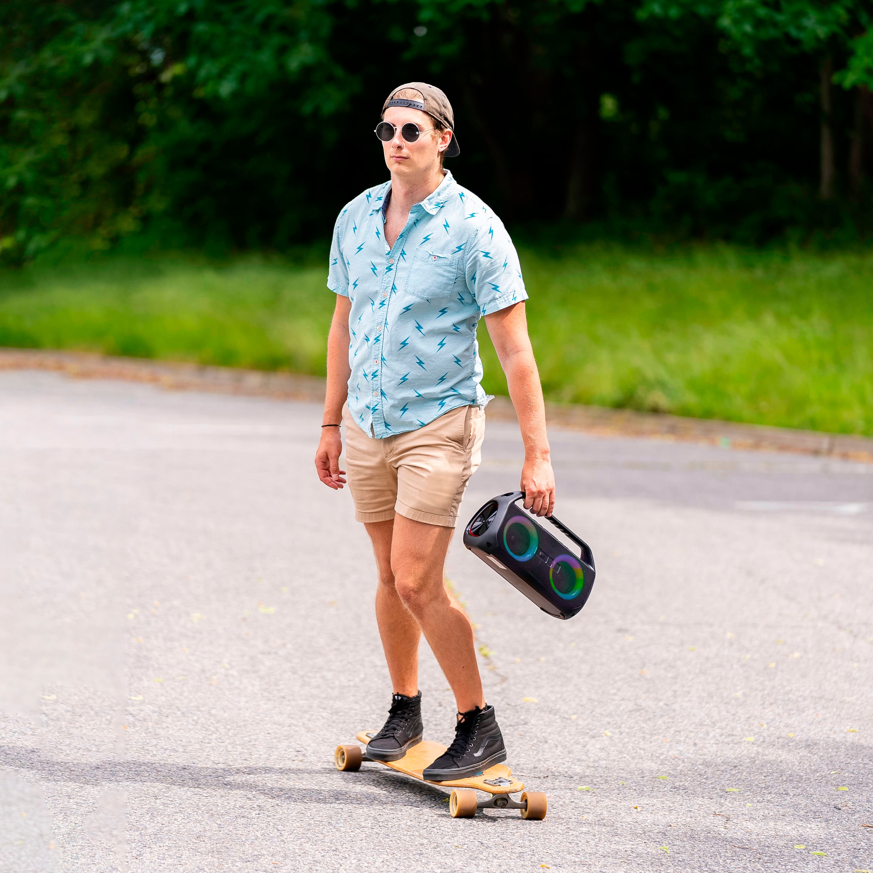 ION’s new Uber Boom Ultra Bluetooth-enabled boombox speaker is perfect for on the go, rain or shine. If you are looking for an outdoor speaker with lights that can go anywhere, then you have found it! Whether you are playing basketball, skateboarding in the park, hanging at the beach, or caught in a rainstorm while camping, you want your favorite music with you. The Uber Boom Ultra is a water-resistant high-power portable boombox that streams music wirelessly from any Bluetooth-enabled device. This 80-Watt Bluetooth-enabled boombox speaker is rated IP66, so it is water-resistant and sandproof, which makes it safe for beach, trail and rain! With its Multi-Color Lighting, the woofer glows in multiple colors and dances to the beat. Plus, there is a Bass Boost feature when you want to kick up the bass for maximum sound impact. Even outdoors, this portable boombox speaker will put the ‘boom boom’ into your music! Do not let size fool you. The Uber Boom Ultra Bluetooth-enabled boombox speaker packs a powerful built-in rechargeable battery. The battery provides up to 12 hours of use on a single charge and can be recharged through any USB outlet including power banks, laptops, wall outlets, etc. Plus, Uber Boom Ultra has a USB/SD Card Playback feature so you can conveniently play material recorded on other devices. When you want to turn the party up, there is also a 1/4″ Microphone Input to connect your mic for endless fun. Download the ION Sound XP app and take total control of your new Bluetooth-enabled boombox speaker’s audio and lighting functions. Uber Boom Ultra also provides hands-free call answering with the Built-In Microphone so you never have to take your phone away.