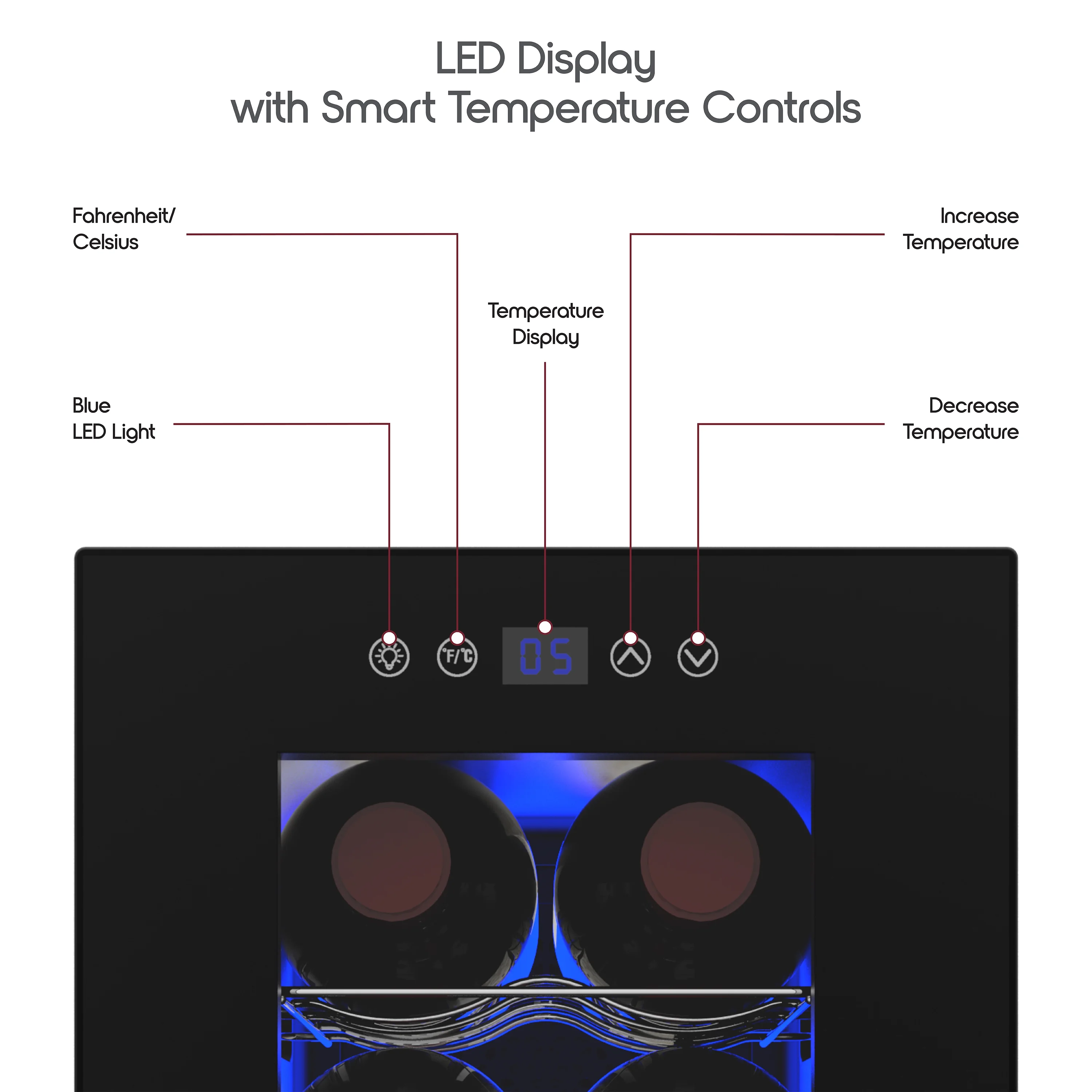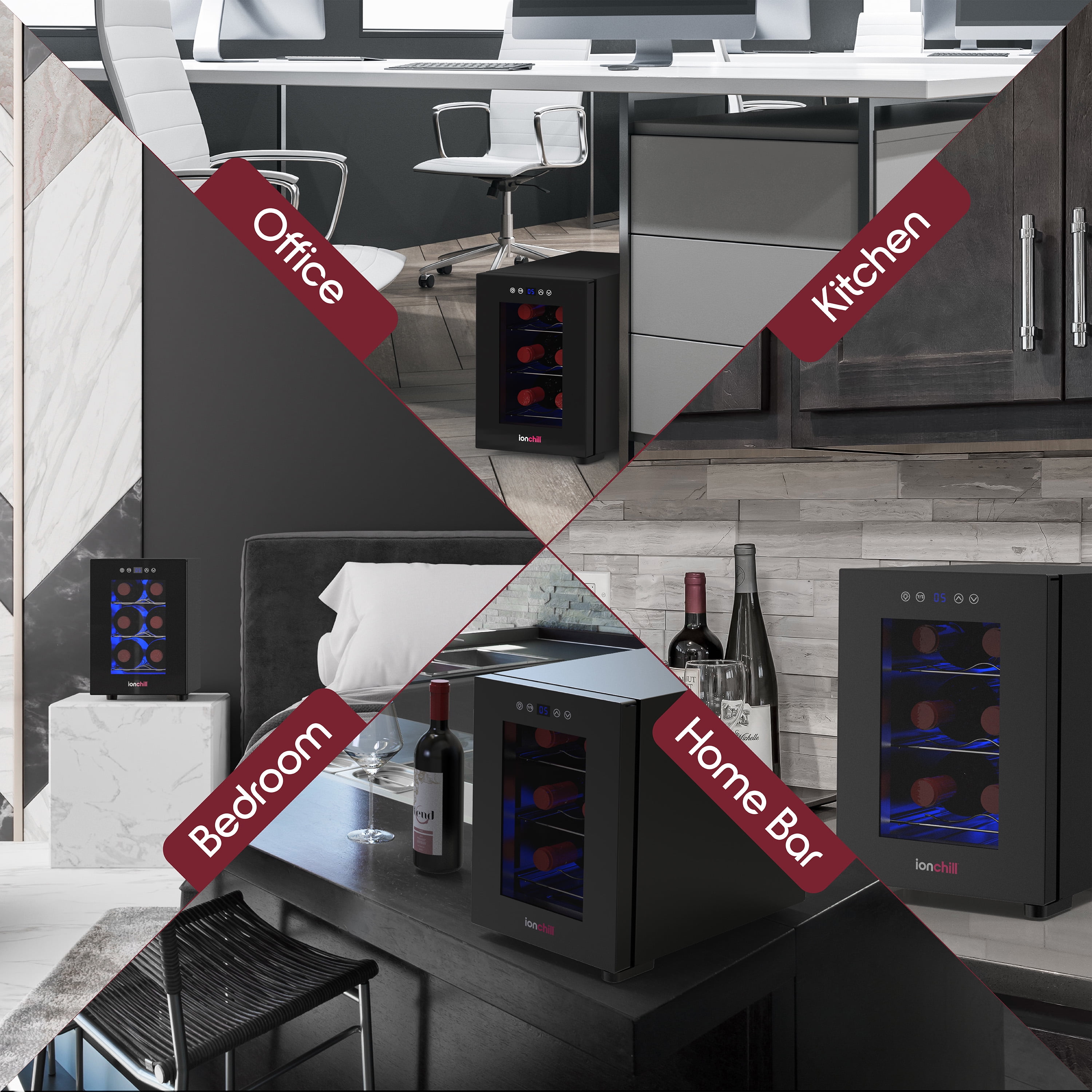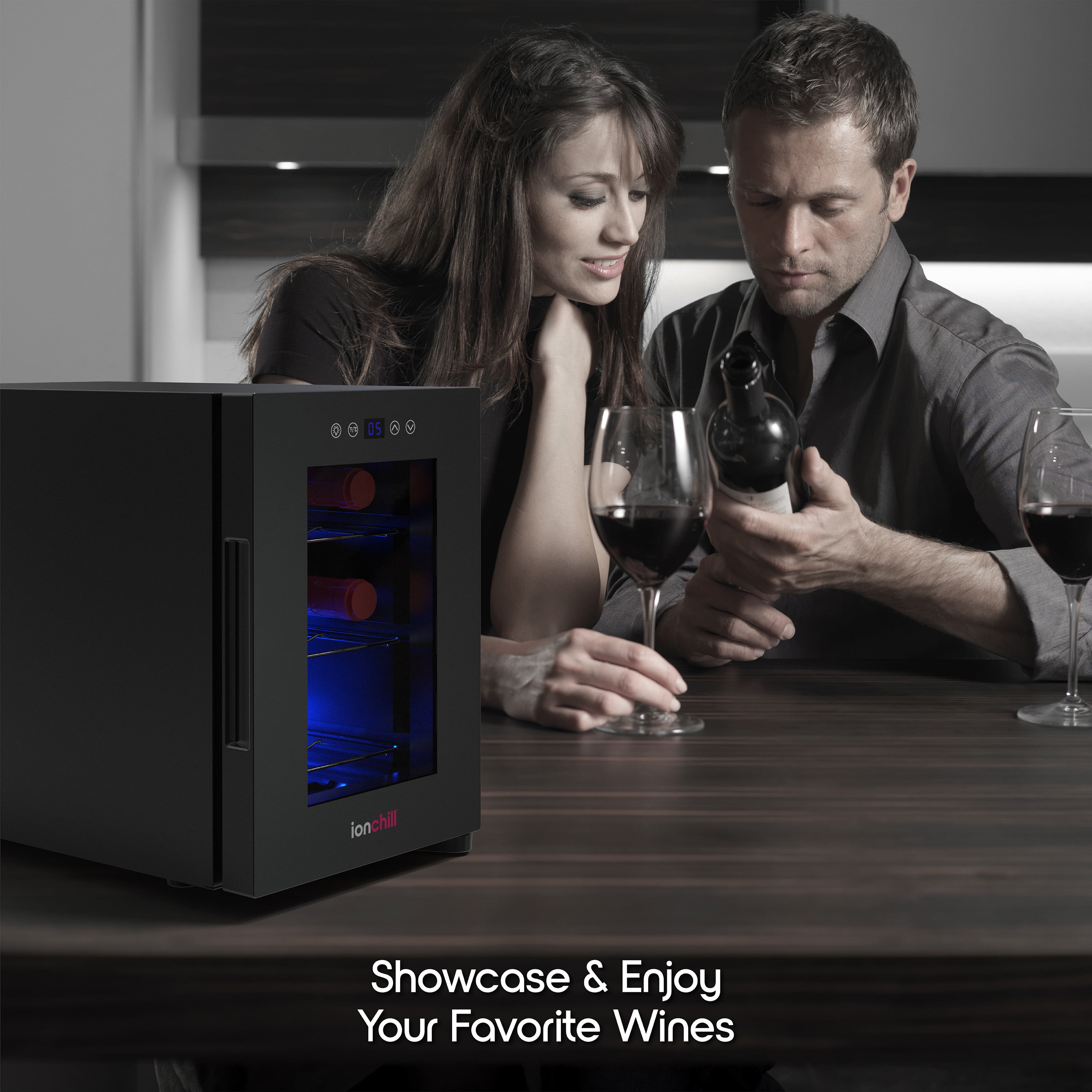 New Ionchill Wine Cooler Beverage Refrigerator with 6-bottle capacity LED smart display with Fahrenheit and Celsius temperature controls Soft blue LED interior lighting that showcases your bottles without damaging the wine Spacious interior with a space-saving exterior design at 17.66 x 9.76 x 14.43 in. Ideal temperature for red and white wine; fits most wine bottles (excluding champagne bottles) Specs: Input – 12V/5A; Power – 60W (Max); Capacity – 6 750mL wine bottles; Temperature Range – 53-65°F (12-18°C)