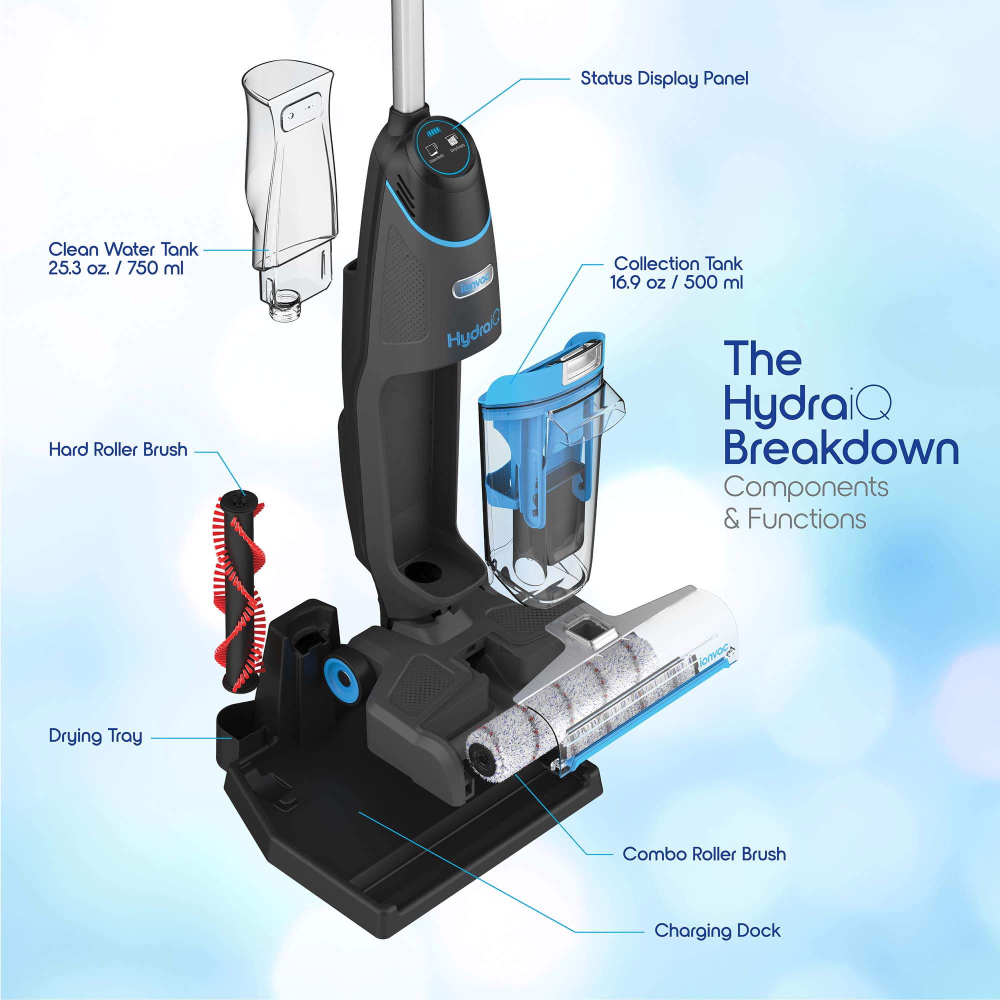 Rechargeable Power: Charging station keeps the new HydraiQ upright vacuum cleaner powered and ready to go. A full charge only takes 3-4 hours and grants you up to 30 minutes of cleaning time! Two Cleaning Modes: Features 2 easily interchangeable brush options: A combo roller brush for hard floor and carpet, as well as a hard roller brush specifically for carpet. Hold extra brushes not in use right on the charging base! Dual Large Water Tanks: Clean water tank (750ml) and dirty water tank (500ml) keep cleaning solution separate from collected dirt and debris. Cordless Convenience: Move from room to room in seamless fashion! Self-Cleaning: Hands free self-cleaning technology flushes out dirt and debris from brush and rube with the touch of a button. Stay in the Know: Status display panel indicates battery life and tank levels. Get Cleaning Right Away: Multi-surface cleaning formula included. Model no. 8064