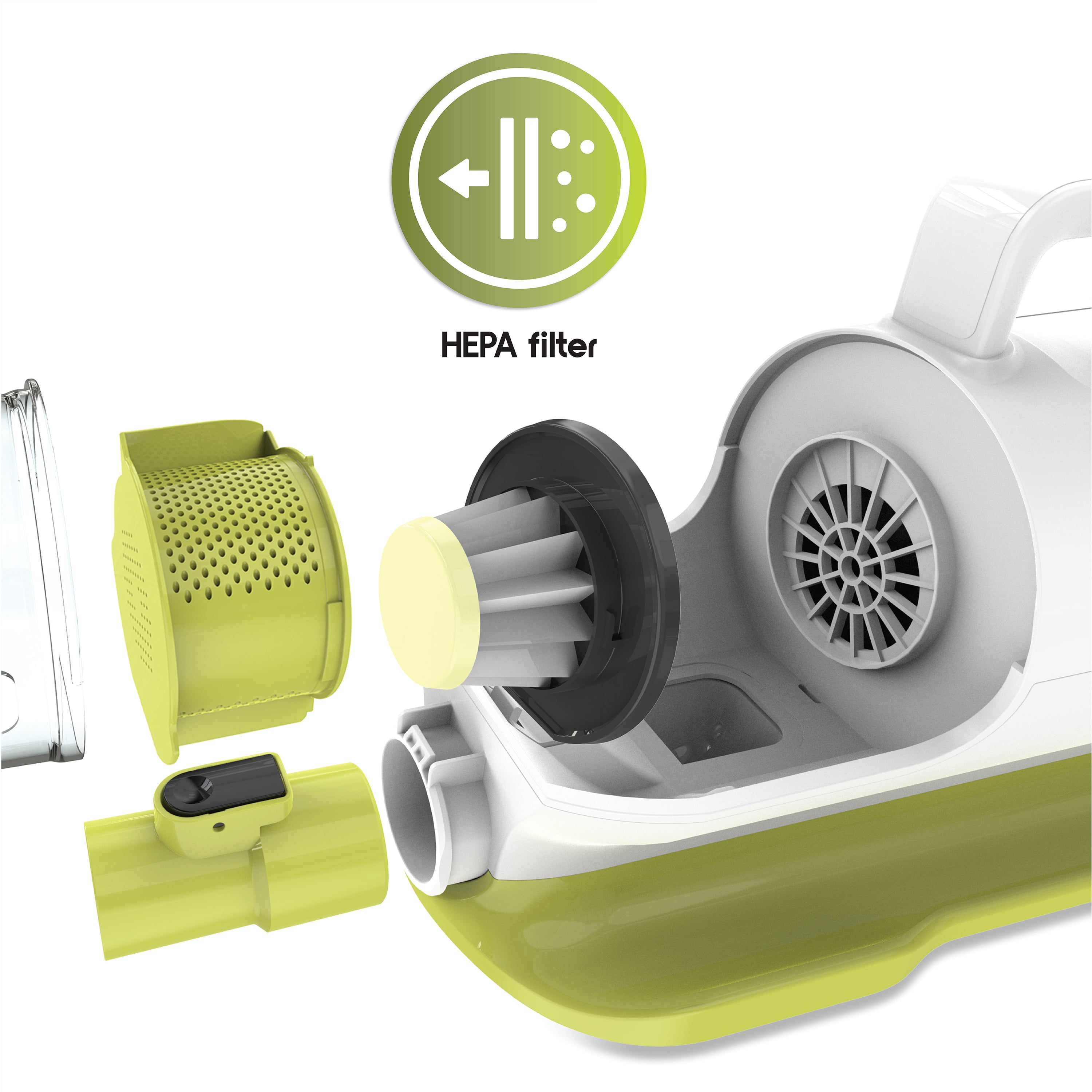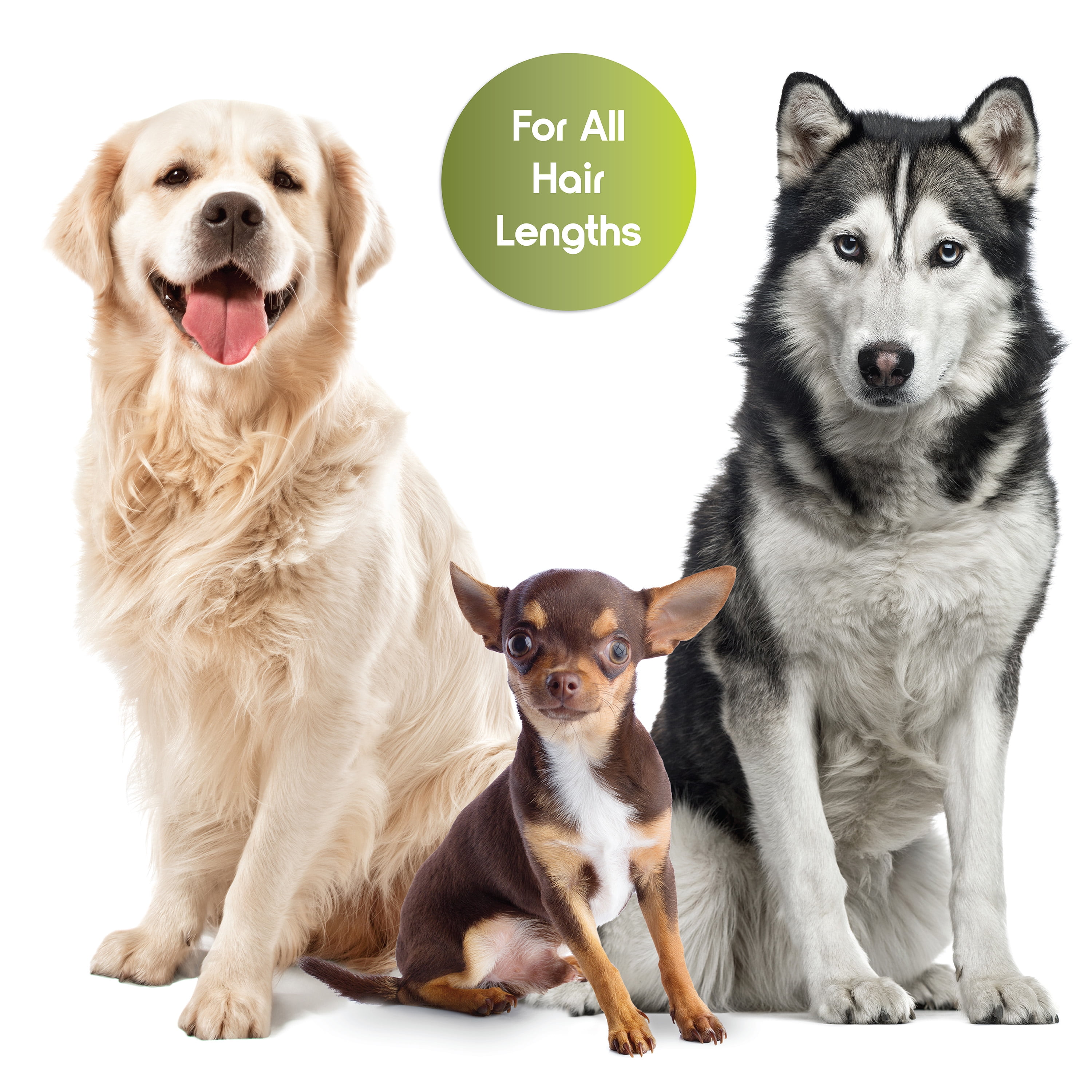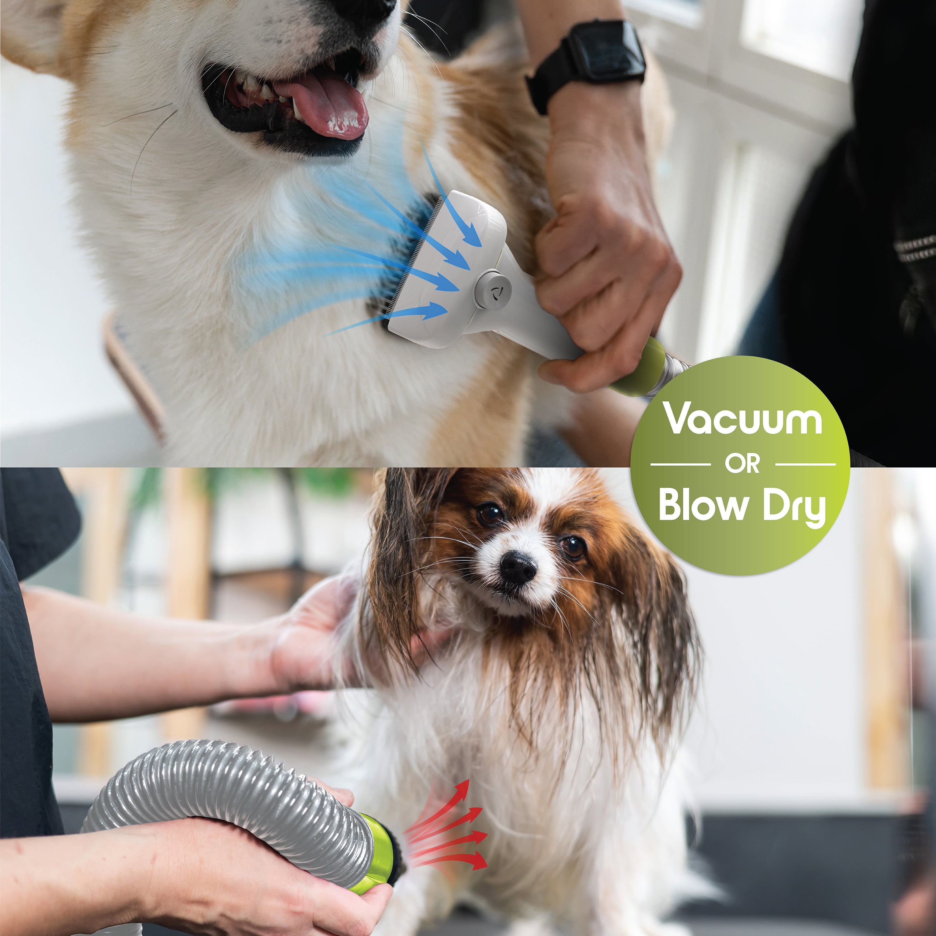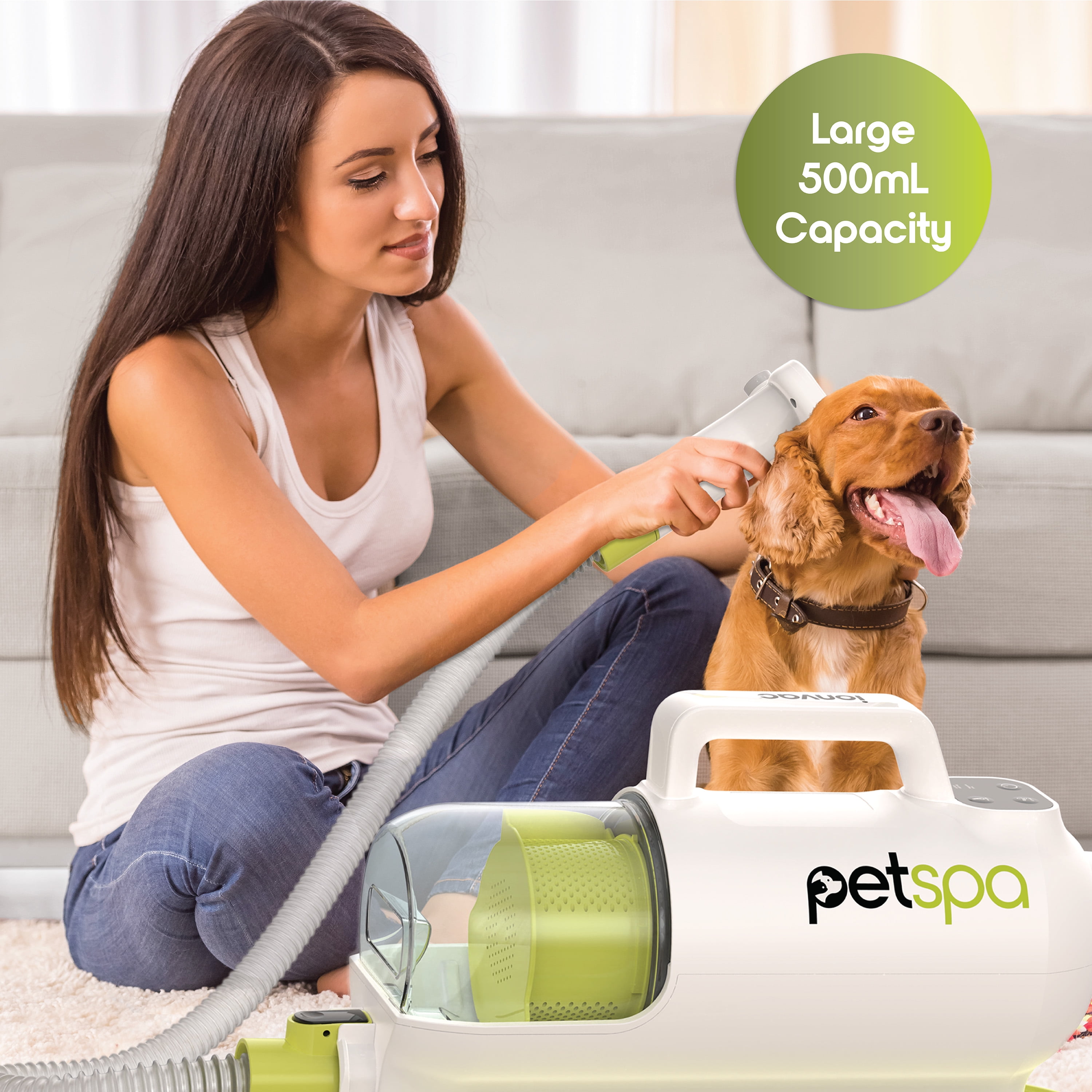 2-in-1 USB-rechargeable air blower and vacuum pet spa dog grooming kit Includes 2 air nozzles, 3 pet hair combs, and USB-rechargeable clippers Large 500mL dustbin with HEPA filter Low-noise operation Comes with clipper attachments in various sizes (3mm, 6mm, 9mm, and 12mm)