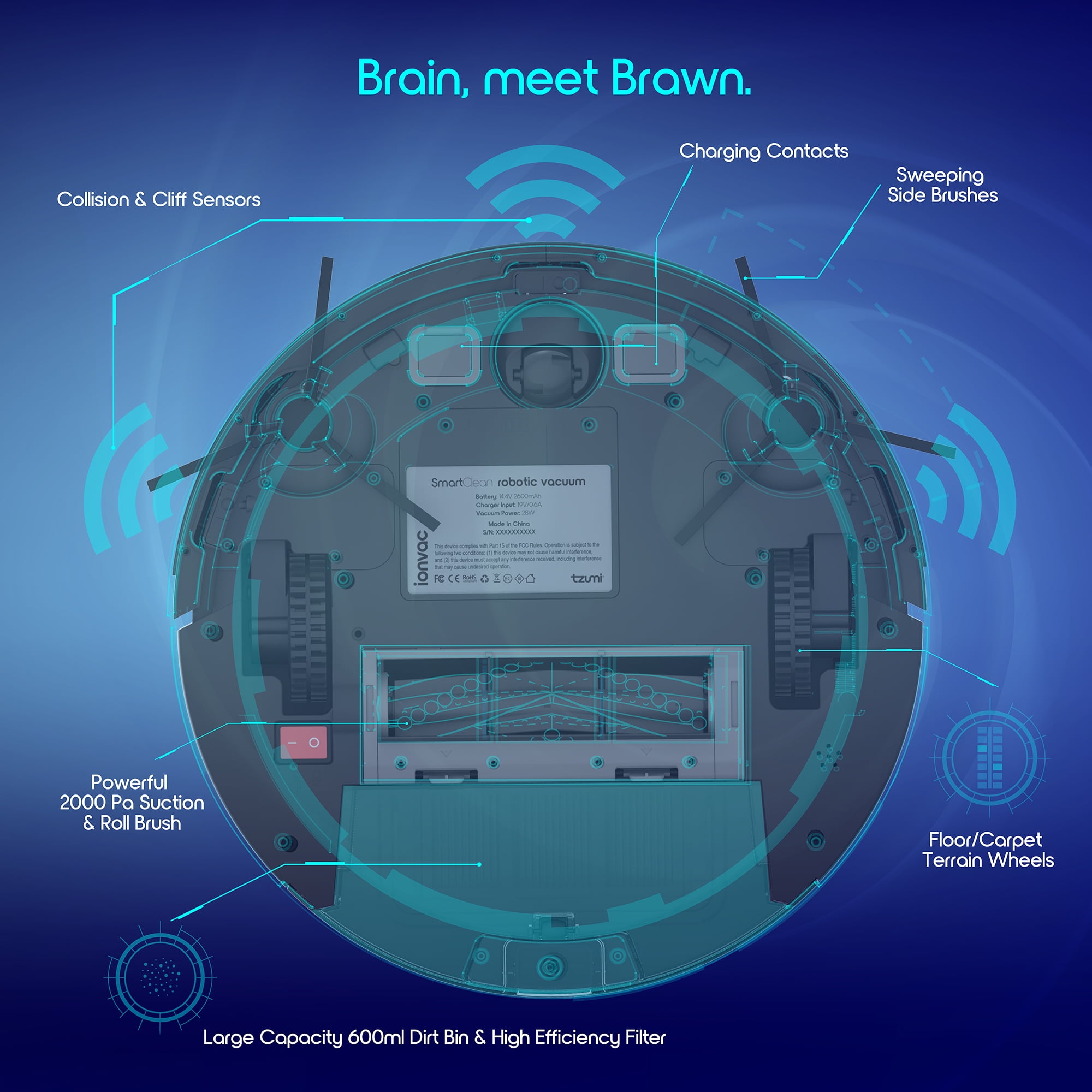 Wi-Fi robot vacuum cleaner with remote and app control Features side brushes, a roller brush, and a large 600 ml dustbin Offers 2000Pa of suction power with a quiet operation of just 62dB Four cleaning modes to tidy up any and every room Equipped with anti-collision and cliff sensors Returns to its dock to recharge after up to 100 minutes of cleaning Ionvac, Condition: New; Model Number: 7687; Weight: 7.8 lbs