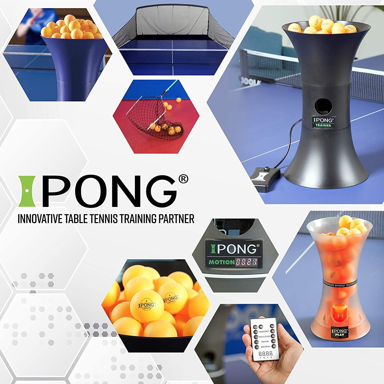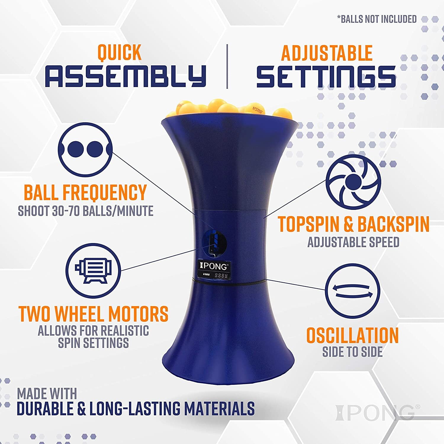 Welcome to your new training partner, the upgraded iPong V300! This model allows for improved accuracy and consistency. The iPong V300 has a stronger ball launch with increased spin, quieter operation and increased long-term performance. The iPong V300 also features a new feeder disc design that prevents ball jams. The robot holds over 100 table tennis balls and shoots at an adjustable frequency ranging from 12 to 70 balls per minute. The updated wireless remote controls your desired ball frequency, oscillation and spin control. Start playing like a pro in just seconds with minimal assembly! This simple, affordable and fun table tennis robot brings recreational table tennis to a new and higher level of competitive play. Balls and paddles not included.