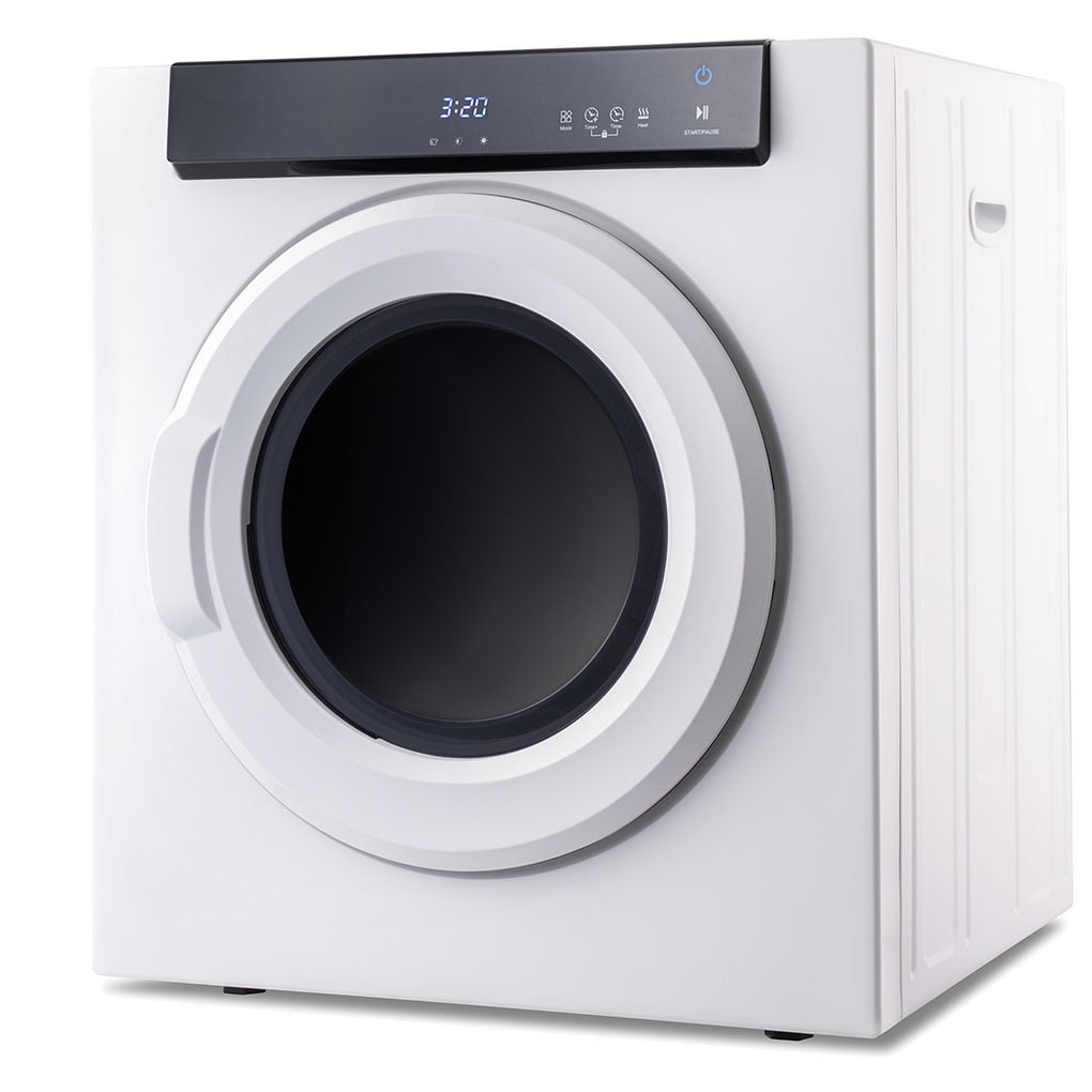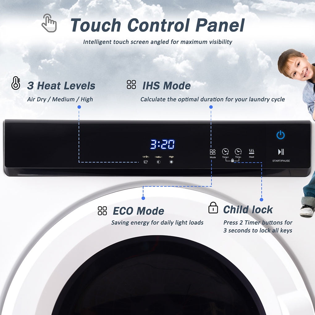 The electric clothes dryer can be installed on the wall or placed separately, it is suitable for small laundry rooms, apartments, dormitories, etc The clothes drying machine features a filter net, designed with a stainless steel inner tube, your clothes can keep tidy The electric clothes dryer featuring 3 different modes and 3 heating levels, you can use different functions according to your needs The clothes drying machine is equipped with touch screen and knob control, easy and simple to operate The electric clothes dryer will turn off automatically when your clothes are dry, your clothes are not easy to be damaged