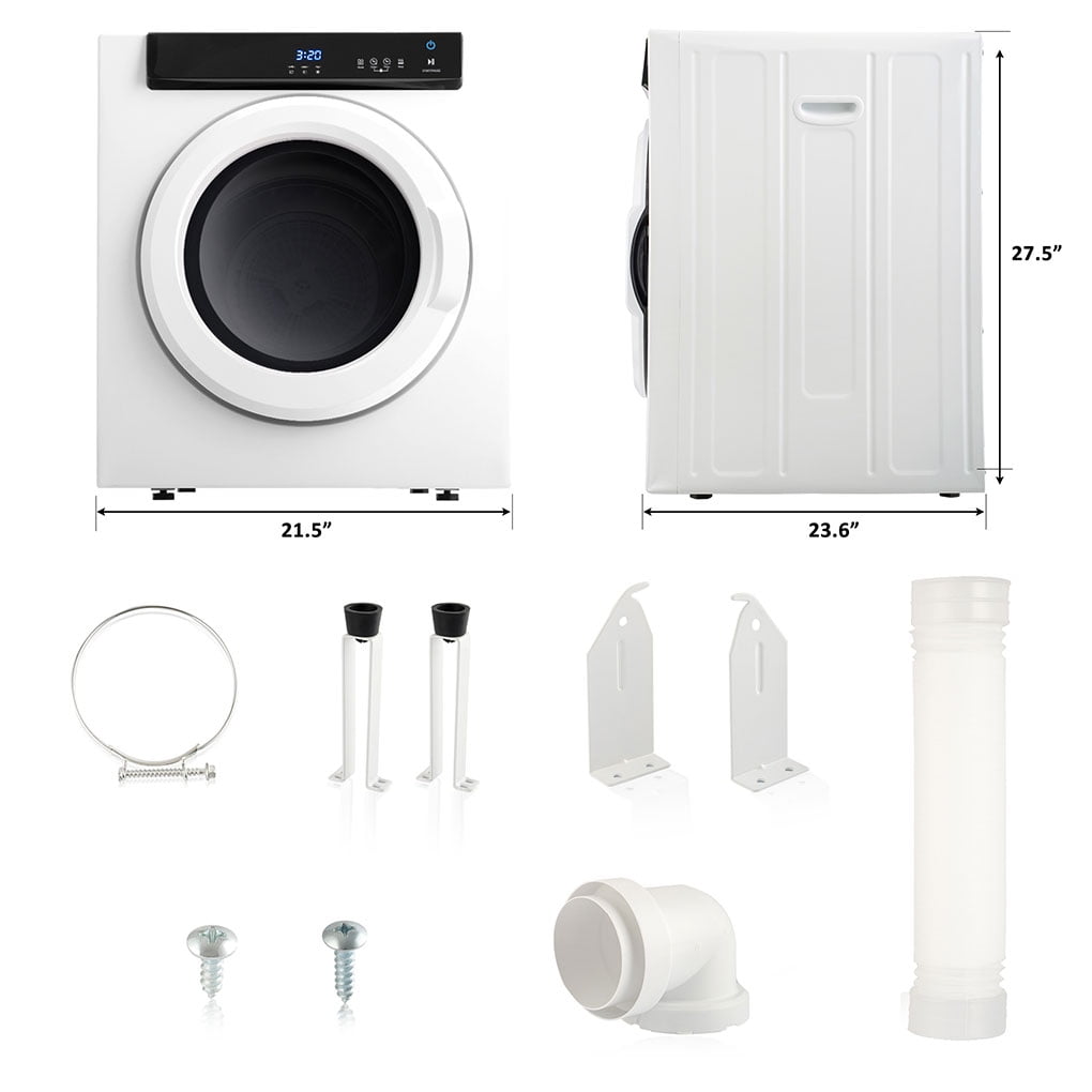 Description: The electric clothes dryer features 3 different modes and 3 heating levels, you can choose them according to your desire. The clothes drying machine is equipped with a stainless steel inner tube, built-in filter net, keeping your clothes in good condition. The electric clothes dryer features compact design, it can be stacked on the washing machine, it can also be installed on the wall or placed separately. The clothes drying machine is designed with touch screen and knob control, you can use it conveniently. The clothes dryer will turn off automatically when the clothes are dry, if you want to add more clothes, the machine will automatically stop when the front door is opened. Specification: Product Dimensions: 21.5(L) x 23.6(W) x 27.5(H) inch. G.W./N.W.: 72.8 / 55.1 lbs. Capacity: 14 lbs. Power Source: 120V~ 60Hz. Rated Input: 1500W. Lint Filter Location: Front. Door Style: Irreversible. Number of Drying Temperatures: 3. Stackable: Yes. Color: Show as pictures. Package Included: 1x Clothes dryer.