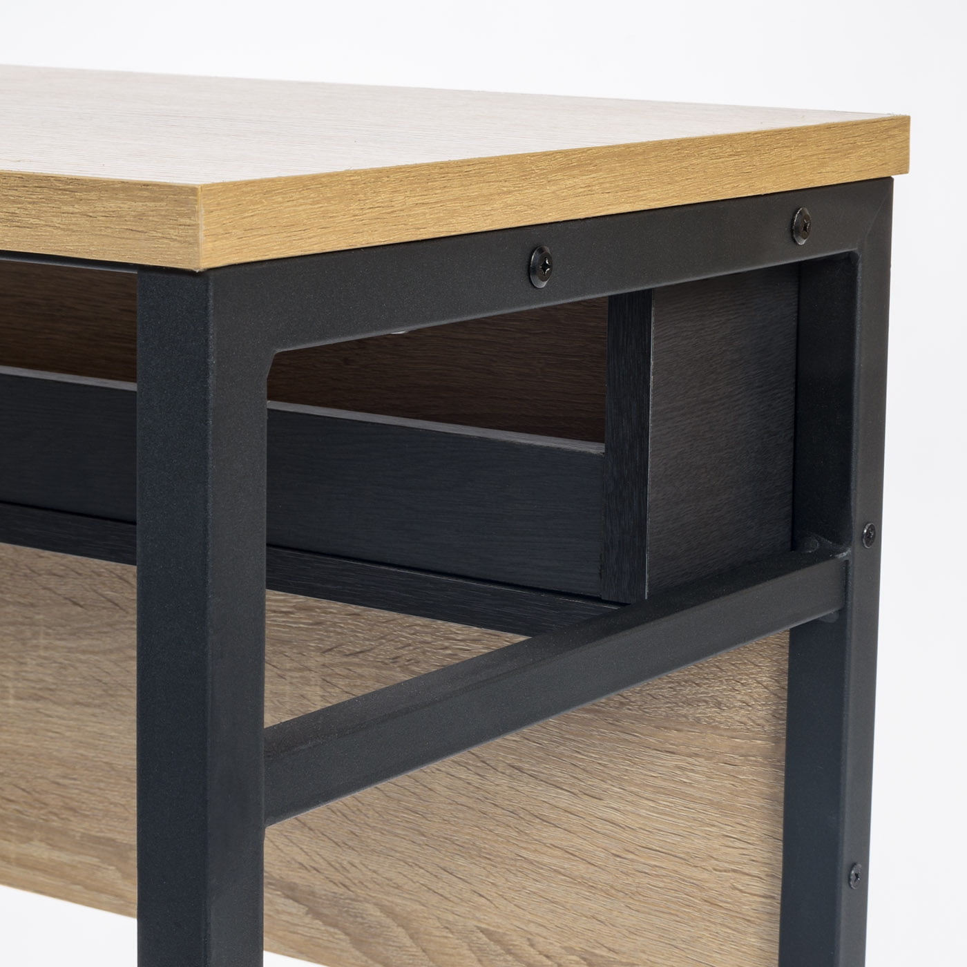 COMPUTER DESK: IRIS USA Computer Desk with built in cable management tray comes with matching monitor stand ORGANIZE: Built-in under-the-desk cable management tray to organize and hide cords HEIGHT ADJUSTABLE: Adjustable legs allows for the desk to be placed even on uneven surface DESIGN: Modern and transitional style design to meet your everyday needs with a natural wood finish and black powder coated metal frame. Dimensions: 31.5″ x 21.6″ x 29.5″