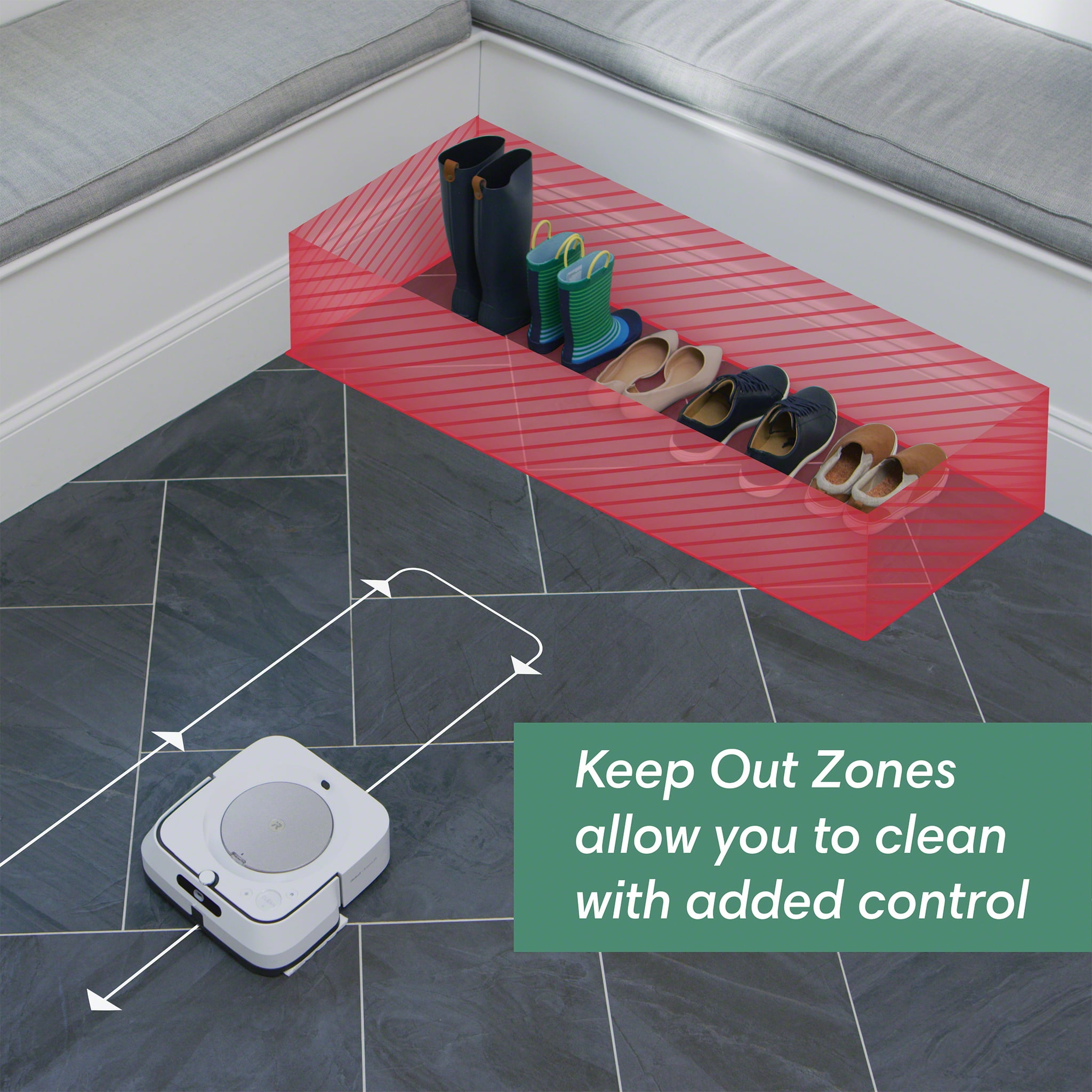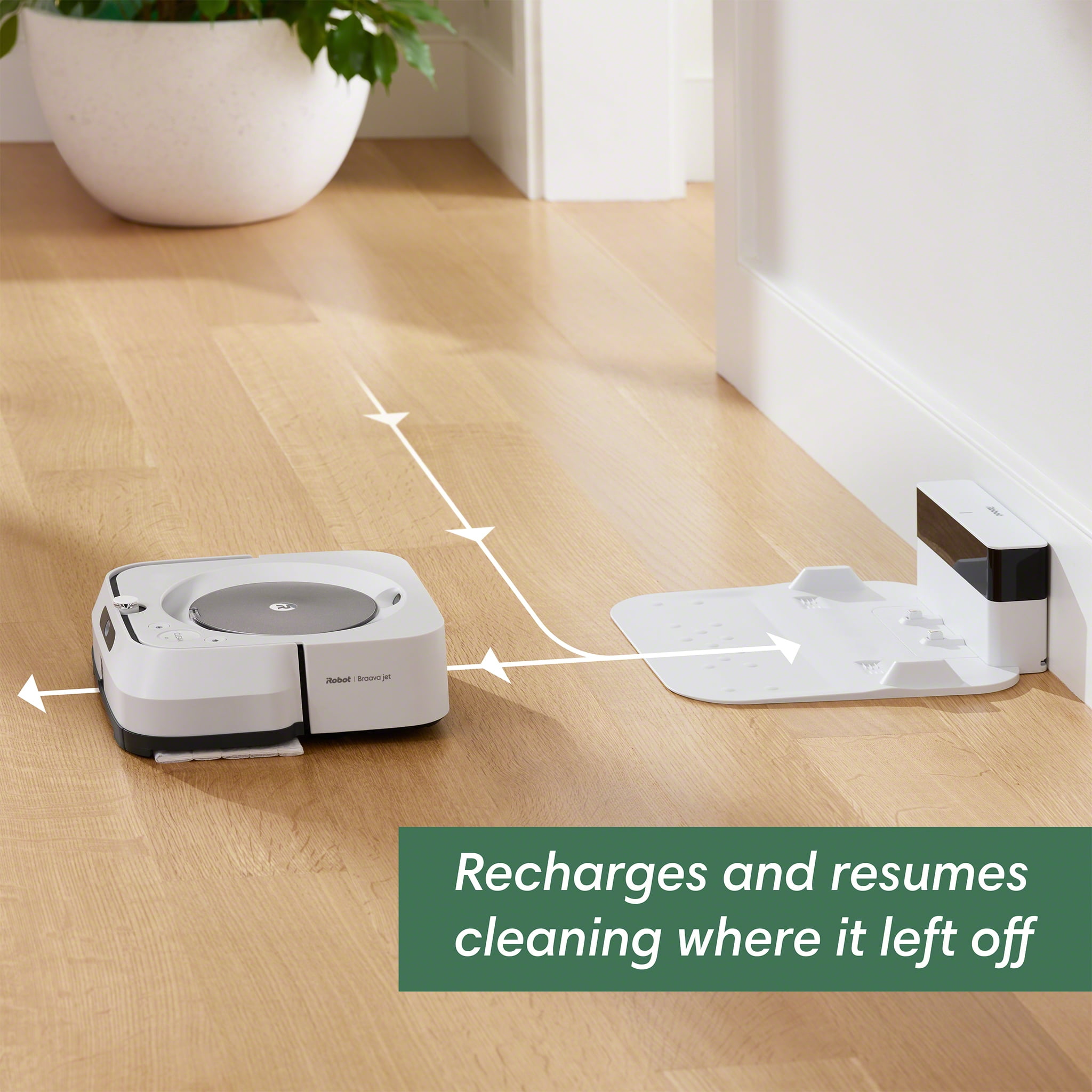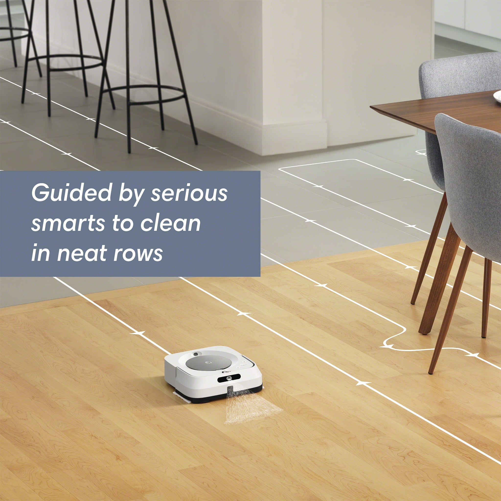 When spills happen, the Braava jet® m6 robot is always on call—ready to head to the spot and take them on. Just say to Google Assistant, “Have Braava mop in front of the kitchen counter”, and it heads out and gets to work. Always learning your home and your cleaning habits, it can offer customized schedules that work around your life—even suggesting extra cleanings during pollen season. Using Precision Jet Spray, it loosens dirt and sticky messes without spraying furniture, rugs, or walls—all without any effort from you, making your mopping tasks a thing of the past. *(Google is a trademark of Google LLC)
