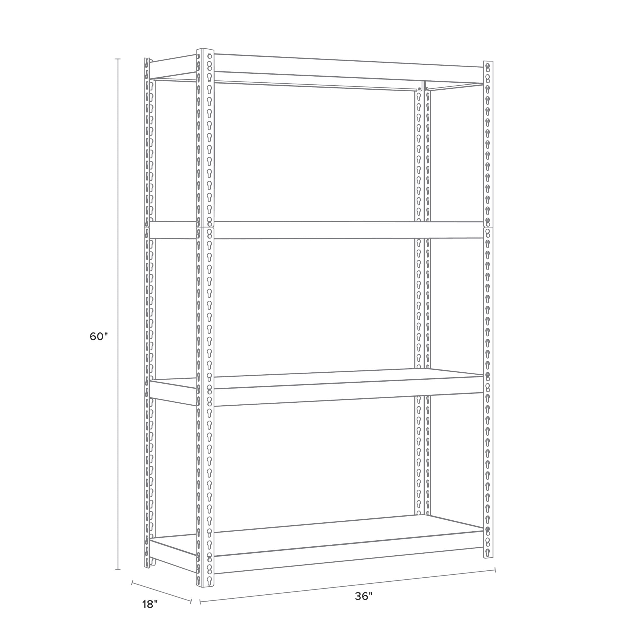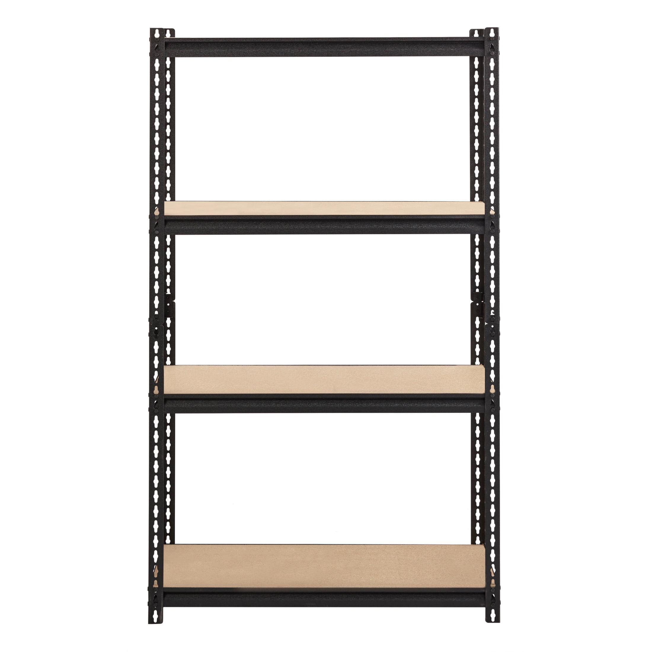 Total capacity 1,840 lbs. of evenly distributed weight Shelves adjust in 1.50″ Increments to accommodate items of varying heights 4-Shelf unit Assembles vertically or horizontally Assembles with a rubber mallet (not included) Durable powder Coat Finish – rust resistant Riveted Steel Construction Iron Horse 2300 Riveted Steel Shelving 4-Shelf Unit, 18D x 36W x 60H, Black