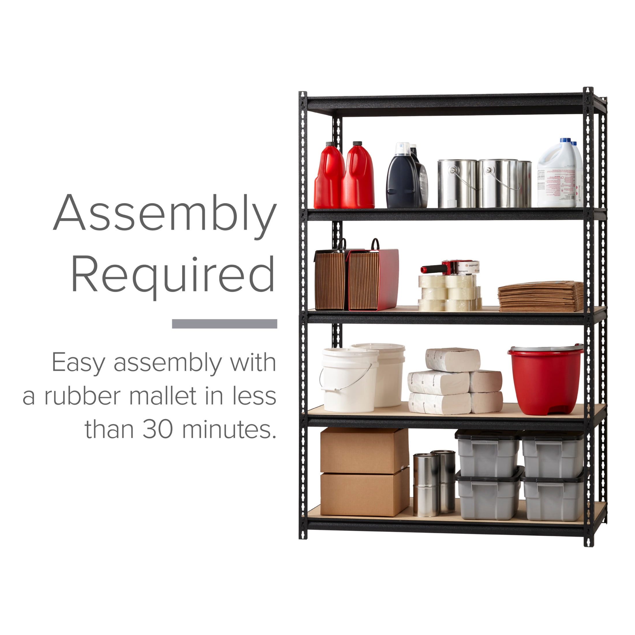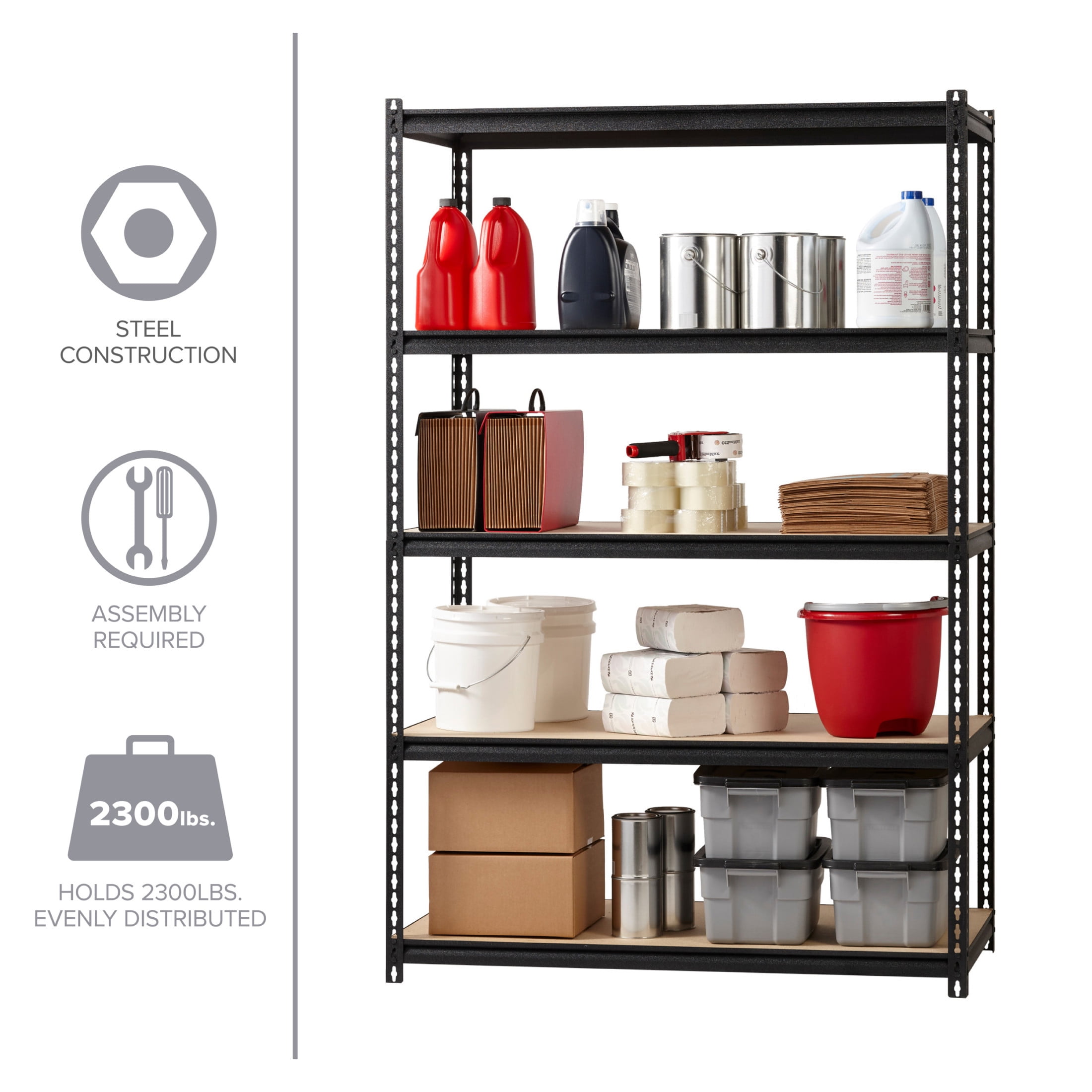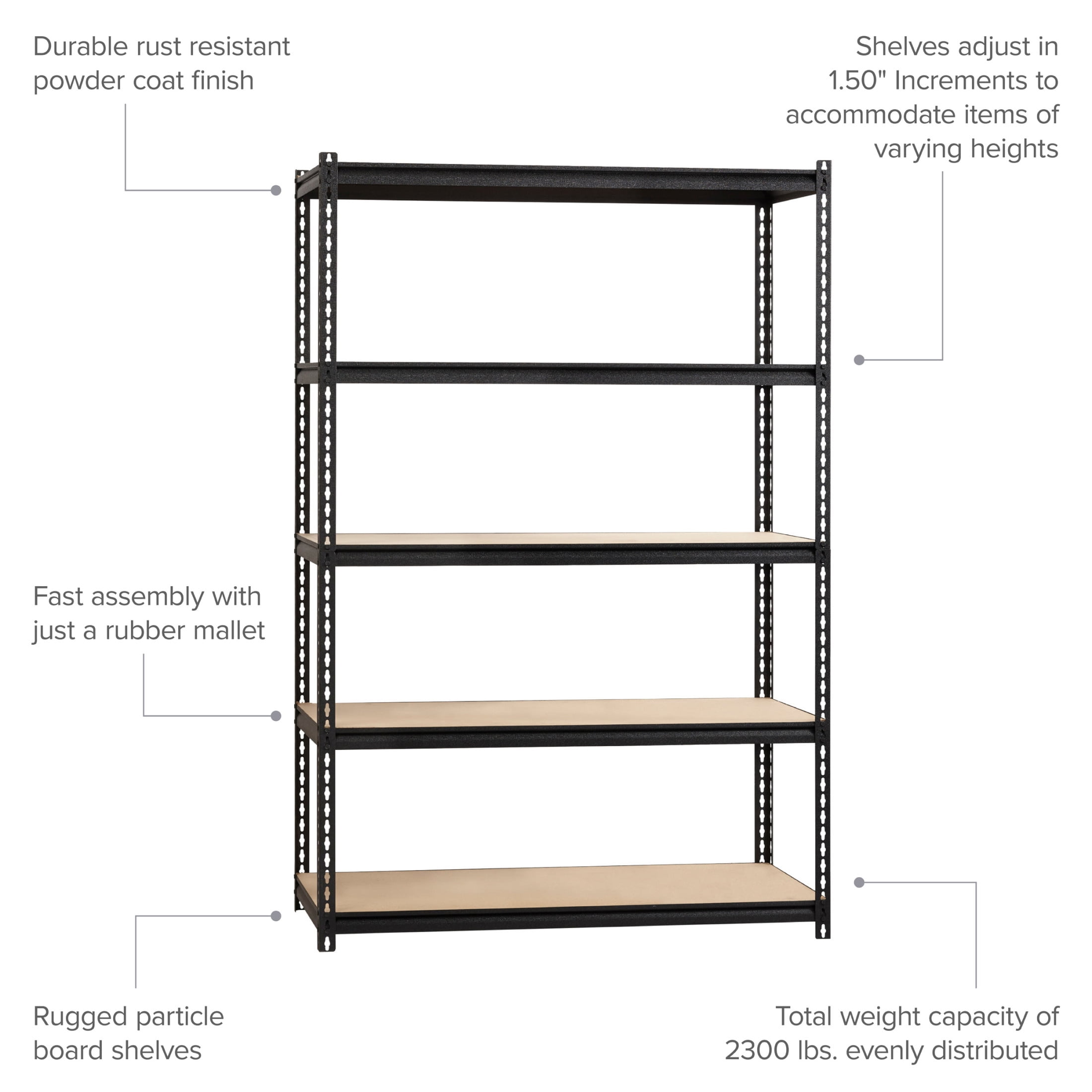 Total capacity 2,300 lbs. of evenly distributed weight Shelves adjust in 1.50″ Increments to accommodate items of varying heights 5-Shelf unit Assembles vertically or horizontally Assembles with a rubber mallet (not included) Durable powder Coat Finish – rust resistant Riveted Steel Construction Iron Horse 2300 Riveted Steel Shelving 5-Shelf Unit, 24D x 48W x 72H, Black