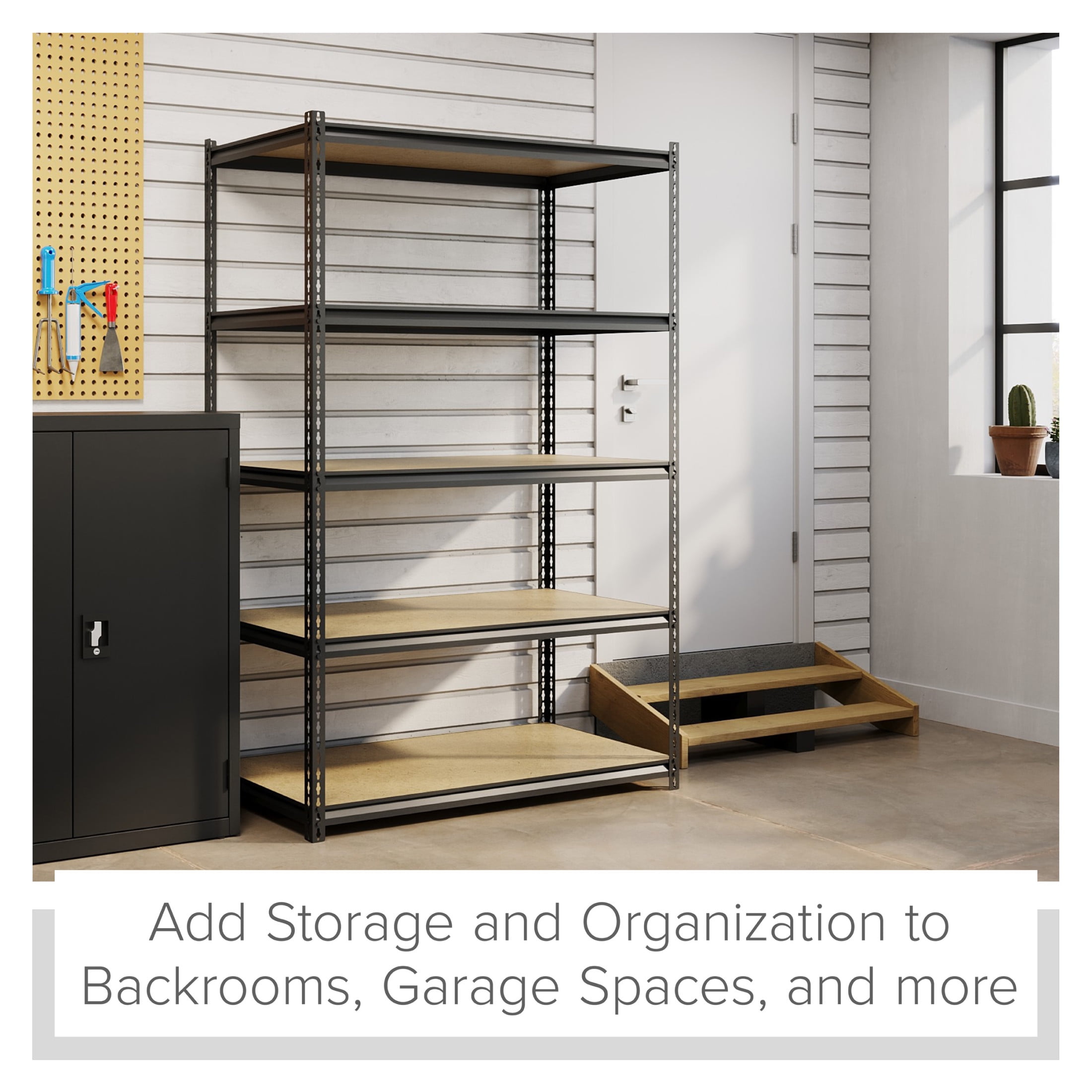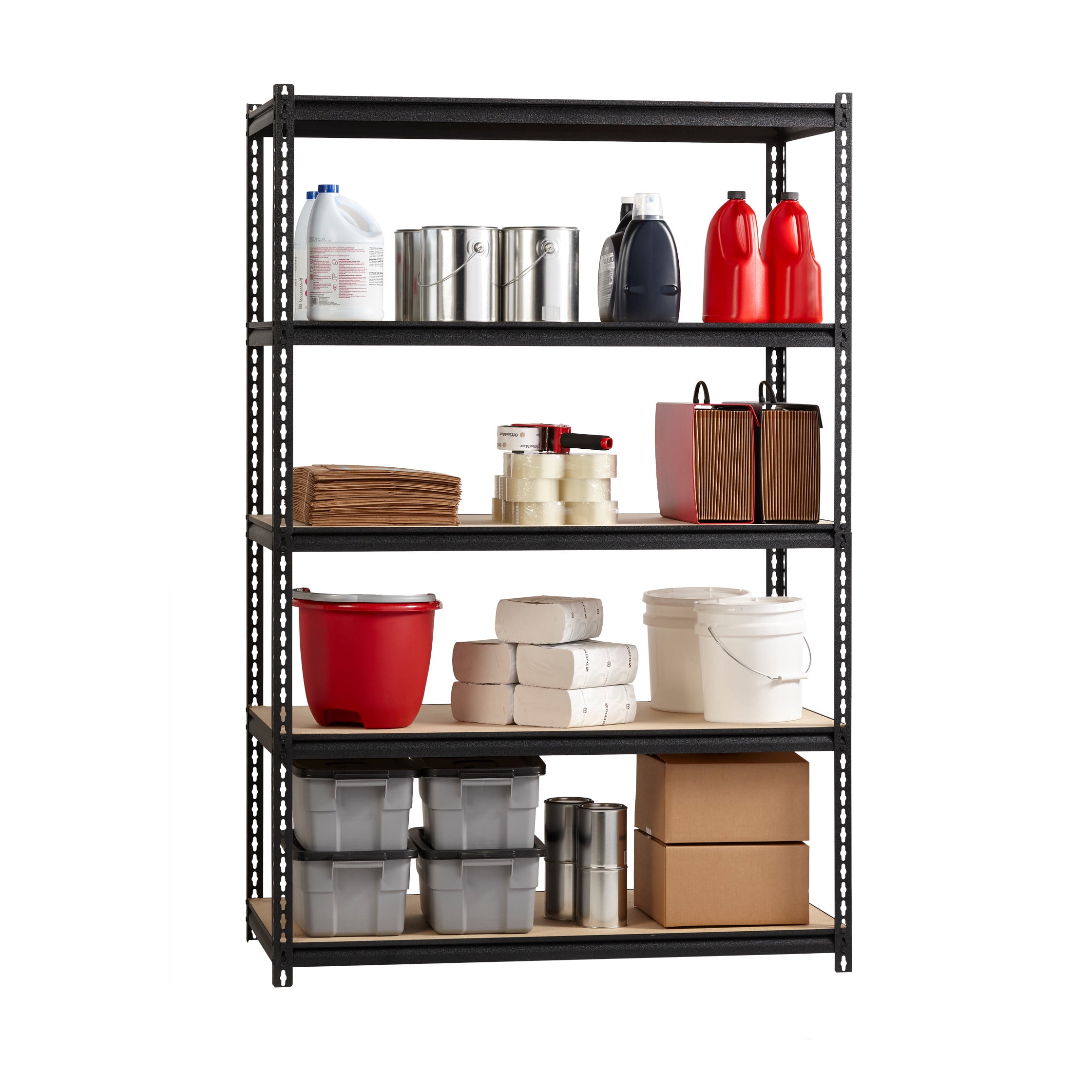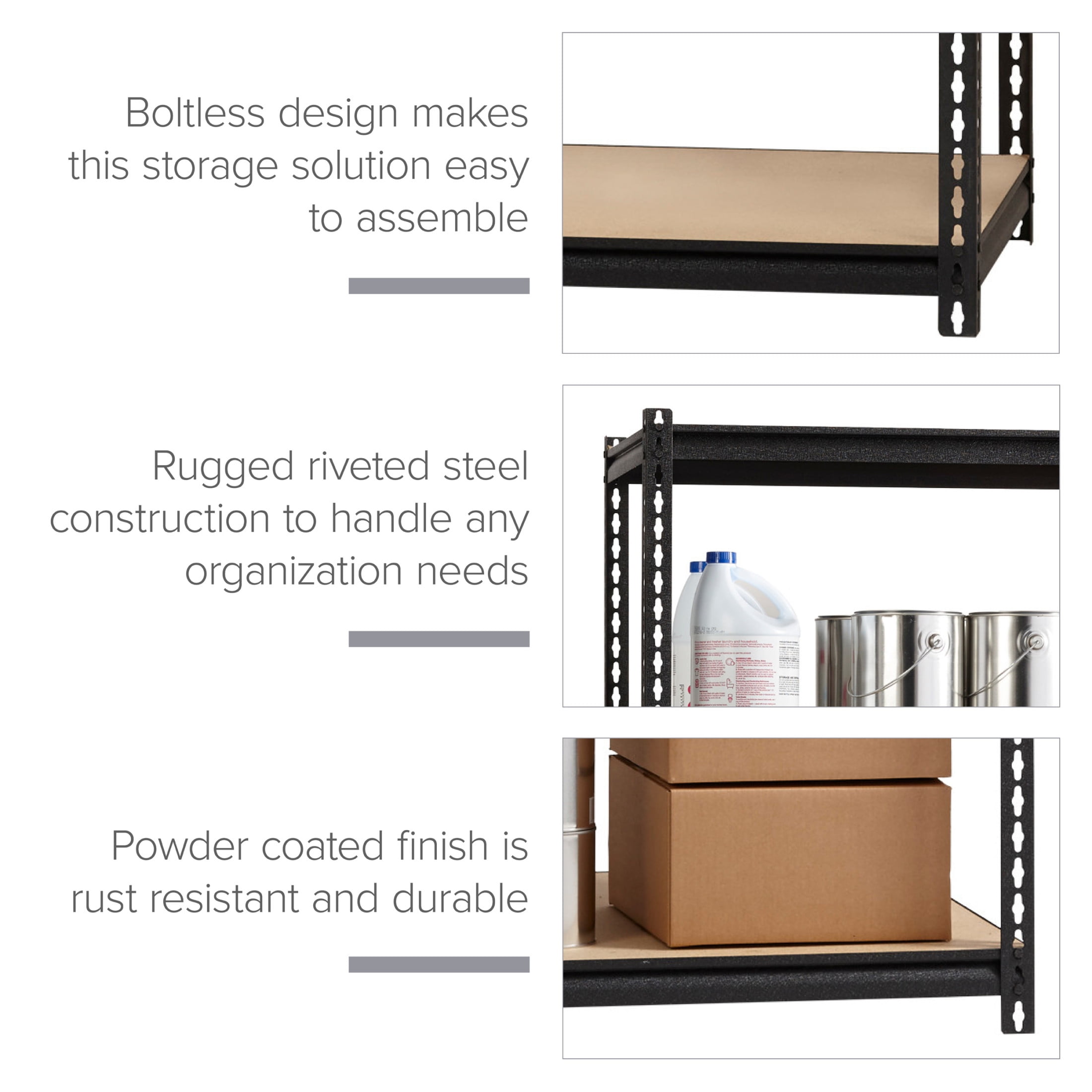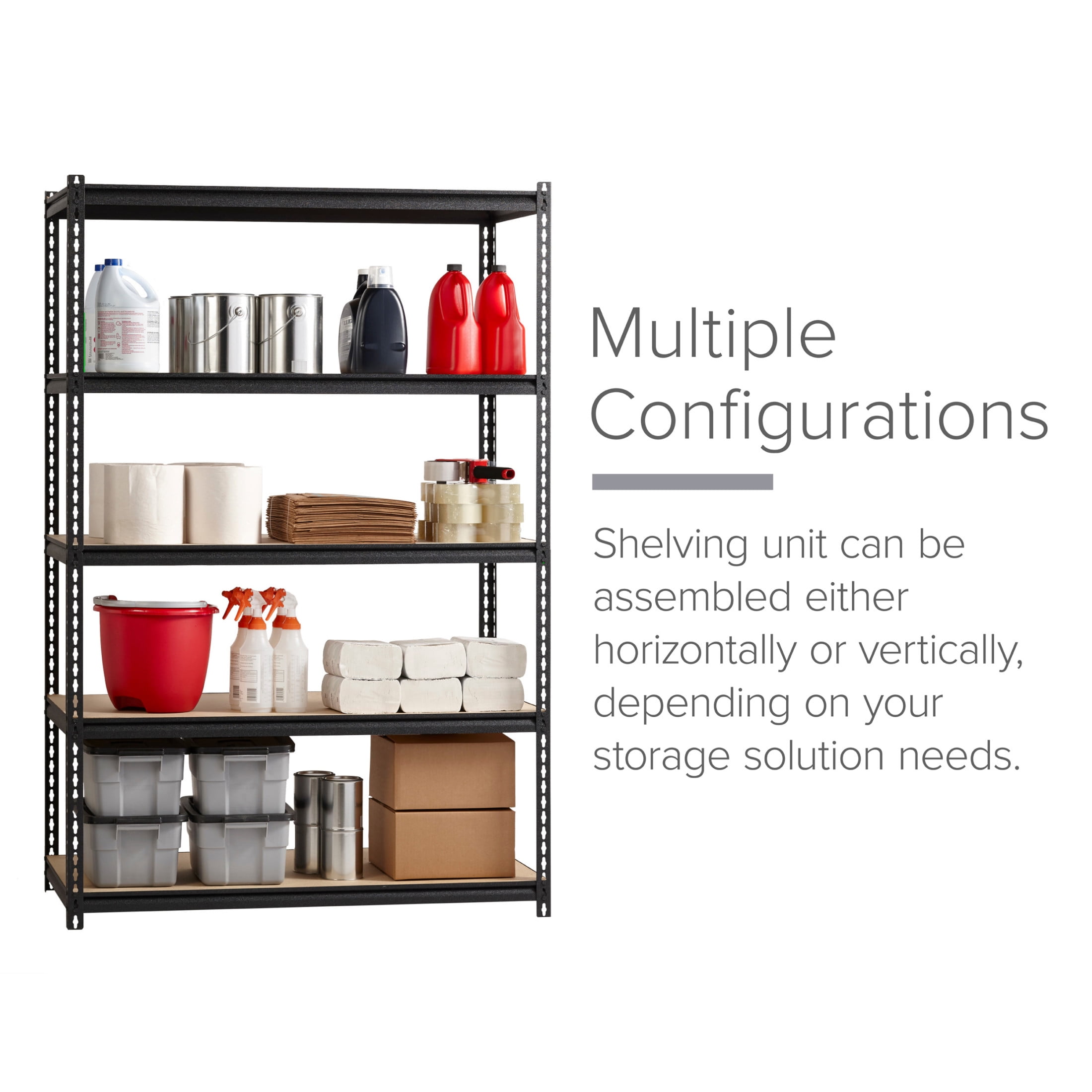 Total capacity 2,300 lbs. of evenly distributed weight Shelves adjust in 1.50″ Increments to accommodate items of varying heights 5-Shelf unit Assembles vertically or horizontally Assembles with a rubber mallet (not included) Durable powder Coat Finish – rust resistant Riveted Steel Construction Iron Horse 2300 Riveted Steel Shelving 5-Shelf Unit, 24D x 48W x 72H, Black