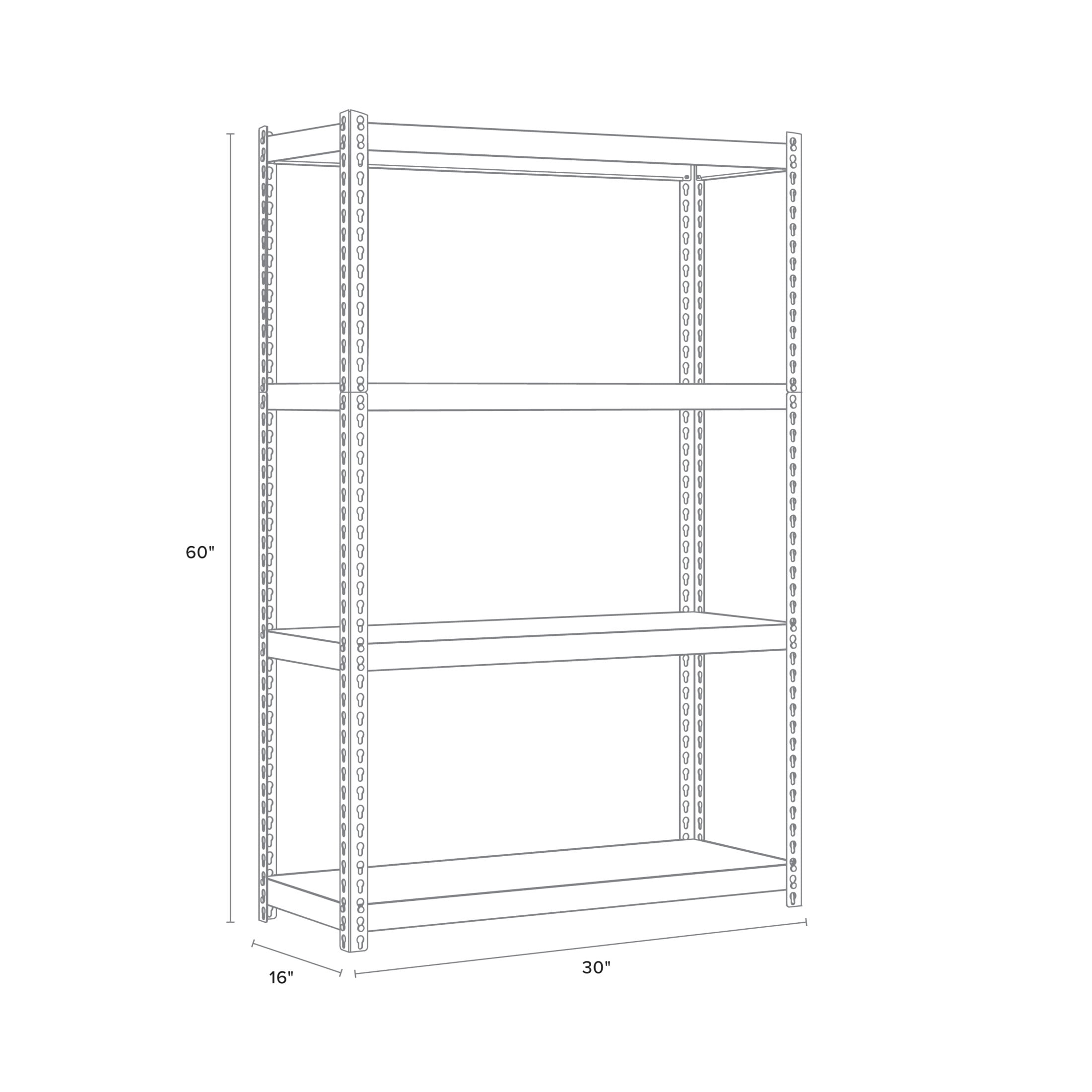 Total capacity 3,800 lbs. of evenly distributed weight Shelves adjust in 1.50″ Increments to accommodate items of varying heights 4-Shelf unit Assembles vertically or horizontally Assembles with a rubber mallet (not included) Durable powder Coat Finish – rust resistant Riveted Steel Construction Iron Horse 3800 Riveted Steel Shelving, 4-Shelf, 16Dx30Wx60H, Black