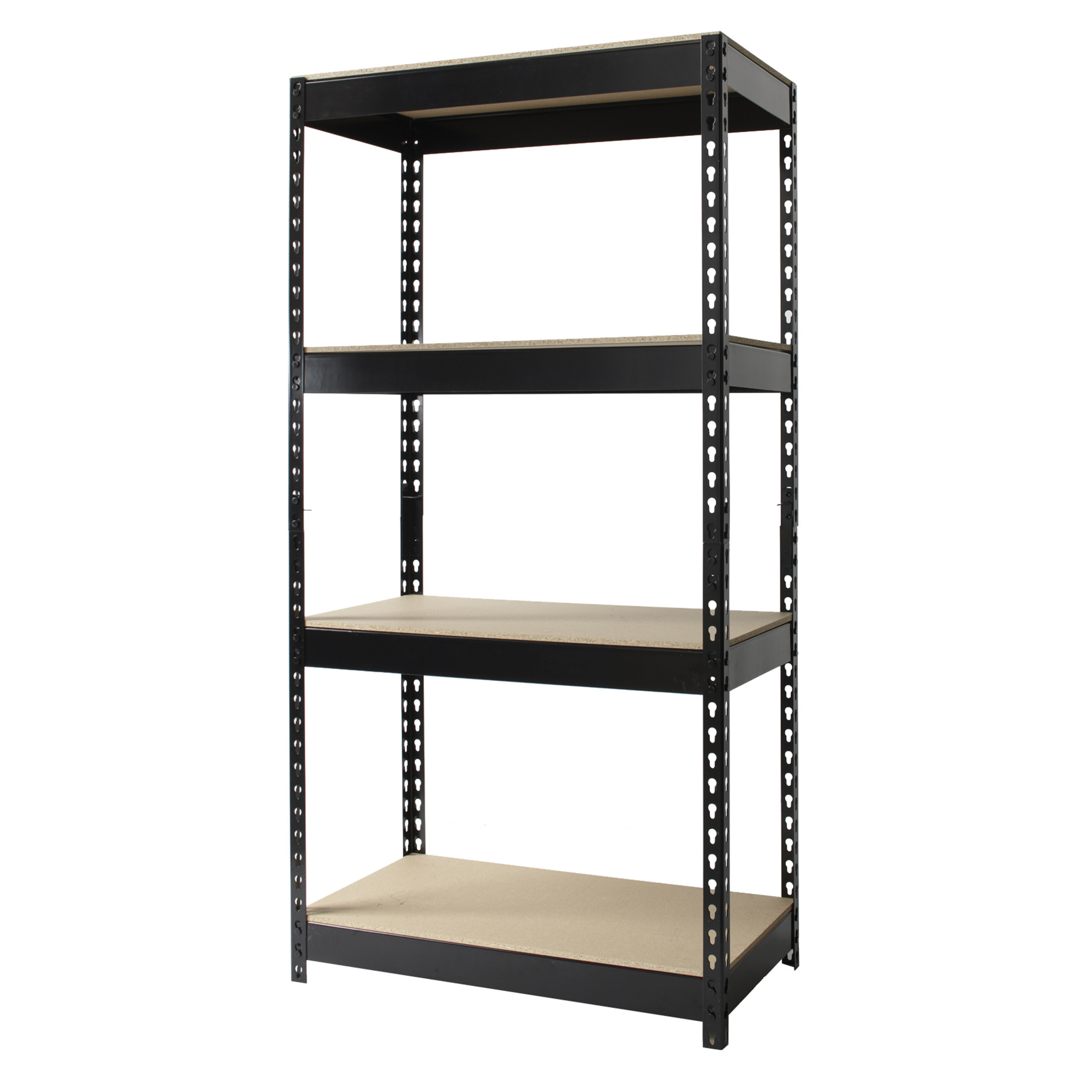 Rivet shelving is designed for heavy-duty use. The boltless design allows for quick and easy assembly. The powder coated finish is rust resistant and durable. The shelving unit can be assembled either horizontally or vertically, depending on your storage needs. Each unit includes rugged particle board shelves. Steel four-shelf unit holds a total capacity of 3,800 lb. evenly distributed. Assemble with a rubber mallet in less than 30 minutes. Shelving is made of heavy-duty riveted steel construction. Color: Black