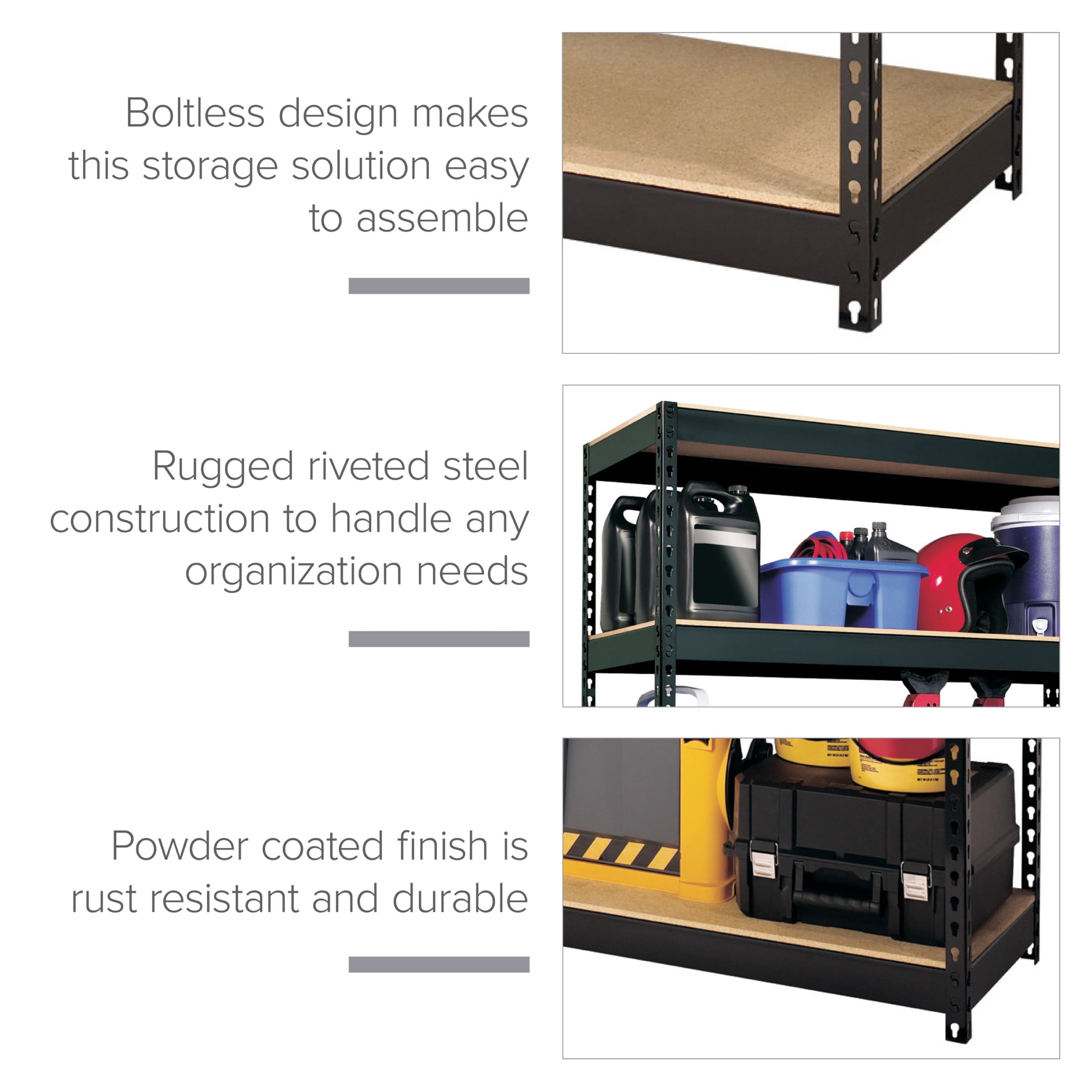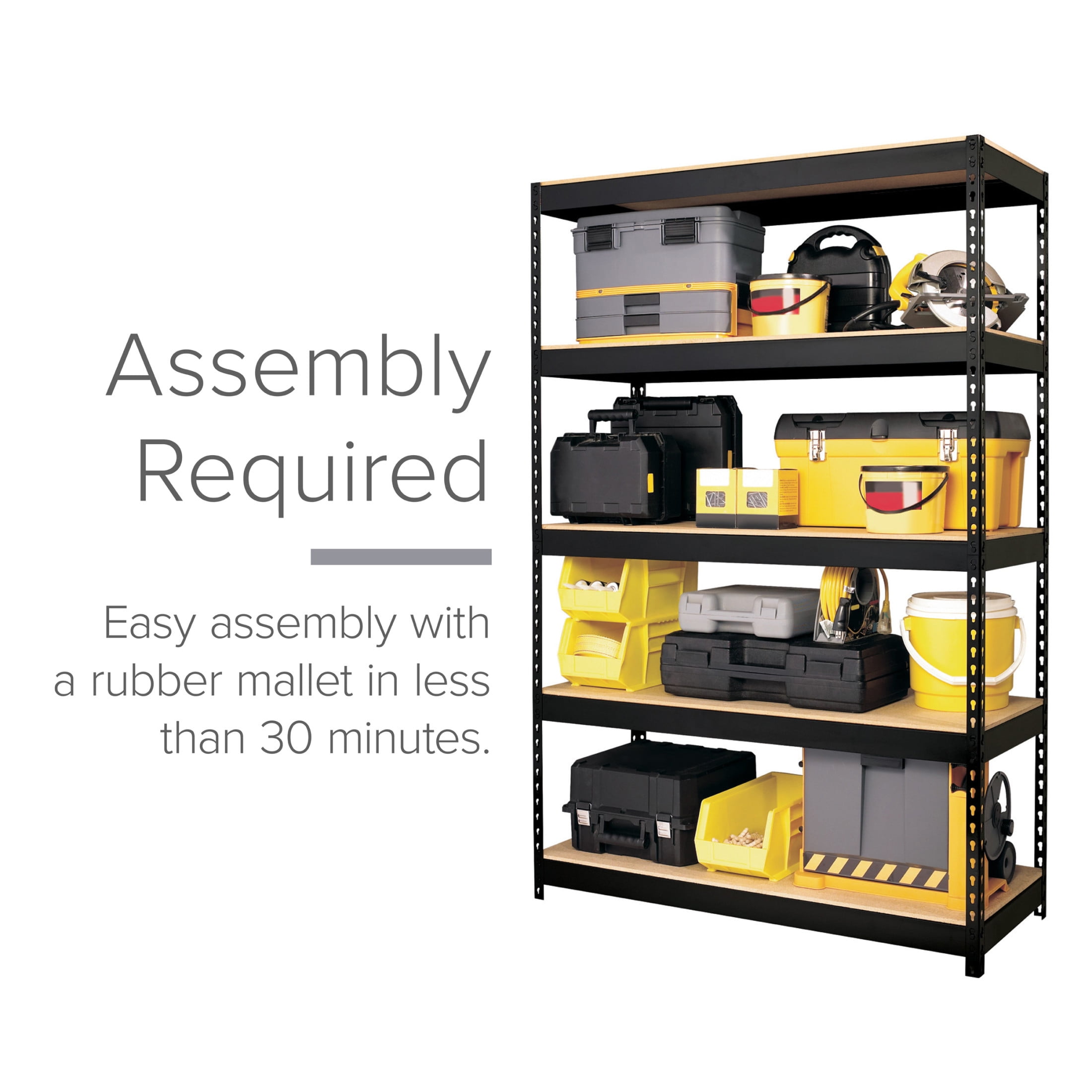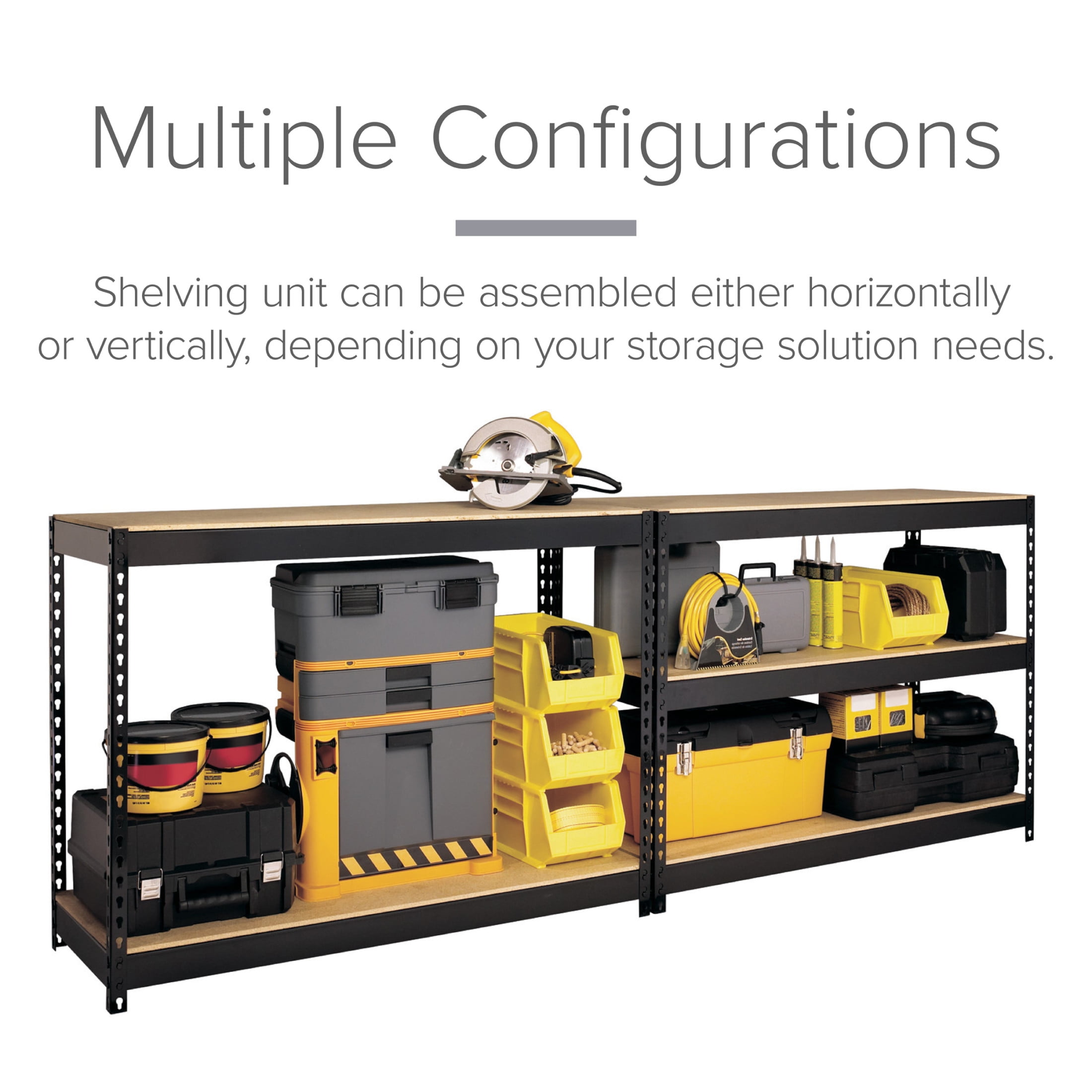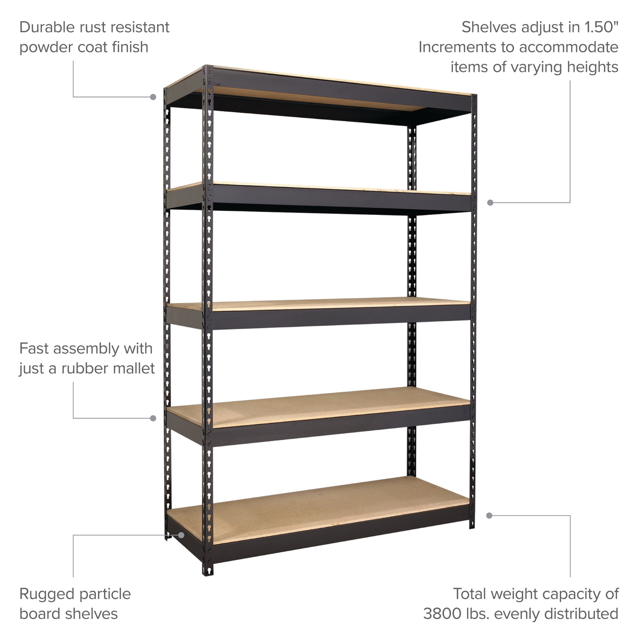 Iron Horse rivet shelving is designed for heavy-duty use with its weight capacity of 3,800 lbs. The boltless design makes this storage solution easy to assemble. The powder coated finish is rust resistant and durable. The Iron Horse shelving unit can be assembled either horizontally or vertically, depending on your storage solution needs. Each unit includes five rugged particle board shelves. Each unit includes five rugged particle board shelves and can be assembled with a rubber mallet in less than 30 minutes. This heavy-duty shelving features rugged riveted steel construction to handle your storage and organization needs. Color: Black