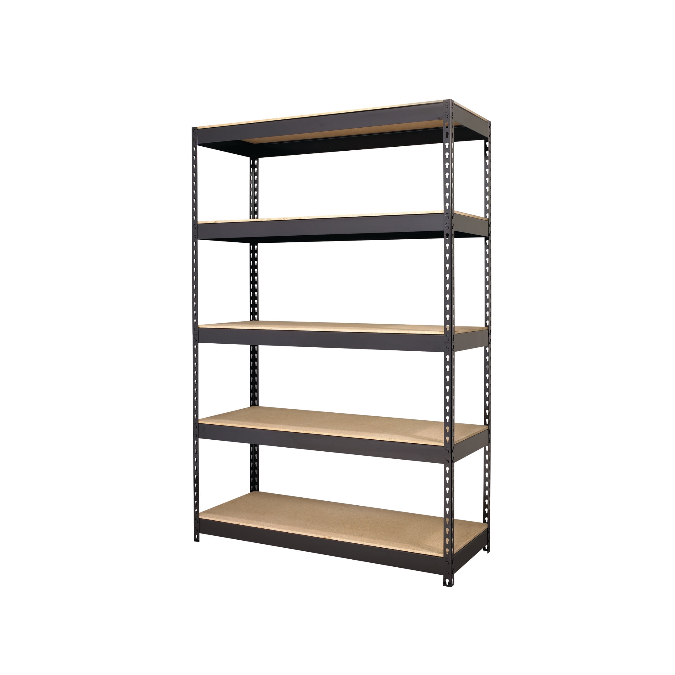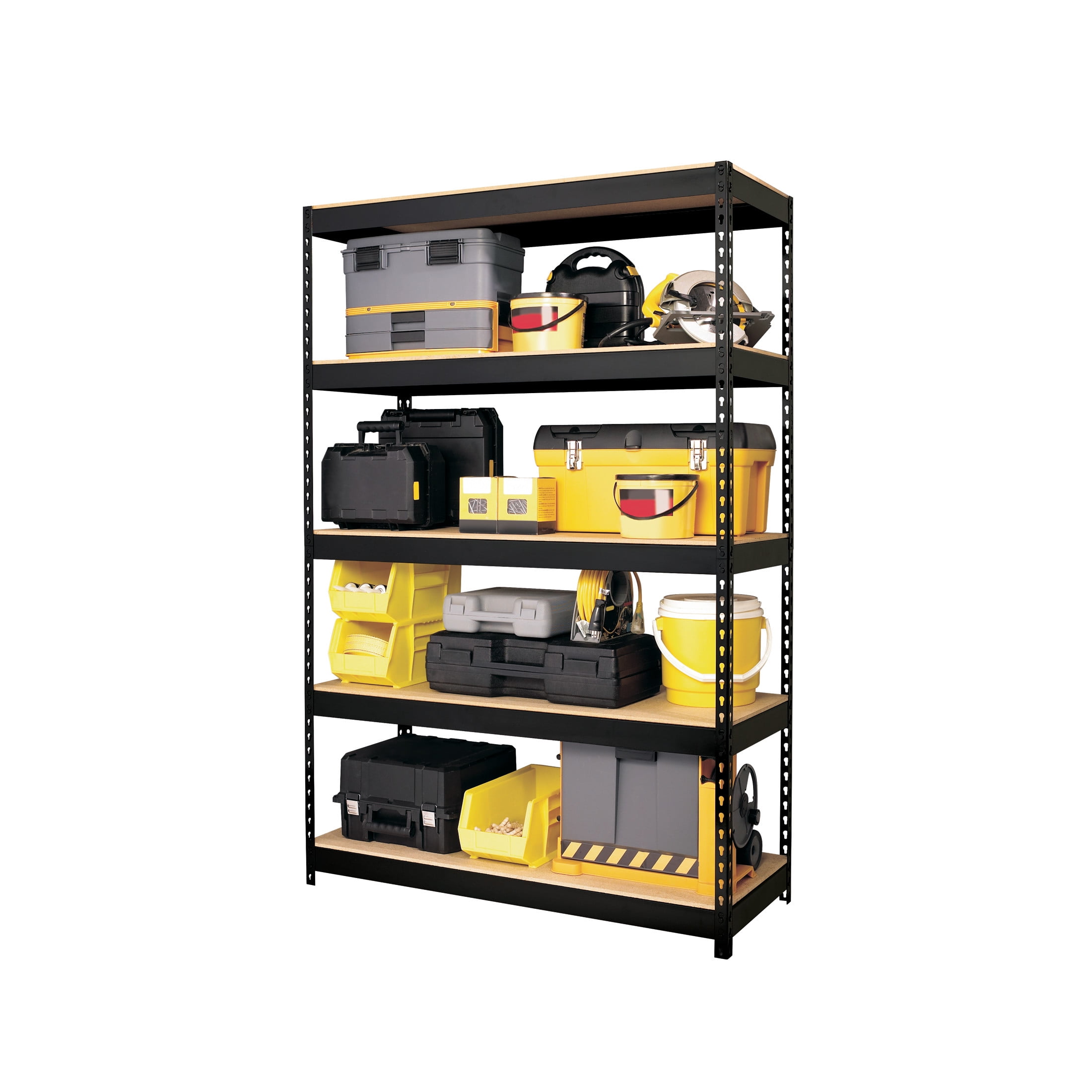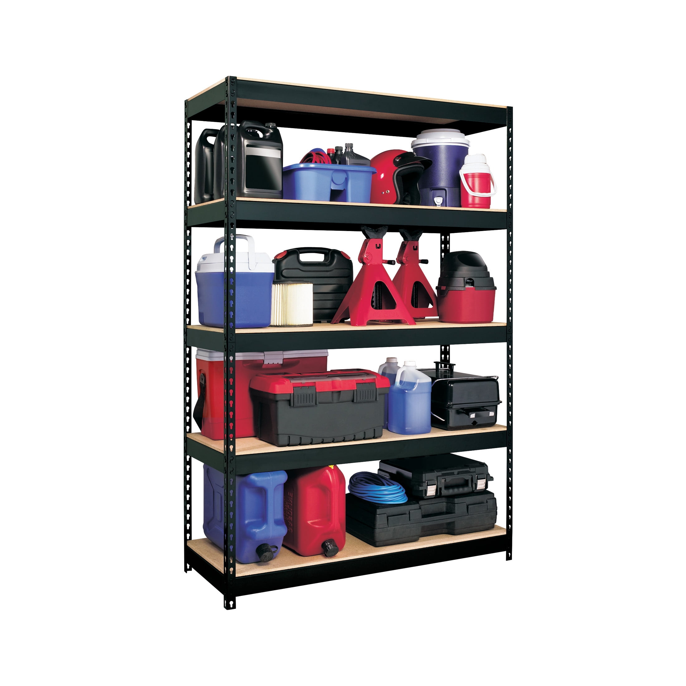 Iron Horse rivet shelving is designed for heavy-duty use with its weight capacity of 3,800 lbs. The boltless design makes this storage solution easy to assemble. The powder coated finish is rust resistant and durable. The Iron Horse shelving unit can be assembled either horizontally or vertically, depending on your storage solution needs. Each unit includes five rugged particle board shelves. Each unit includes five rugged particle board shelves and can be assembled with a rubber mallet in less than 30 minutes. This heavy-duty shelving features rugged riveted steel construction to handle your storage and organization needs. Color: Black