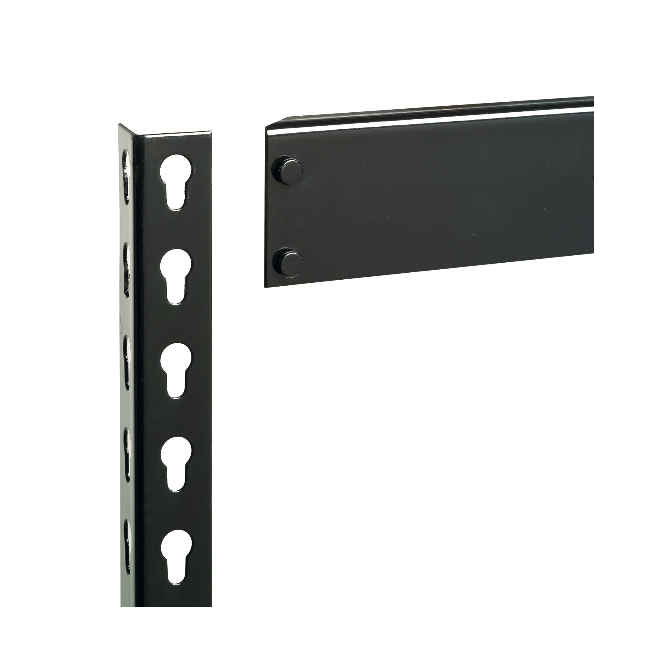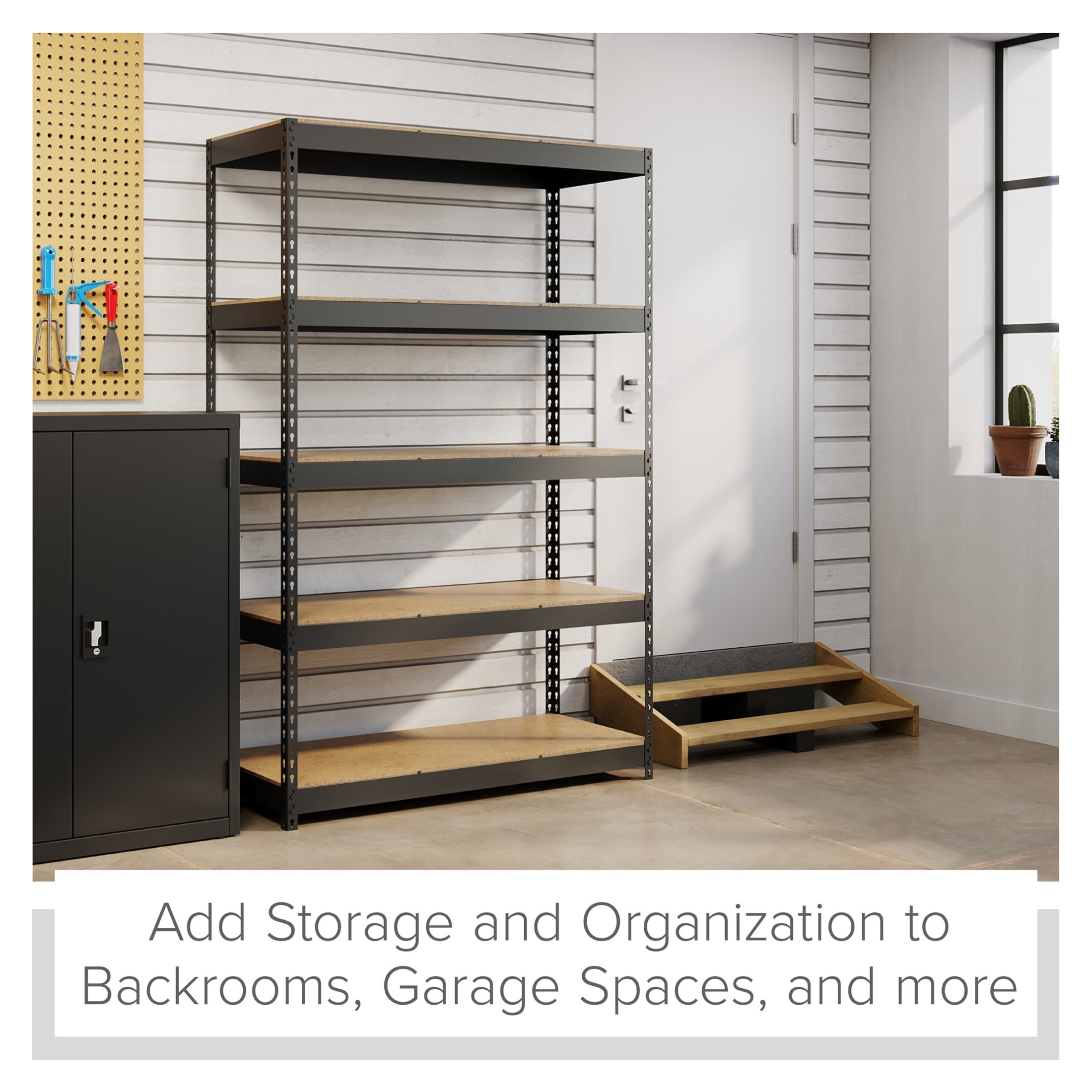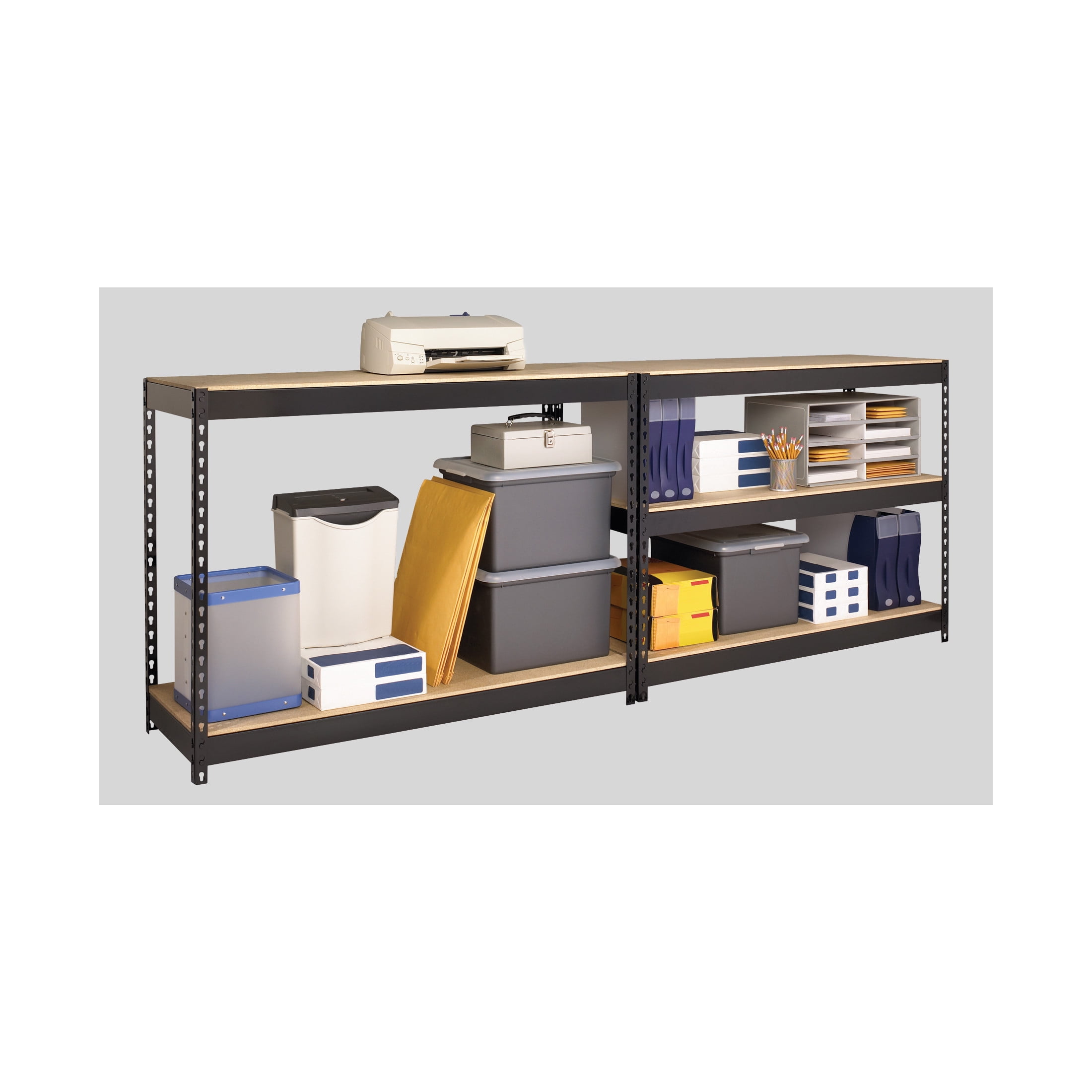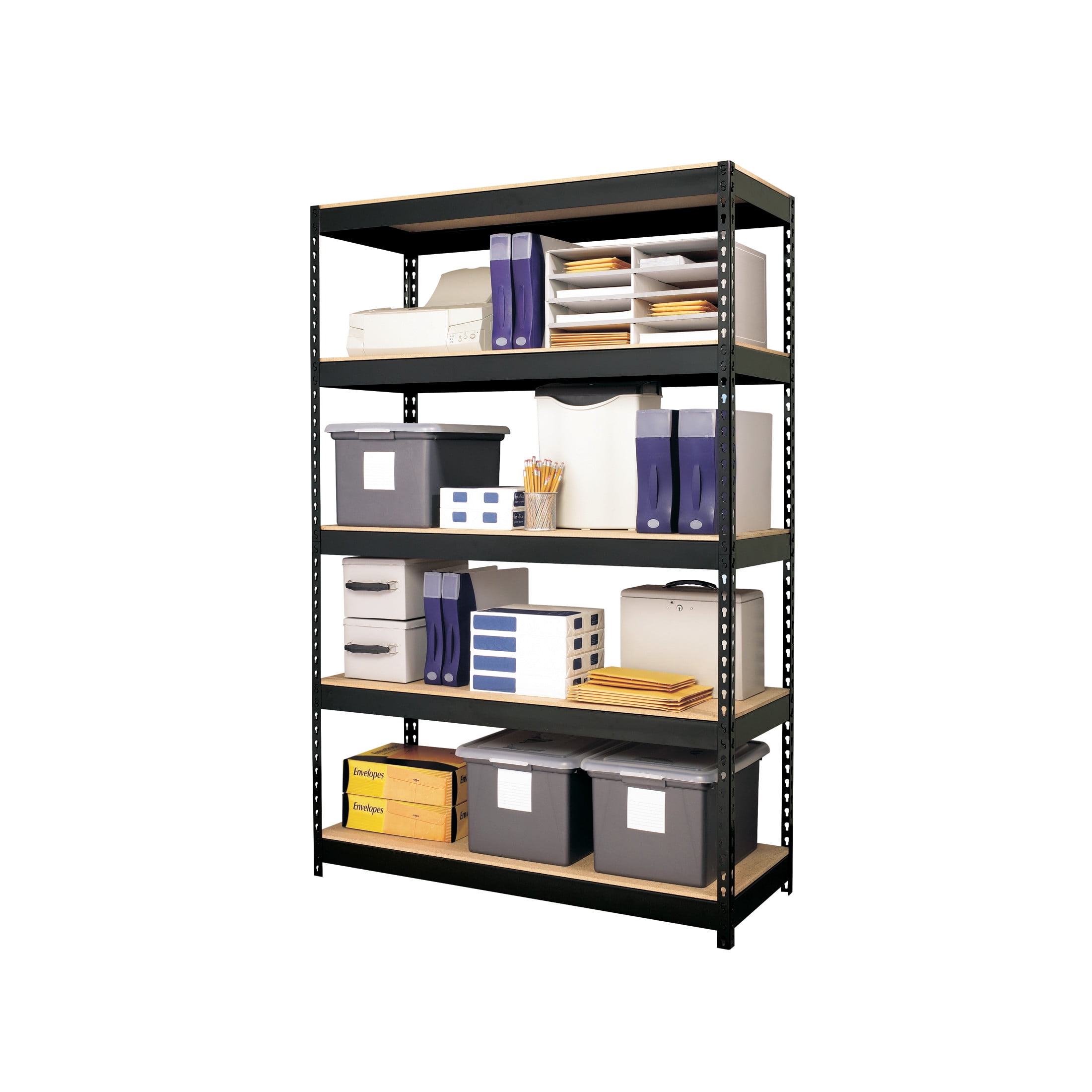 Iron Horse rivet shelving is designed for heavy-duty use with its weight capacity of 3,800 lbs. The boltless design makes this storage solution easy to assemble. The powder coated finish is rust resistant and durable. The Iron Horse shelving unit can be assembled either horizontally or vertically, depending on your storage solution needs. Each unit includes five rugged particle board shelves. Each unit includes five rugged particle board shelves and can be assembled with a rubber mallet in less than 30 minutes. This heavy-duty shelving features rugged riveted steel construction to handle your storage and organization needs. Color: Black