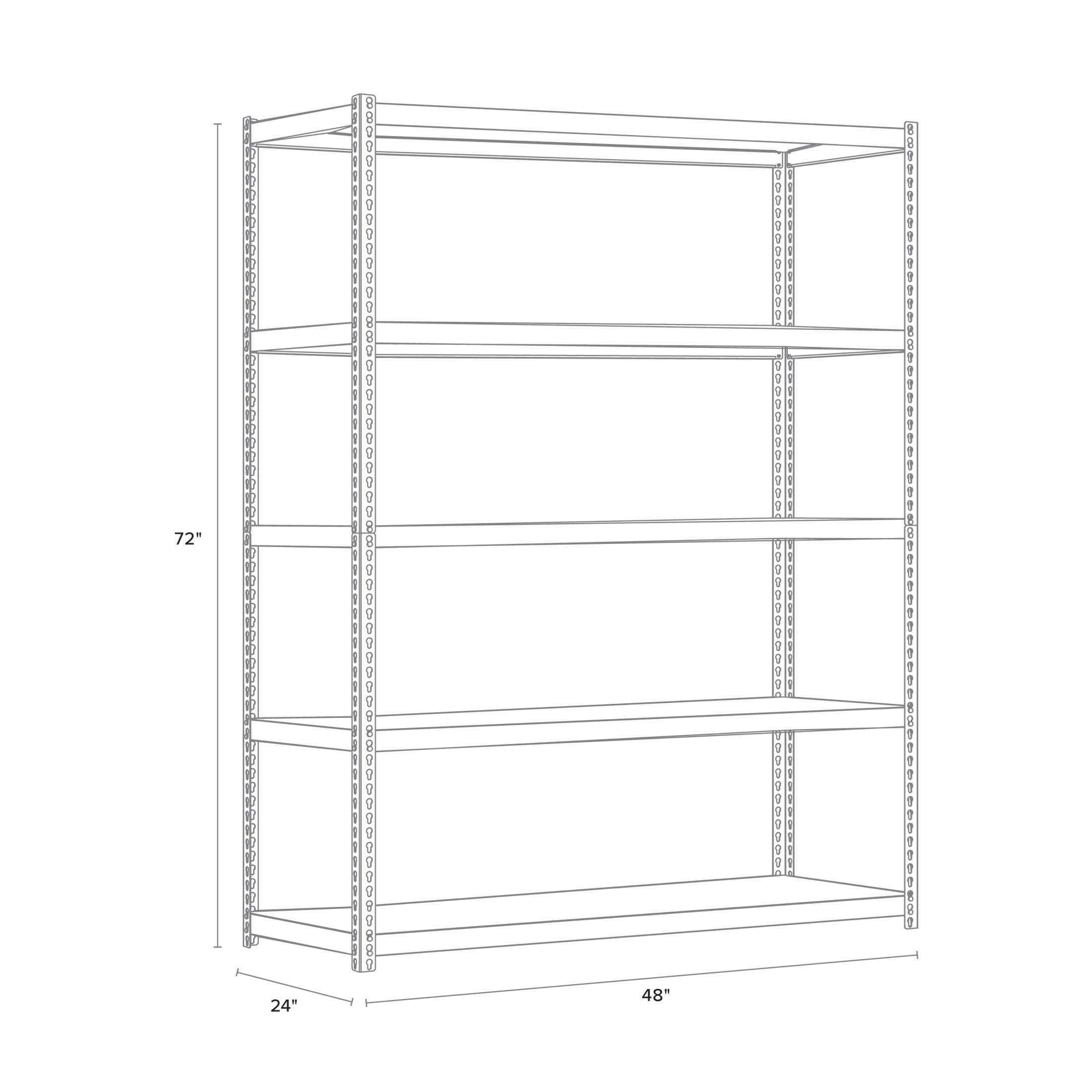 Total capacity 3,800 lbs. of evenly distributed weight Shelves adjust in 1.50″ Increments to accommodate items of varying heights 5-Shelf unit Assembles vertically or horizontally Assembles with a rubber mallet (not included) Durable powder coat finish – rust resistant Riveted Steel Construction Iron Horse 3800 Riveted Steel Shelving 5-Shelf Unit, 24D x 48W x 72H, Black
