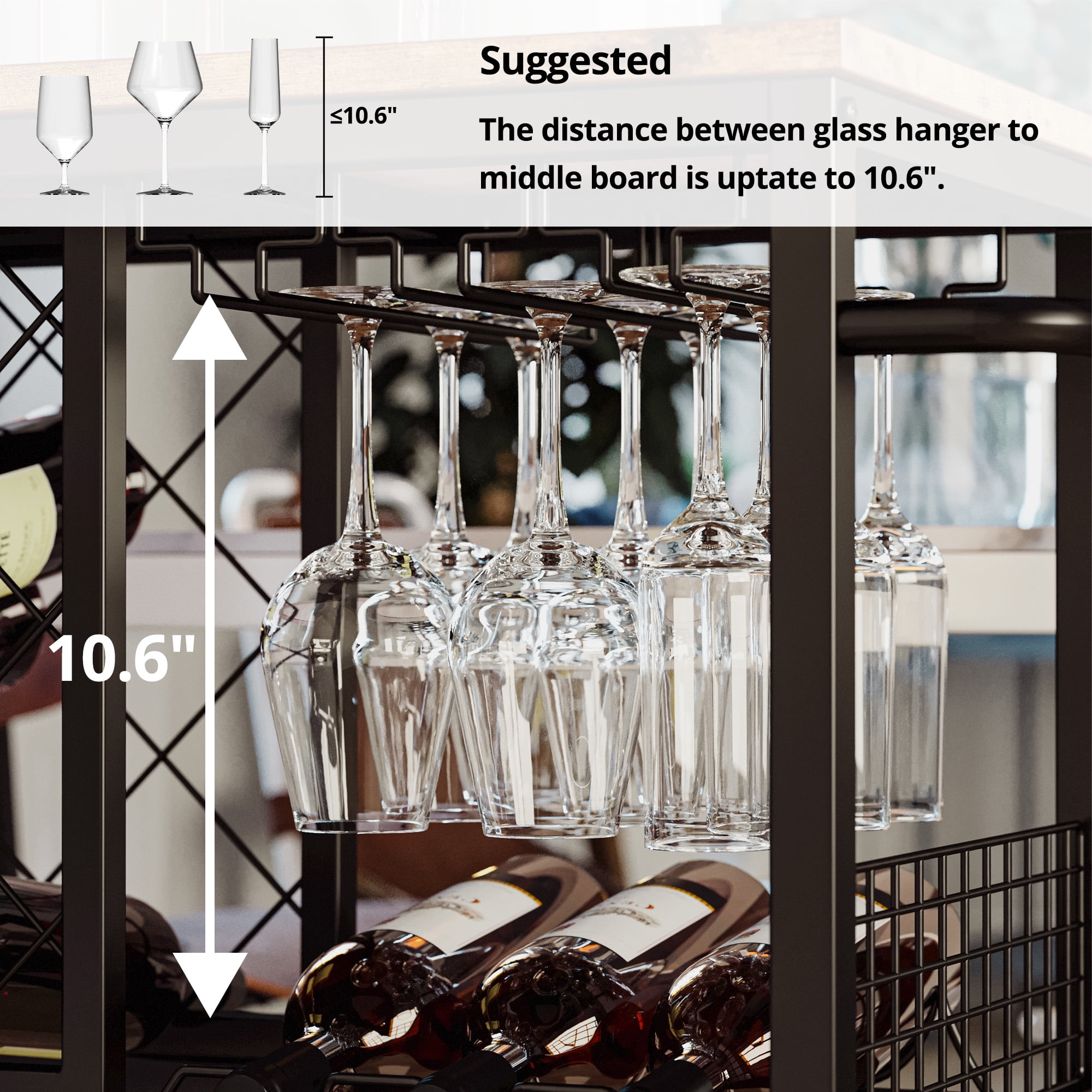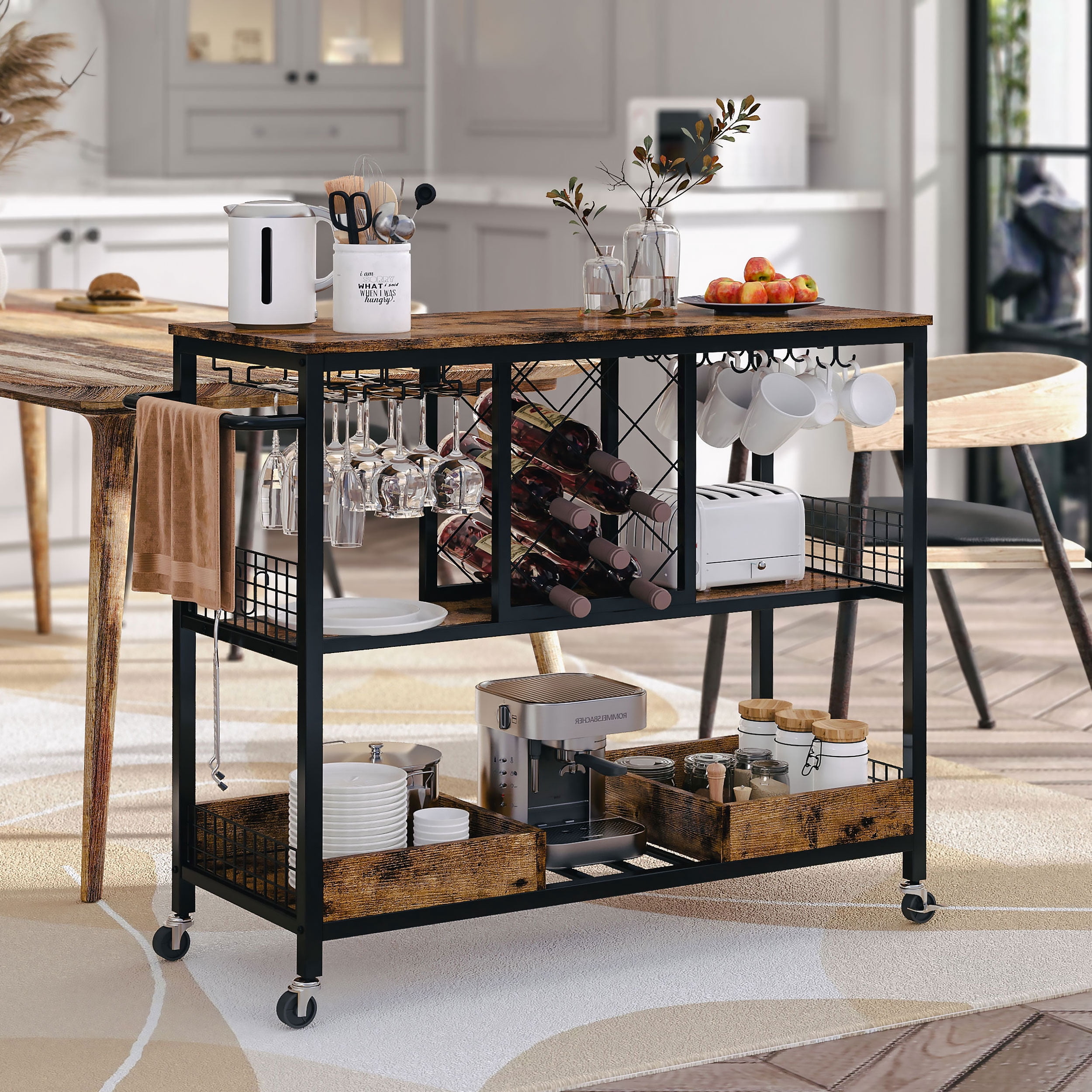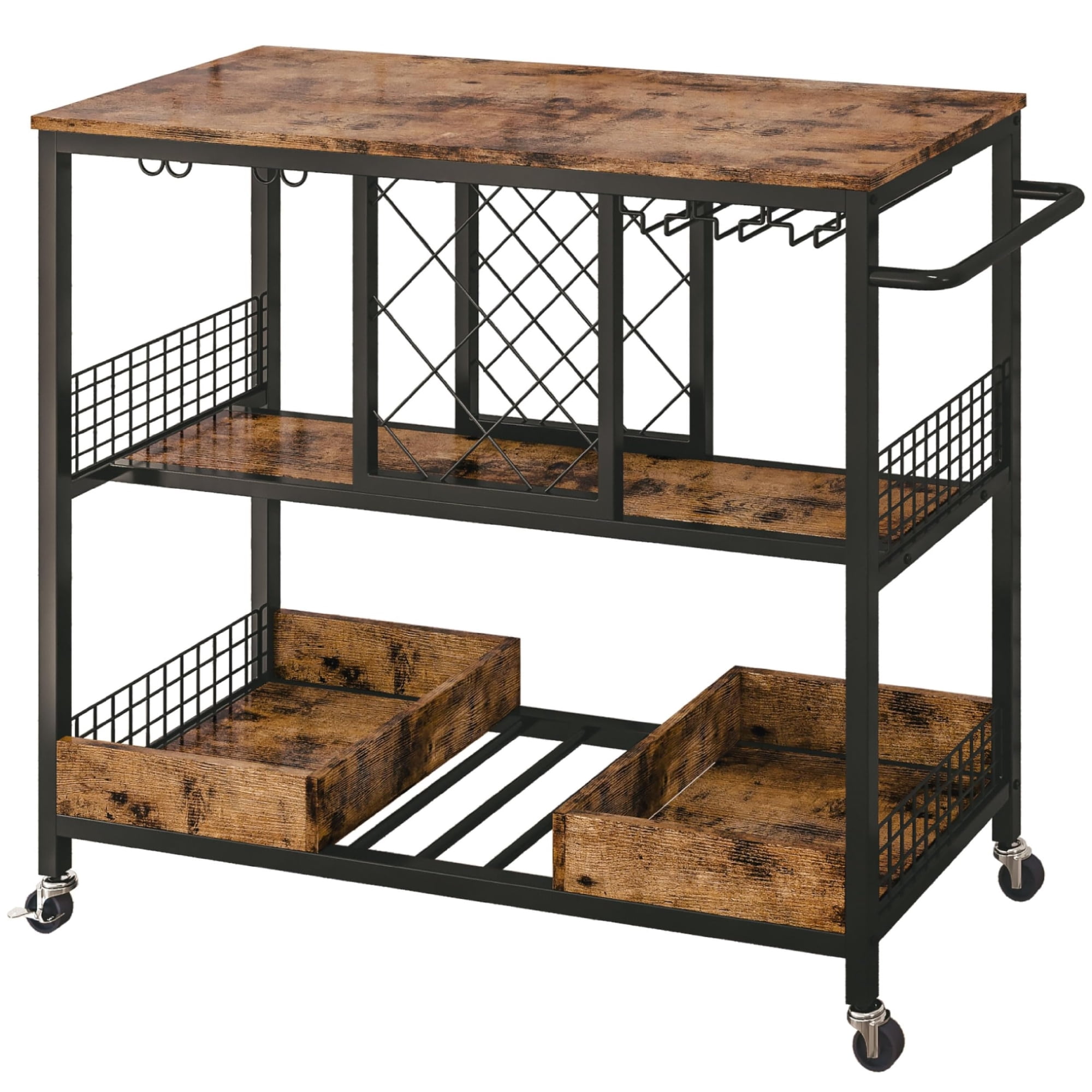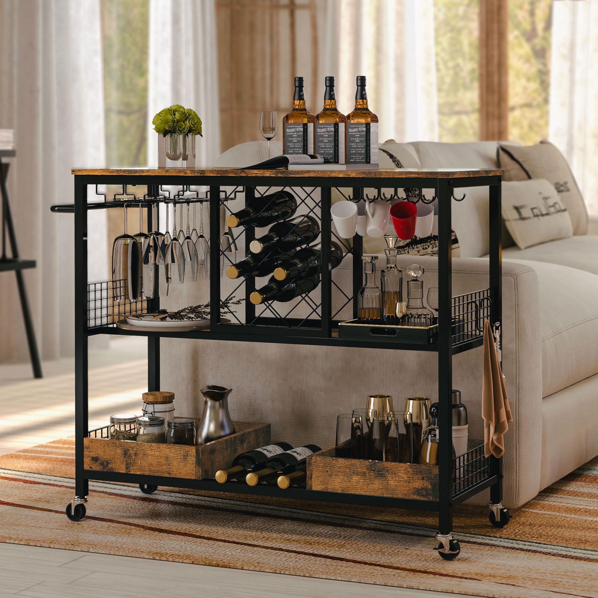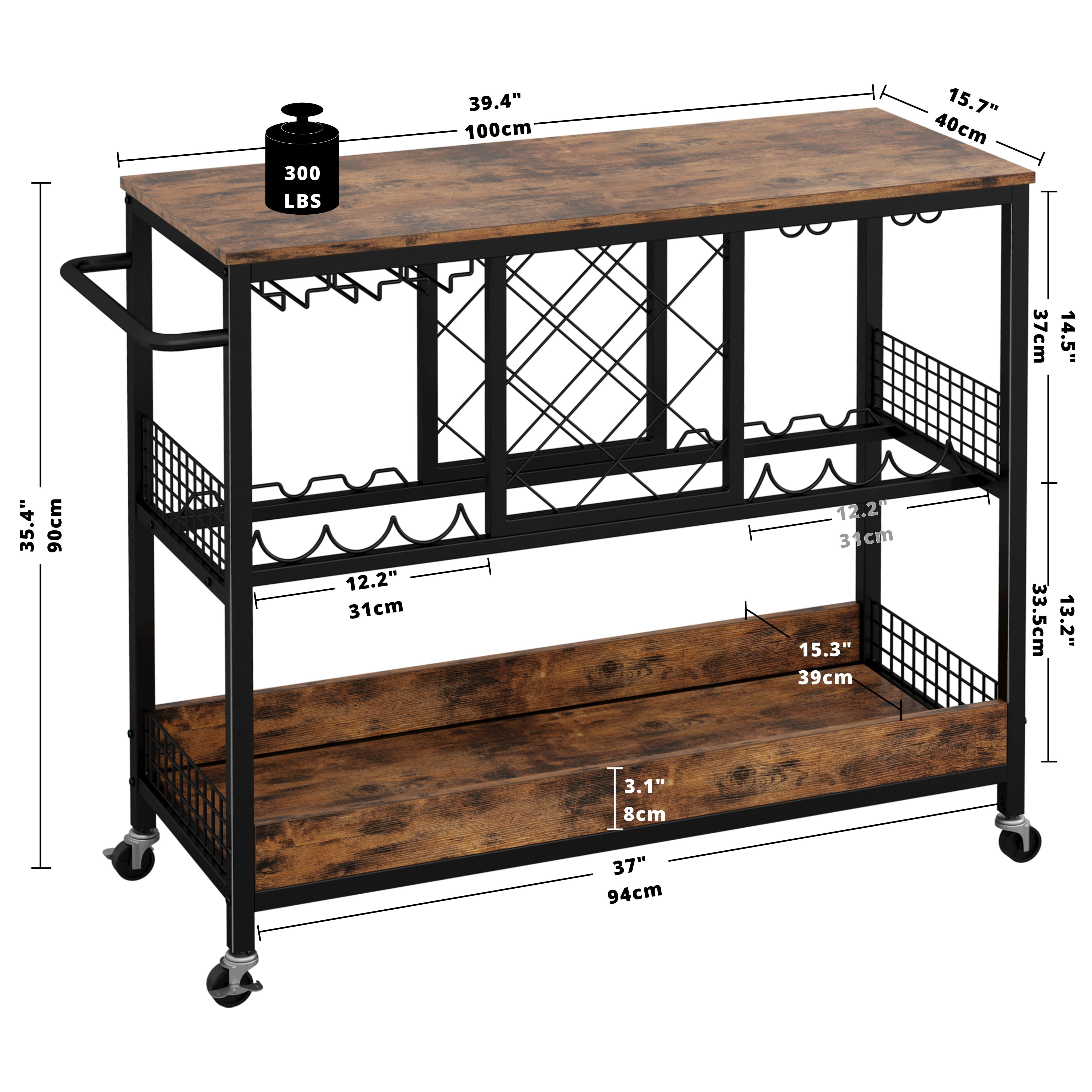 Constructed from a sturdy metal frame and high-quality MDF board, this bar cart is built to last. Featuring a combination of wine holder, tabletop, and wine glass holder, this bar cart is both efficient and durable, ensuring long-term use. With a maximum load capacity of 300 pounds, this serving cart can accommodate a variety of items. Equipped with 4 360° wheels, 2 of which have brakes, this bar cart is effortless to maneuver when serving your guests and won’t unintentionally roll away. The vintage brown wood-effect finish gives this bar cart a chic and glamorous look, making it a perfect fit for any desired location. Hardware and instructions are included for easy assembly of this bar cart.