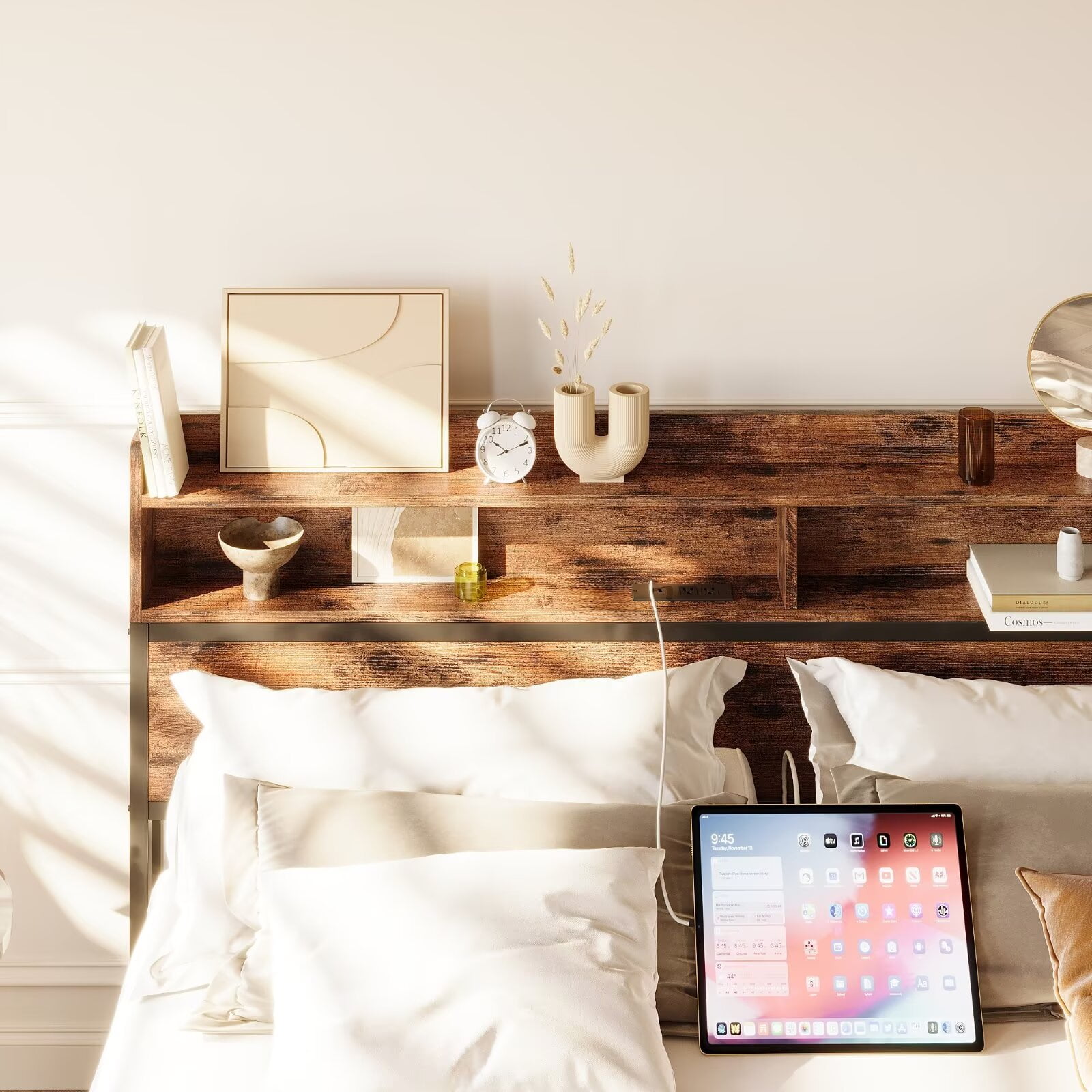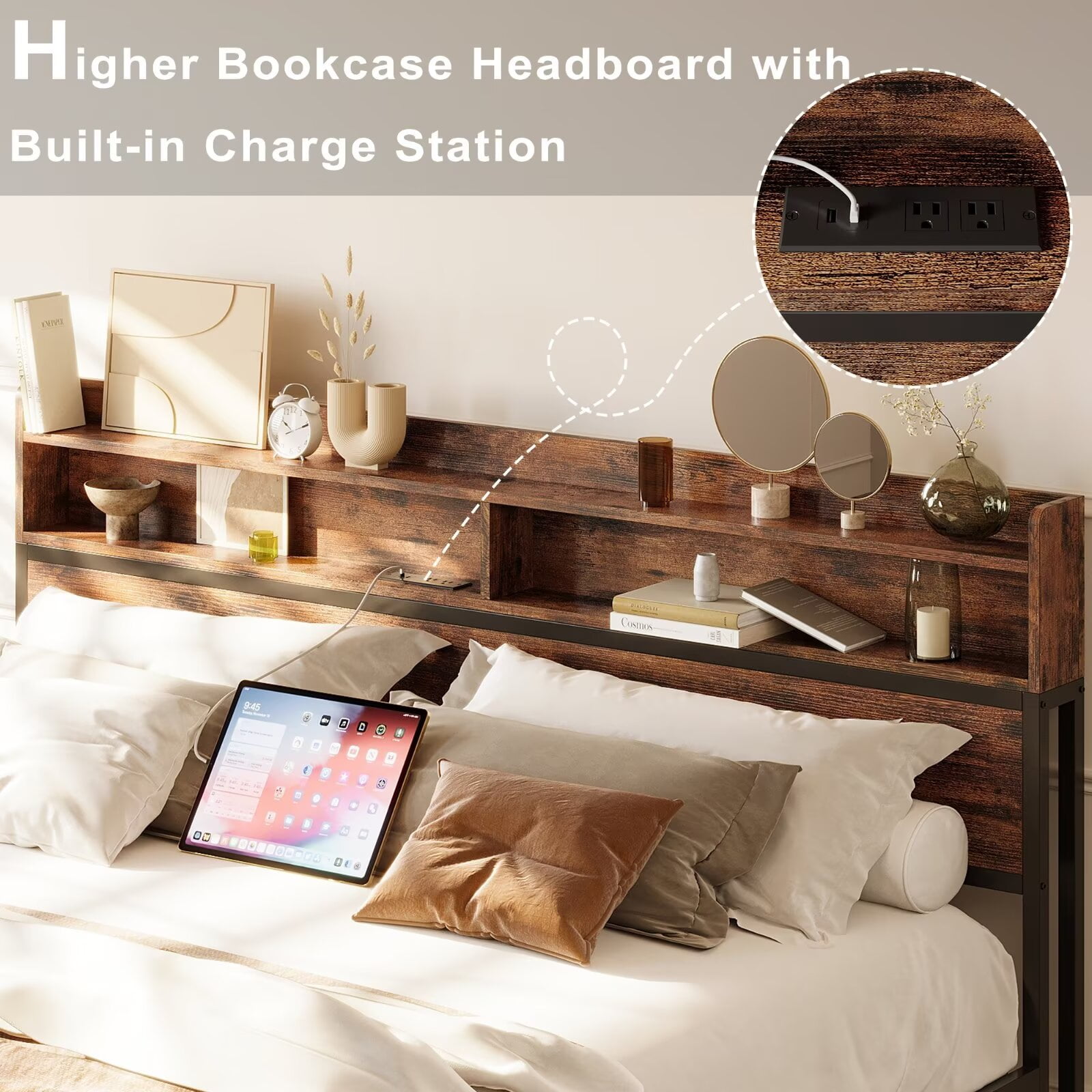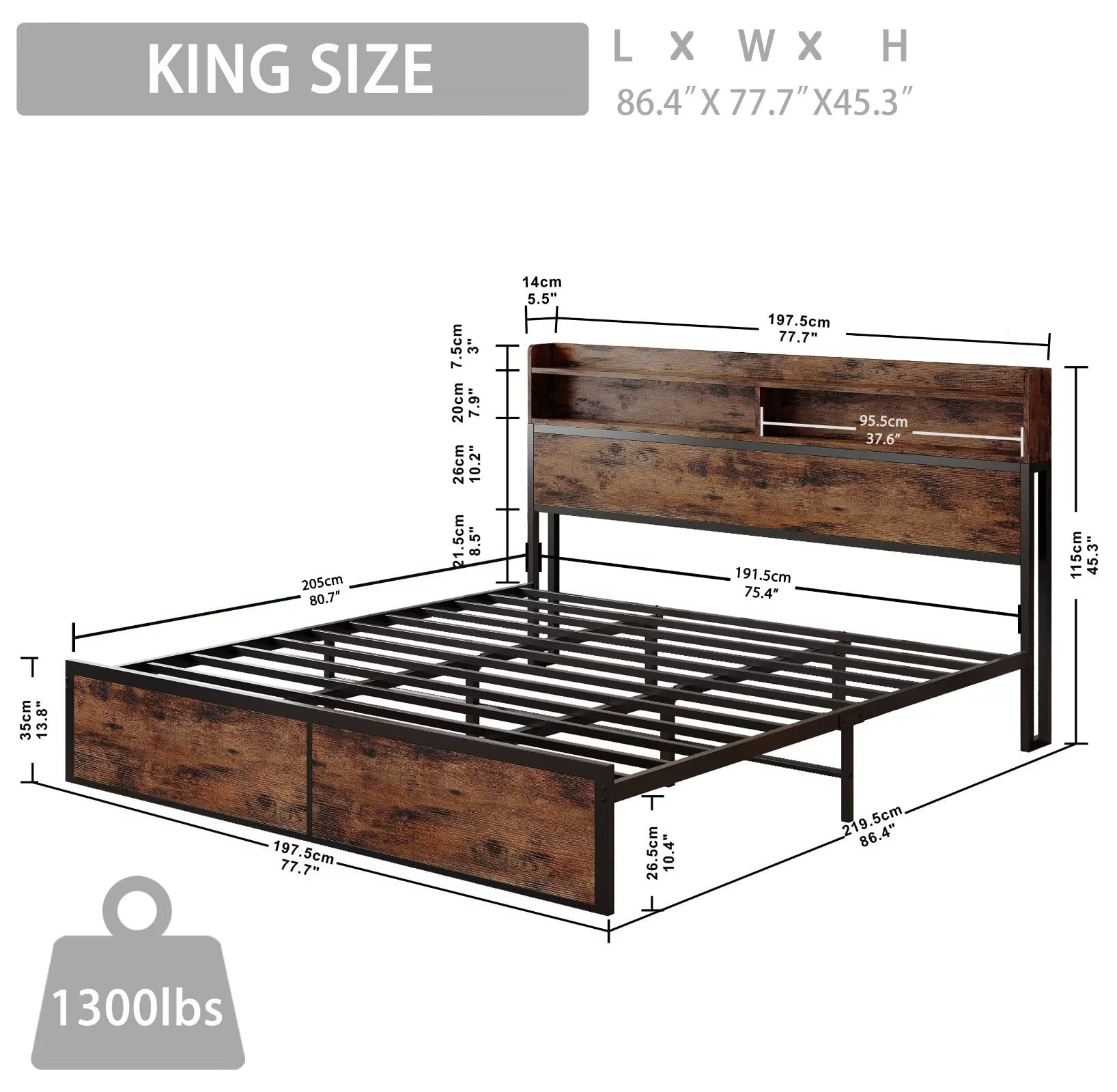 Dear customers, welcome to IRONCK. ★IRONCK furniture aims to create a simple life and a comfortable home for you. ★IRONCK King Size Bed Frame with Headboard,No Box Spring Needed | Charging Station | Bookcase | Vintage Brown ◆Elevate your sleep experience with the IRONCK King Bed Frame. Featuring a robust metal construction, this platform bed frame offers a reinforced support system with longer slats and extra crossbars, ensuring a stable and noise-free design that can support up to 1300 lbs. The built-in bookcase headboard provides convenient storage and charging capabilities, with 2 AC outlets and 2 USB ports to keep your devices powered. The frame is made from an all-metal support frame to give you stable support, which means no spring box needed. Silent cotton construction ensures no rattling during the sleeping. Enjoy ample under-bed space for storage, and pair this bedframe with a mattress between 8.5 to 12 inches thick for a comfortable and customized sleep setup.Crafted with attention to detail, this bed frame king size combines style, functionality, and durability to transform your bedroom. ◆Welcome to choose our king size metal bed frame. We have professional after-sales service to create the ultimate shopping experience for you. ◆Search Term:king bed frame/king size bed frame/bed frame king/king bed frames with headboard/king size bed frame with headboard/platform bed frame king/king platform bed frame/king bed frame with storage/king size platform bed frame/king bed frames/king size bed frame with storage/king platform bed frame with headboard/king size bed frames/king metal bed frame/king bed frame no box spring needed/king size metal bed frame/bed frame king size with headboard/bed frame king size/king bed frame metal/bed frames king/king size platform bed frame with headboard/king frame/king bed frame with headboard/metal king bed frame/king size bed frame metal/king size frame/king bed frames with headboard and storage/black king bed frame/king bed frame and headboard/platform/king bed frame/bed frame king metal/king size bed frame and headboard/king platform bed frame with storage/bed frames for king size/king metal bed frame with headboard/king bedframe/bed frames king size bed/bed frame with headboard king/king bed frame black.