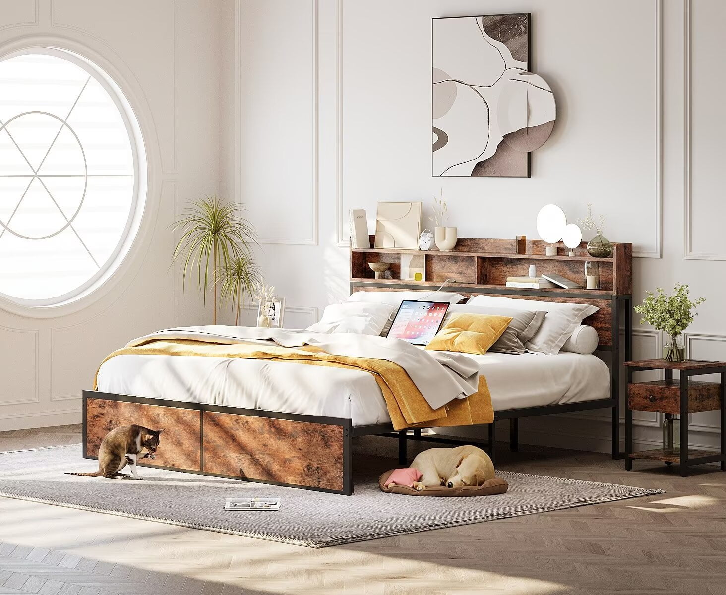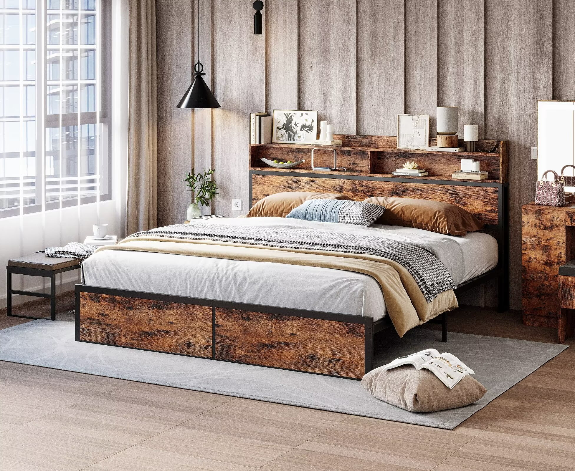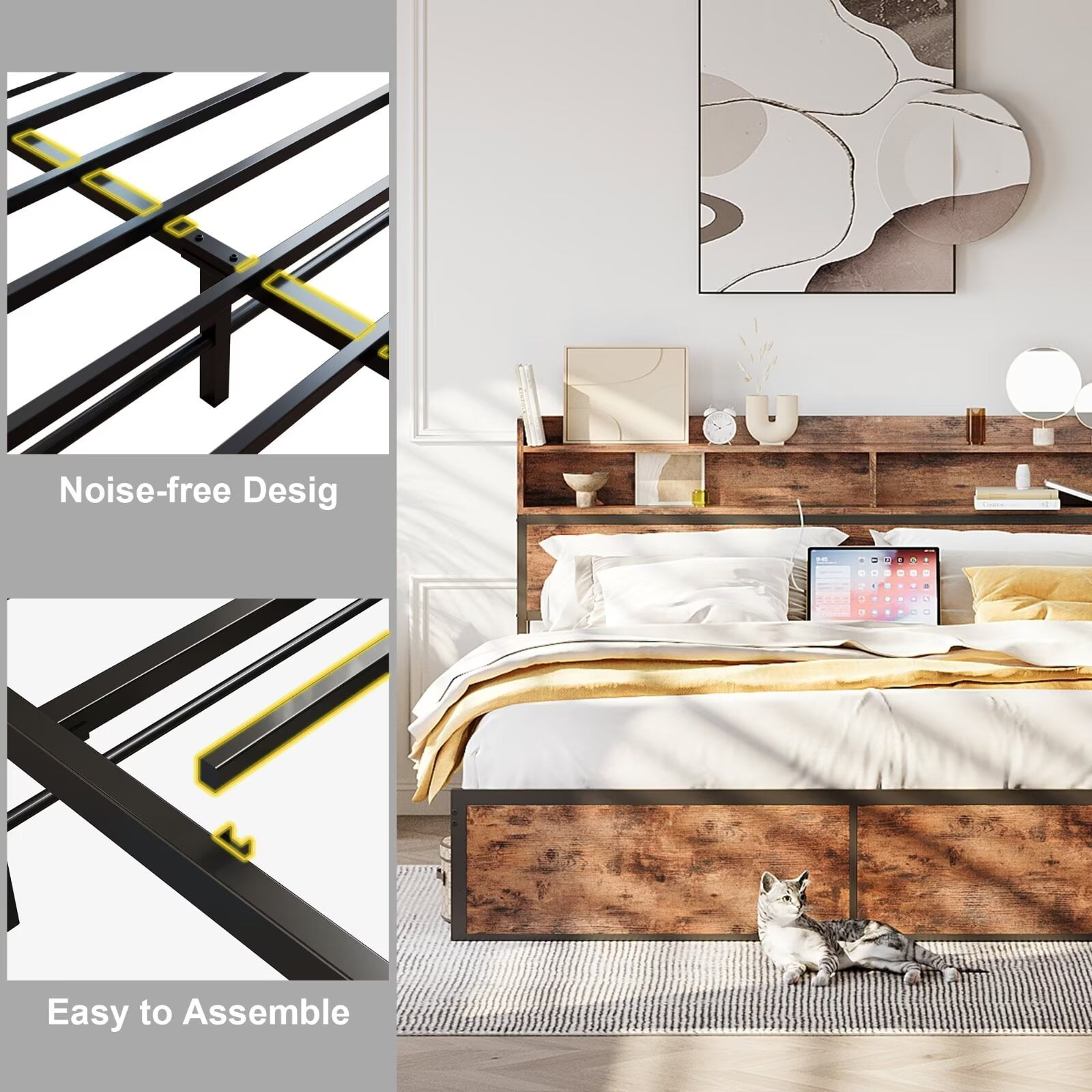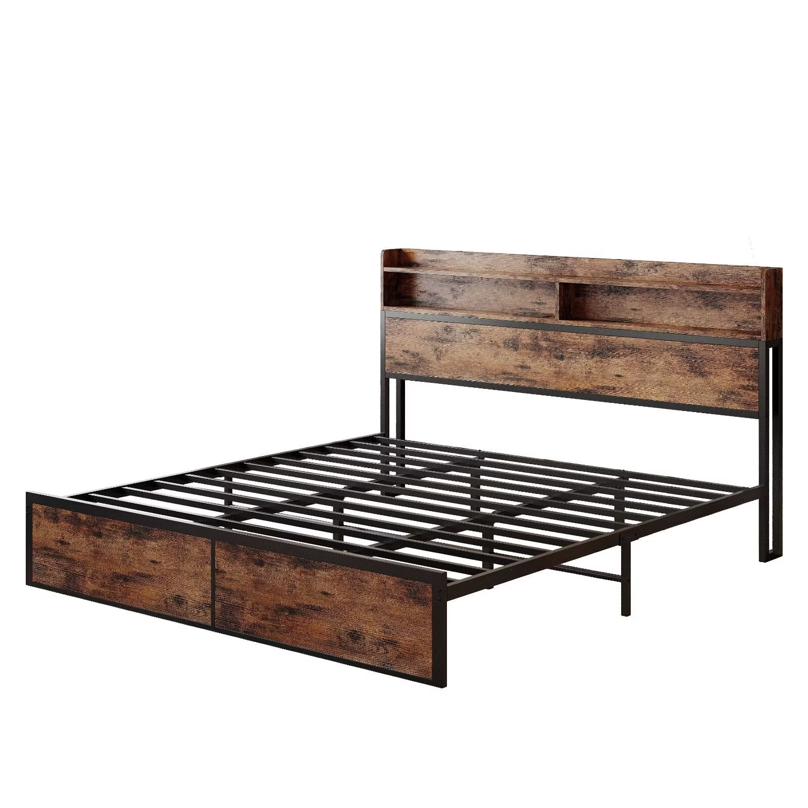 The combination of the headboard, footboard, and vintage brushed metal slats has a strong industrial/rustic look that adds a unique personality to your room. Enjoy a peaceful sleep with the IRONCK Queen Bed Frame, which features a solid metal structure, including longer slats and extra crossbars, designed to be stable and noiseless, and can support up to 1000 pounds. Stay connected easily with the integrated charging station equipped with 2 AC outlets and 2 USB ports, allowing you to power your devices and keep them at your fingertips while in bed. Maximize the potential of your room with the 2-tier wooden storage rack, which conveniently stores books and personal items, while also providing ample under-bed space for additional storage needs. No box spring required, just use a mattress between 8.5 and 12 inches thick, and you can easily create a stylish and functional bedroom. Our easy-to-assemble design allows you to enjoy a worry-free installation, with clear instructions, necessary tools and numbered parts, making the fully designed metal bed assembled within 60 minutes. We have a professional after-sales team to create a pleasant shopping experience for every customer.