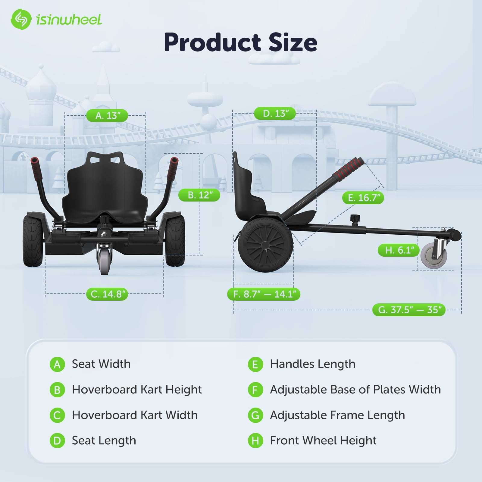 Turn your hoverboard into a safe and more fun go-kart. Suitable for 6, 6. 5, 8, and 10-inch self-balancing scooters. (NOTE: Don’t fit the hoverboard which has a bar in the middle & Hoverboard is Not Included) iscooter K3 hoverboard attachment has a 360° flexible swivel wheel and stable hand operation to provide power steering, which can help you control the directions super easily. Two handles can be used to control speed, braking, and turning, and you can also use the foot pads to control the direction of the hoverboard. Safer and Easier than on a hoverboard. Our hoverboard go-kart attachment has adjustable leg pedals from 27 inches to 35.5 inches. So you don’t have to keep buying new self-balancing karts because of their different heights, they will perfectly fit ages between 5-55 years. 】Our hoverboard kart includes all the necessary mounting gear like screws, wrenches, nuts, washers, and other spare parts required for assembling the hoverboard cart. Almost fully assembled, you can refer to the instruction manual, and within 5-8 minutes, it’s ready to go. 【The K3 hoverboard seat comes with 6 PCS free straps in case you need them, so you don’t have to worry about them breaking. It also comes with a one-year warranty.