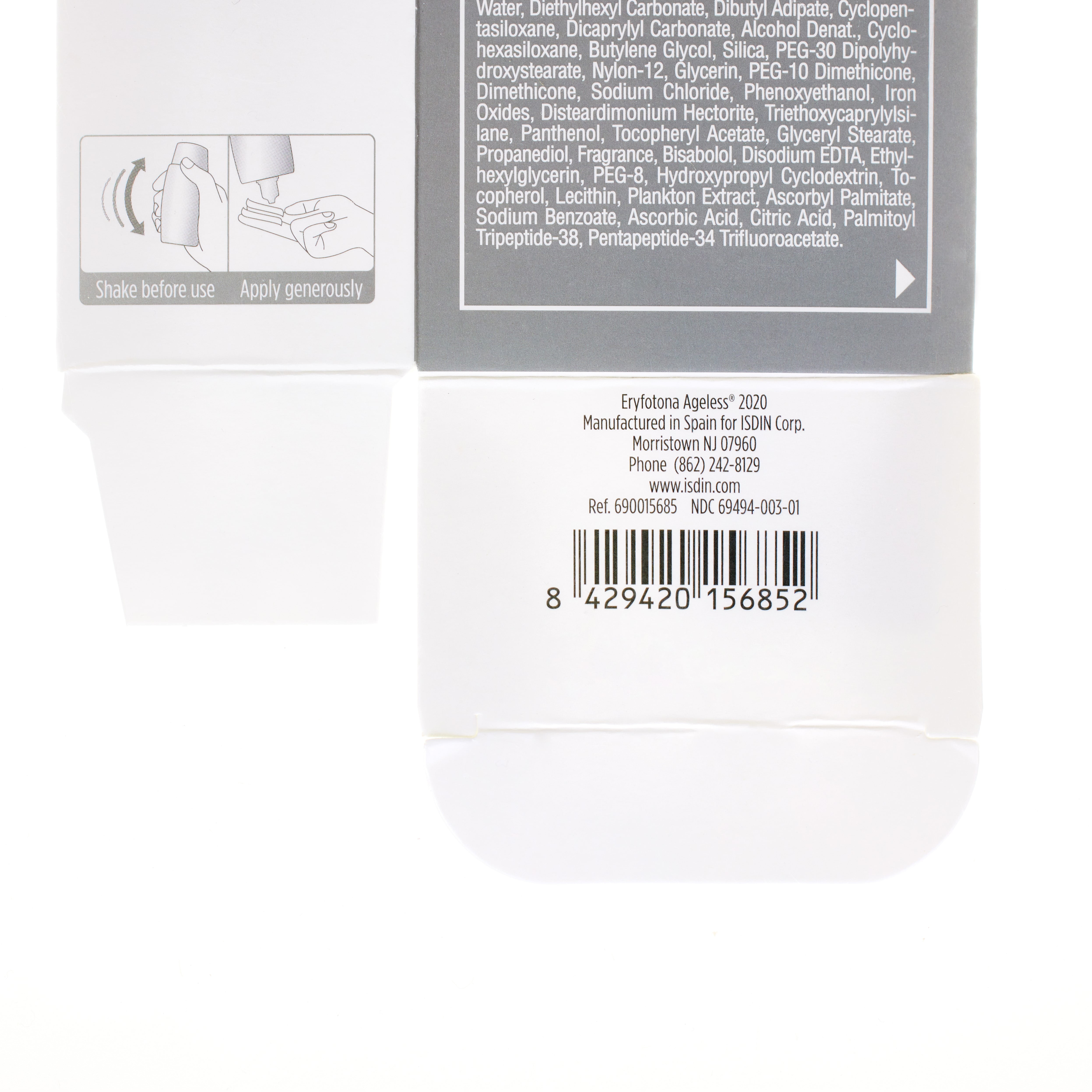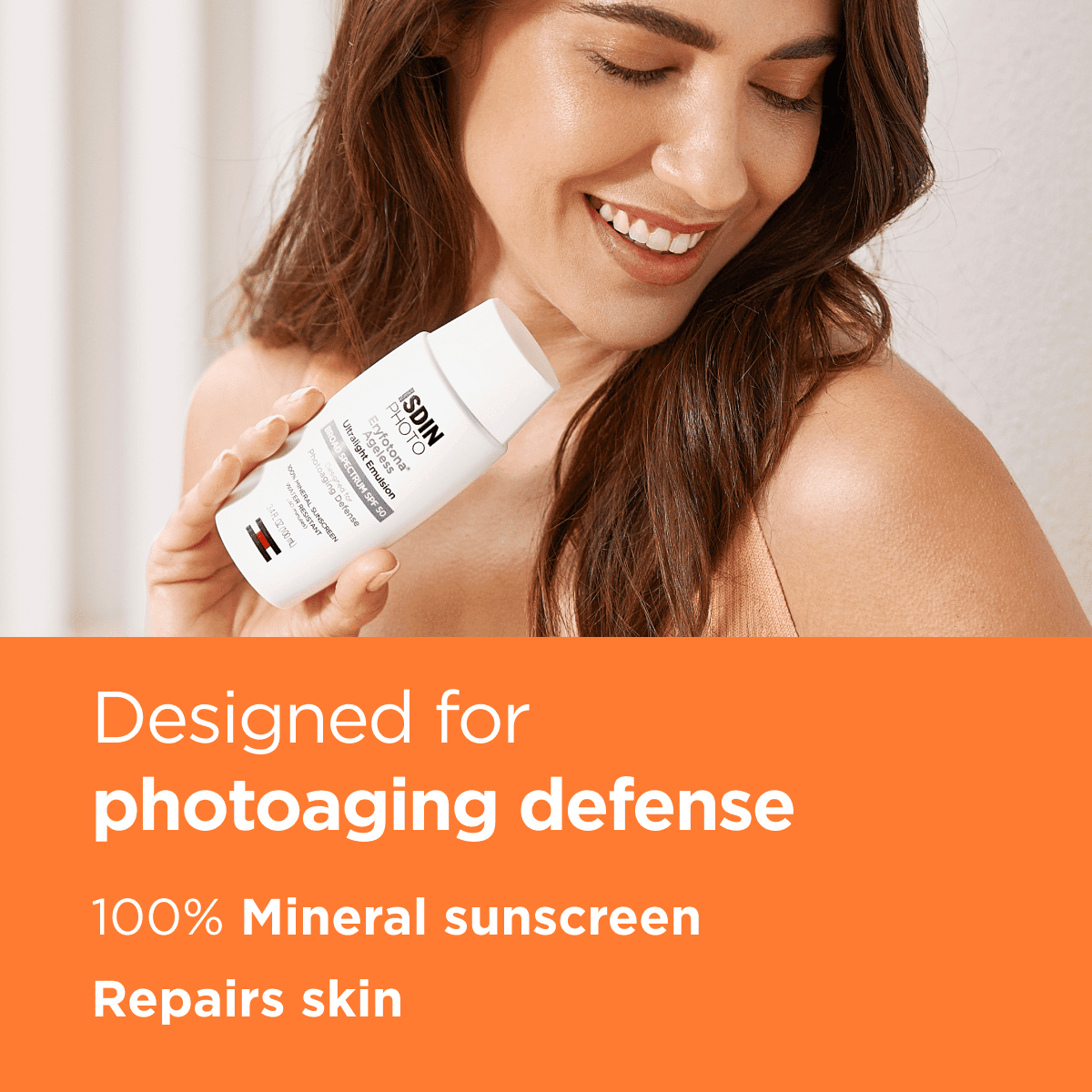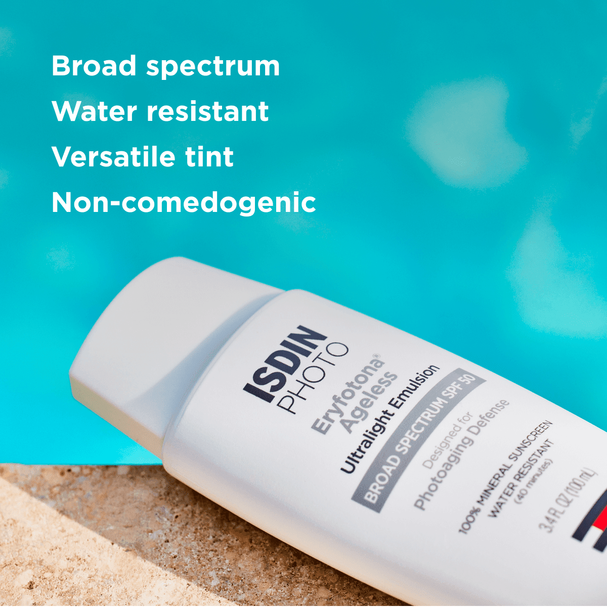 Protect, repair, and correct with ISDIN Eryfotona Ageless, an ultralight tinted sunscreen with zinc oxide which helps fight the signs of photoaging. Its innovative formula uses 100% mineral SPF 50 sunscreen, an innovative blend of peptides, antioxidants, and DNA Repairsomes to repair existing sun damage and reduce the appearance of fine lines and wrinkles.