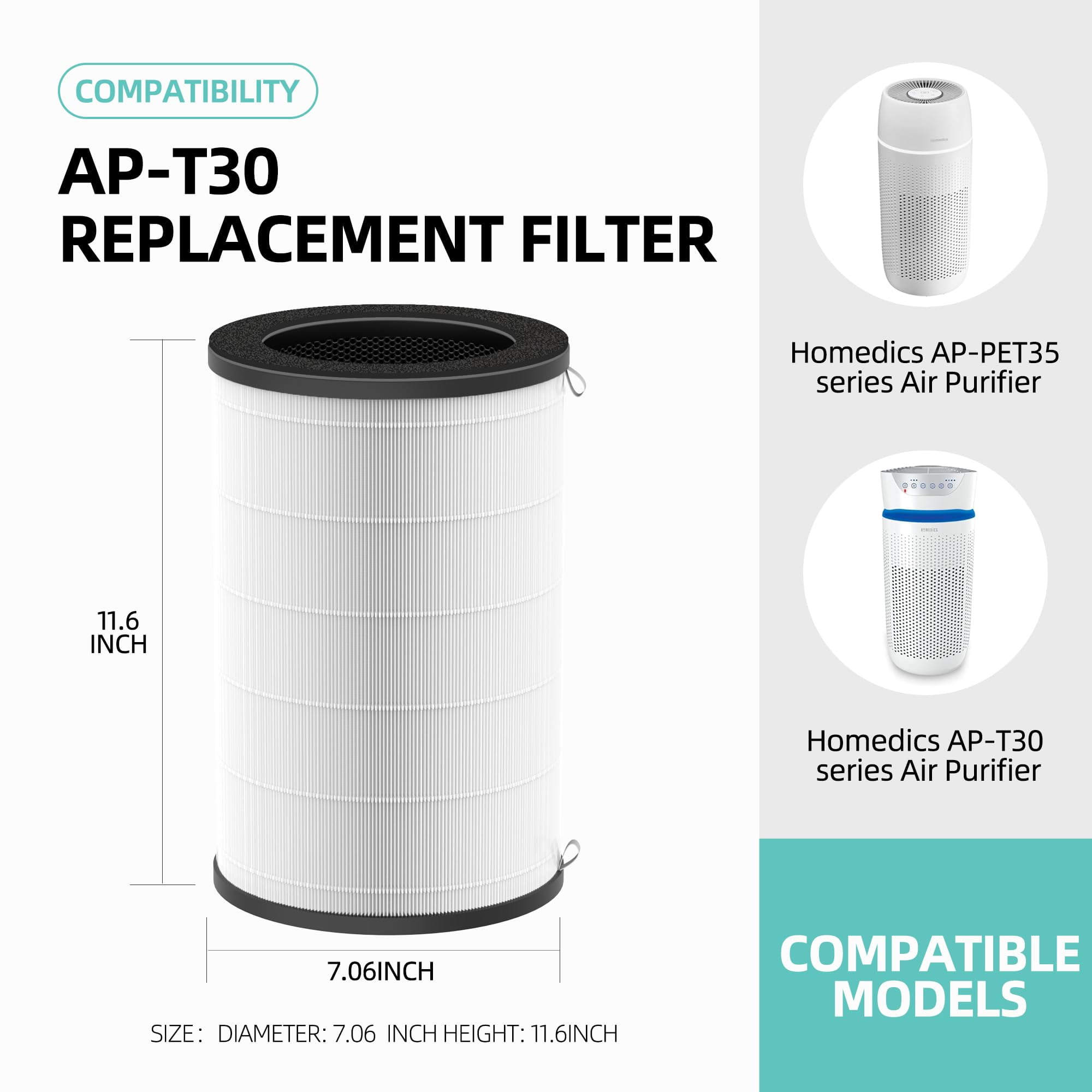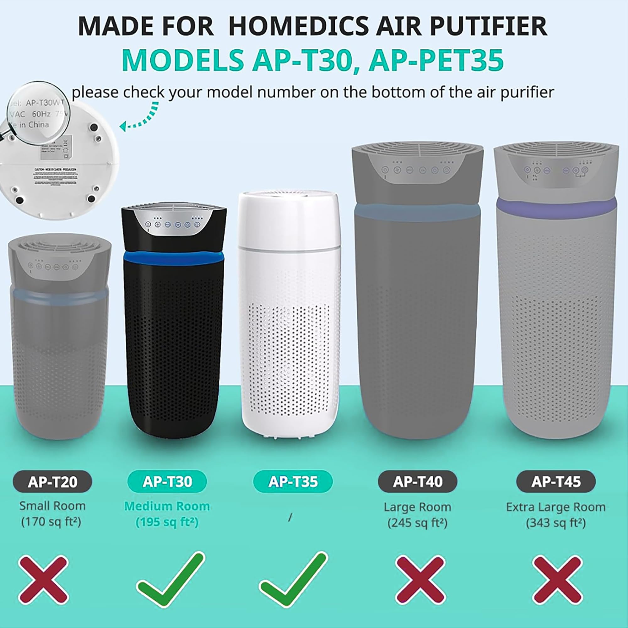 AP-PET35FL Filter is Compatible with Homedics Air Pu-rifier filter replacement, Homedics Air Pu-rifier TotalClean 5-in-1 Tower series AP-T30, AP-T30WT and Pet-Plus models AP-PET35, AP-PET35FL. Please confirm your machine model before buying to avoid an unpleasant experience