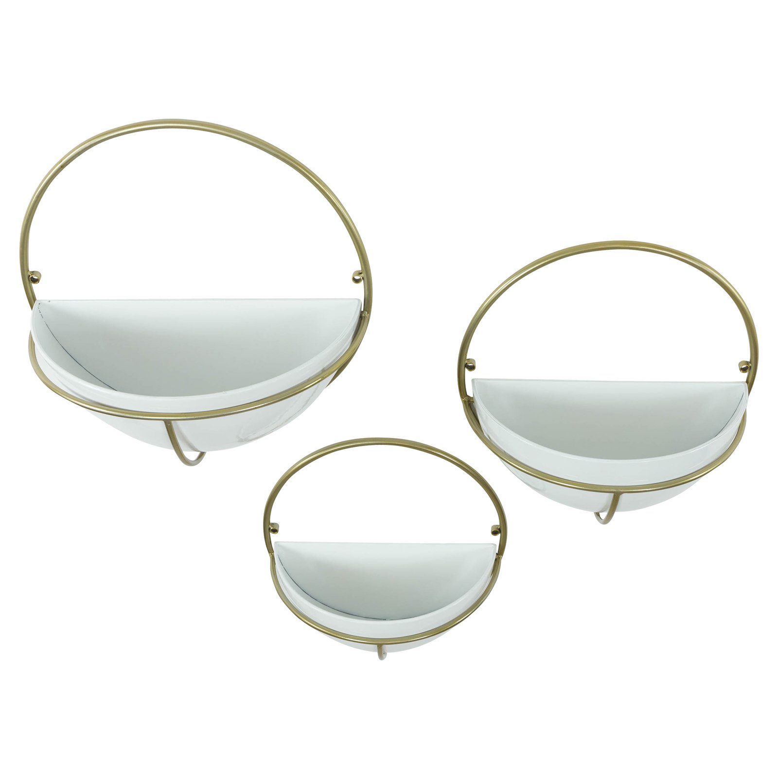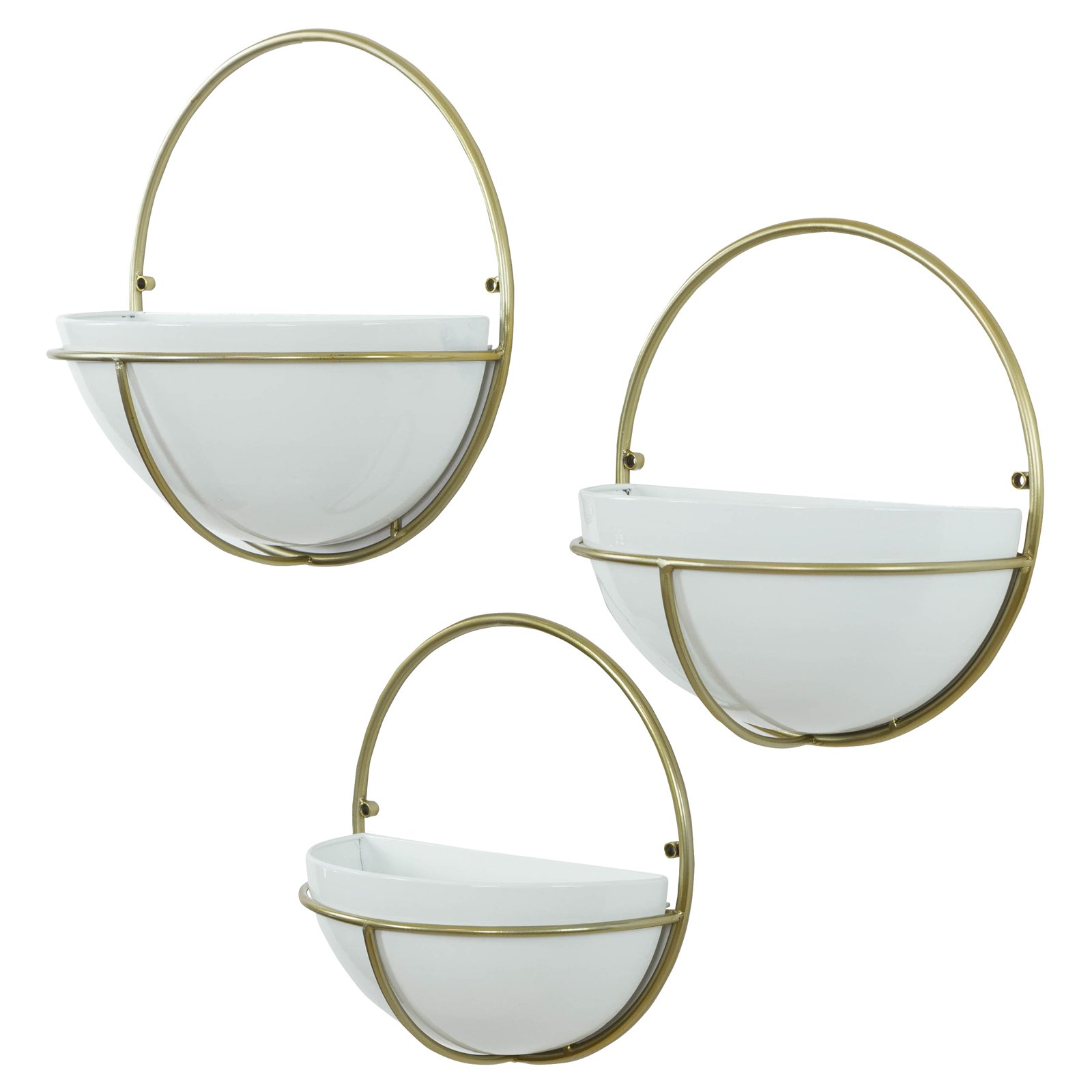 This trio of glossy white planters will add depth and interest to any modern space. Each planter is in a half-moon shape and set in a gold metal frame. Crafted entirely out of metal they re a chic piece that work with industrial mid-century modern or eclectic styles. Place your favorite faux plants or succulents inside then hang with ease. Features Pots and frame crafted entirely from metal White and gold finishes Glossy white planters Modern style Recommended for indoor use with faux plants Not for direct planting Set of 3Specifications Color: White & Gold Material: Metal Dimension 1: 13 H x 13 W x 6.5 D Dimension 2: 11.5 H x 11.5 W x 5.5 D Dimension 3: 10.5 H x 10.5 W x 5 D Weight: 5.5 lbs – SKU: ASPR1943.