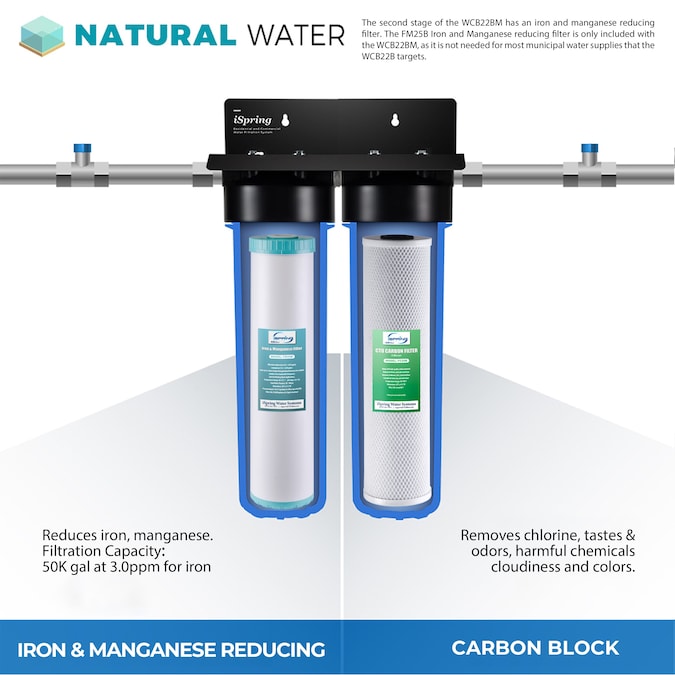 The WGB22BM whole house filtration system is an ideal inch point of entry” filtration system for cleaning up well water. Unlike inch point of use” systems (like reverse osmosis systems) that are installed to supply water to a specific faucet, the WGB22BM filters your water from the source. This means water from every output in your home will have passed through the two filtration stages of the WGB22BM. So what exactly do these two stages of filtration offer used as the first stage of defense on the system, the stage 1 housing holds a micron CTO coconut shell carbon block filter. Block carbon is more effective than other forms of carbon in that it is finely ground up carbon packed into a solidified block. This means they have a higher density than other types of carbon filters, and are therefore more effective in removing their targeted contaminants. The carbon block filter knocks out bad tastes and odors, removes over 90% of chlorine from the water, and is highly effective on organic chemicals (VOCs) like pesticides, herbicides, and industrial chemicals. The second stage of the WGB22BM has an iron and manganese reducing filter – also great for the plethora of heavy metals found in well water sources. The fm25b iron and manganese reducing filter is only included with the WGB22BM, as it is not needed for most municipal water supplies that the WGB22B22b targets. If you are on municipal (city) water or a generally clean water supply, you may want to consider the WGB22B over the WGB22BM. For removing the common contaminants and heavy metals found in the majority of well water supplies however, the WGB22BM fits the bill.