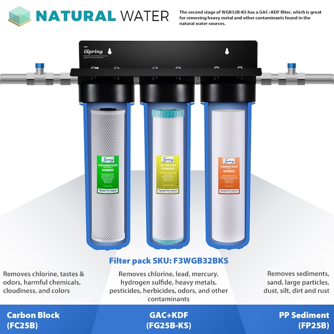 The WGB32B-KS whole house filtration system is a “point of entry” filtration system for cleaning up well water. Unlike “point of use” systems (like a reverse osmosis systems) which only filter water for a specific faucet, the WGB32B-KS passes all source water through a three stage filtration process before sending the freshly cleaned water to every part of your home. Each of the three stages of filtration offer a different level of protection. The first stage housing holds a 5-micron polypropylene sediment filter that removes dirt and various larger-sized particles from the water that can clog the following two filters. The second stage of the WGB32B-KS has a GAC+KDF filter designed to remove chlorine, lead, mercury, hydrogen sulfide, heavy metals, pesticides, herbicides, odors, and other contaminants from the water. The third stage of the WGB32B-KS houses a 5-micron CTO coconut shell carbon block filter that knocks out bad tastes and odors, removes up to 99% of chlorine from the water, and is highly effective on pesticides, herbicides, and industrial chemicals. The WGB32B-KS is ideal for removing common contaminants and heavy metals found in the majority of well water. If you are on municipal (city) water or another generally clean water supply, the WGB32B may be a better fit for you.