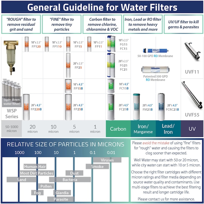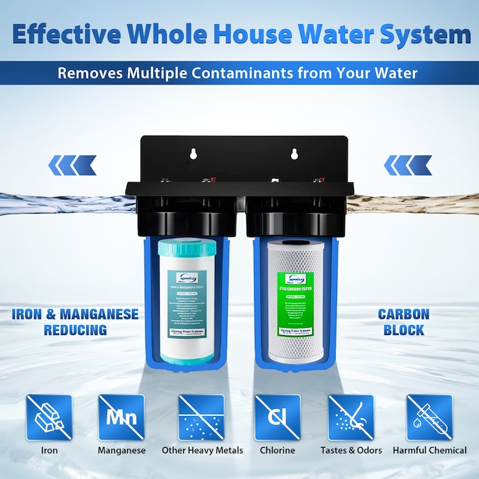 - Package Contents: 2-stage filter housing x 1; carbon filter x 1; iron manganese reducing filter x 1