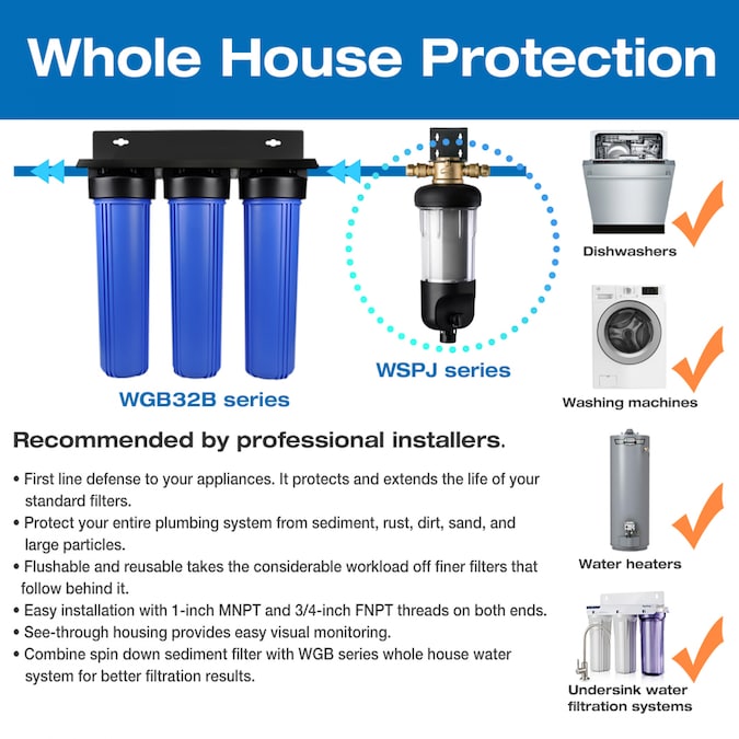 • Jumbo Size and High Flow Rate, designed for a more complicated well water situation, the WSP500J spin-down sediment water filter provides a 1-gallon capacity, which is 22 times the capacity of traditional sediment filters, the maximum flow rate of WSP500J is 25 GPM.