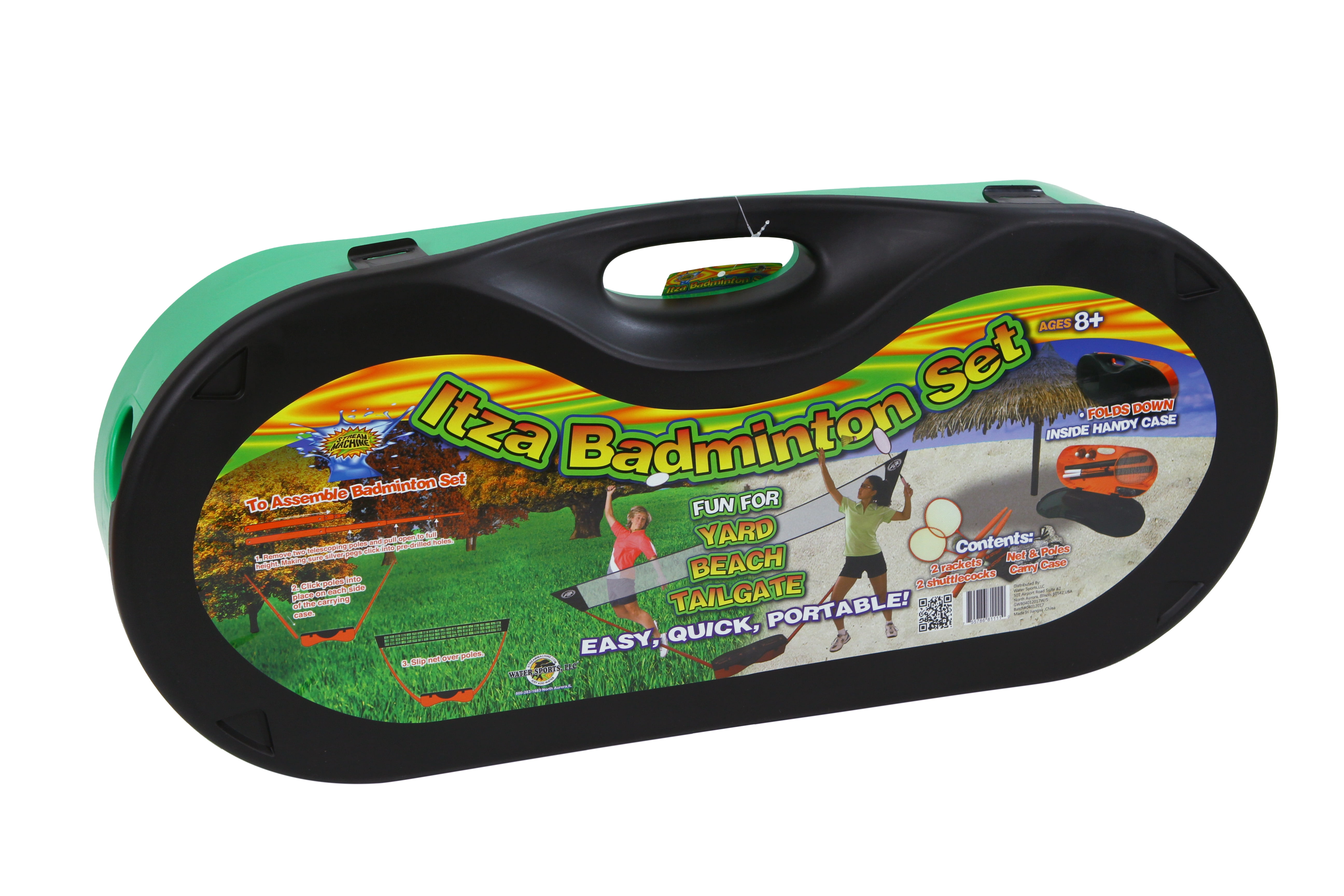 Portable badminton set is great for quick set up and take downs. Comes with everything you need for your badminton fun. Includes: 2 rackets, 2 shuttlecocks, carry case that doubles as the base, extending poles, and 1 net. Sets up in less than 2 minutes and breaks down even quicker. Great for the beach, backyard, tailgate party, can even be used in the pool. Recommended for ages 5 years and up.