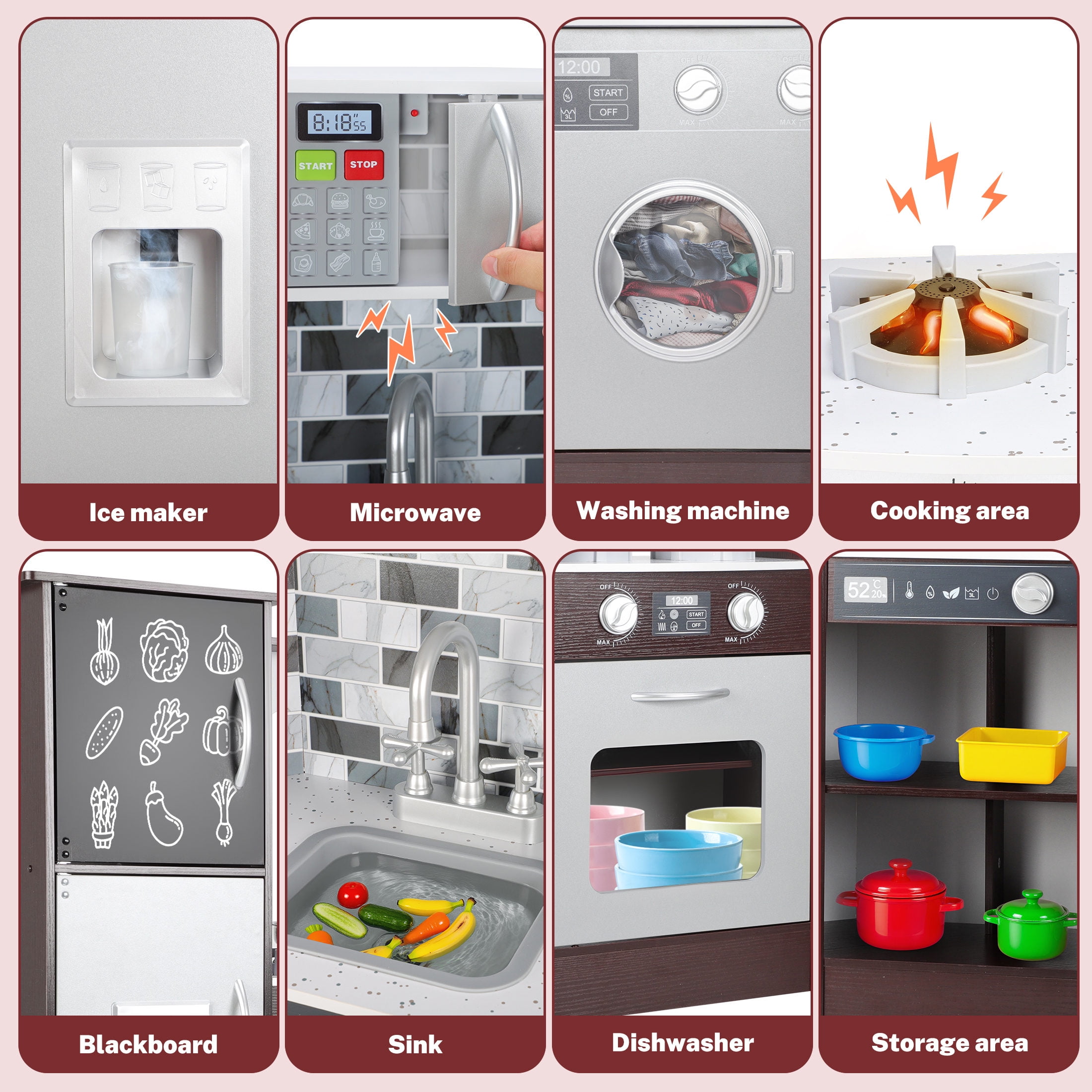 IMAGINATIVE GAMES- Unlock your child’s imagination with our Iyofe Corner Game kitchen set! Modeled after a real kitchen, it boasts lifelike functions and accessories. Watch as your little one hones creativity, hand-eye coordination, and logical thinking. This wooden toy set grows with them, fostering endless playtime joy. WITH LIGHTS AND SOUNDS- The Corner Play Kitchen features engaging lights, sounds, and interactive functions that will captivate your little chefs. The stove, microwave, and phone light up and make sounds, knobs click, and the ice maker produces fake ice cubes. With the included pot and spatula, your child will enjoy a realistic role-playing experience. SPACE-SAVING DESIGN- The L-shaped design of this kid’s kitchen is perfect for corner placement, saving wall space while providing ample room for multiple children to play. Fully functional shelves and cabinets with open-and-close doors offer plenty of storage for all iYofe kitchen accessories. It even includes a washing machine and blackboard. This toddler kitchen will be a fantastic addition to your children’s playroom. SAFE AND SECURE MATERIAL- This corner kitchen toy set is made of solid MDF material, ensuring stability and durability. Coated with child-friendly paint, it allows your children to play carefree. Rounded corners provide extra safety, protecting your child from harm. EASY-TO-ASSEMBLE KITCHEN TOY GIFT- Assembling this kids’ kitchen is a breeze! Clear instructions with labeled accessories make setup a snap. It’s the perfect gift for boys and girls aged 3 and up, ideal for Christmas, Thanksgiving, or birthdays. FUNCTION DISPLAY: Ice Machine Blackboard Microwave Oven With Sound And Light. Oven Stove With Sound And Light. Rotatable Faucet Washing Machine Mobile Phone With Sound And Light CCESSORIES INCLUDED: Pan*1 Cooking Pot*1 Slotted Spoon*1 Spoon*1 Shovel*1 Mobile Phone*1 Curtain Wall*1 Cup*1 Ice Cubes*3
