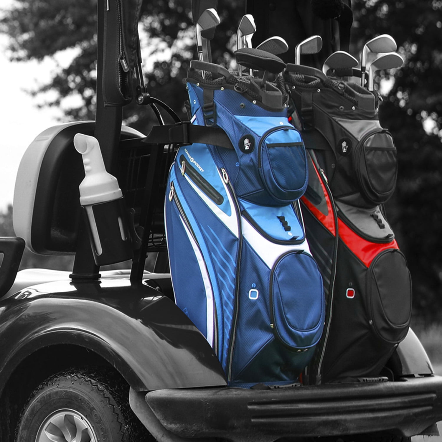 The IZZO Golf Gemini Cart Bag combines organization, storage, and practicality. The Gemini includes the same convenient features and pockets on both sides of the bag… meaning access to your bag is not limited or restricted regardless of which side of the cart your bag is positioned at. This golf cart bag is perfect for the golfer who prefers to ride. The Gemini is specially designed with every feature you would want out of a golf cart bag. It comes with a full 14-way club dividers, so you can separate each club. Every IZZO Golf Bag comes with FREE PERSONALIZATION, simply remove the magnetic ball pocket and return it to IZZO Golf. The IZZO Gemini Cart Golf Bag comes in your choice of Red, Green, Black or Blue.