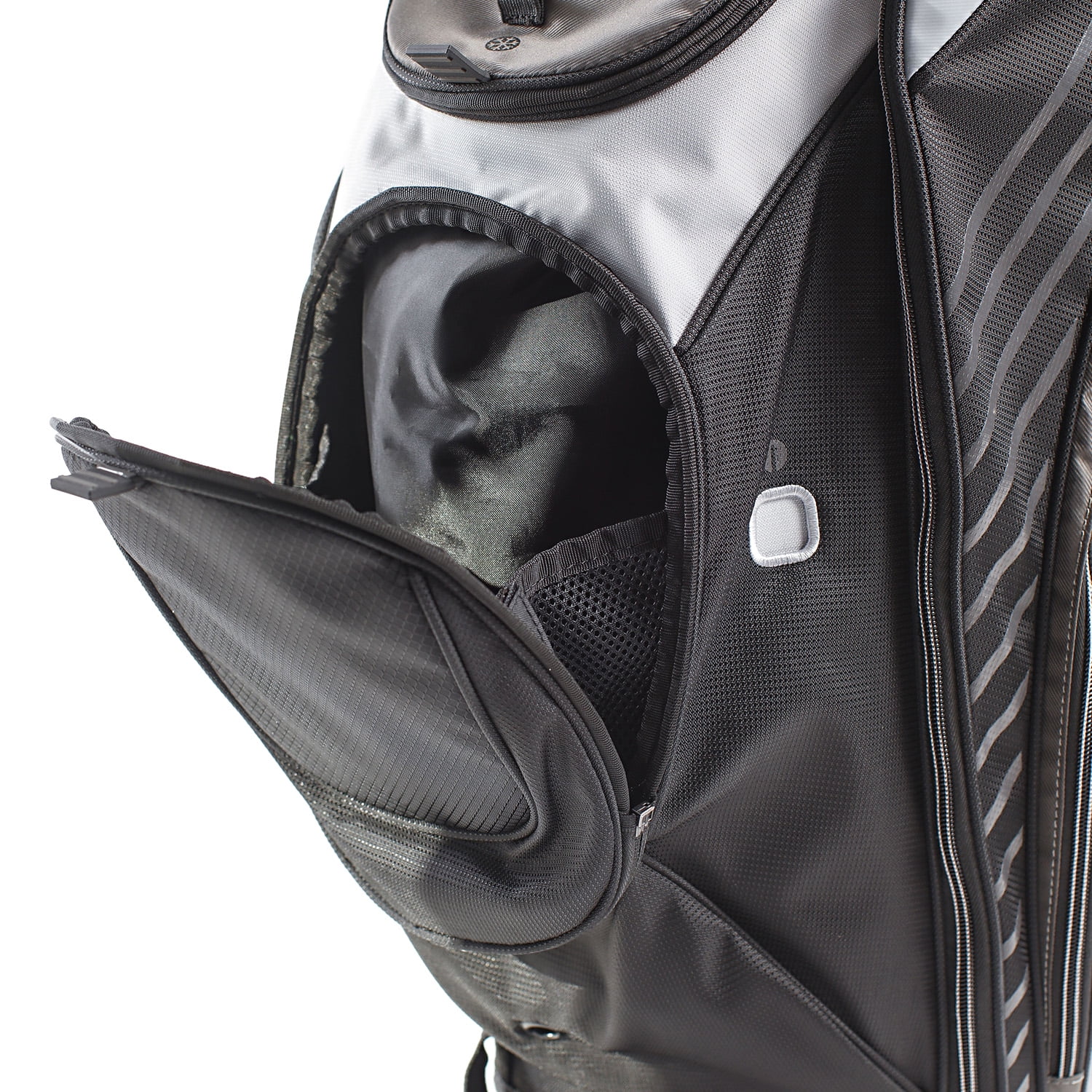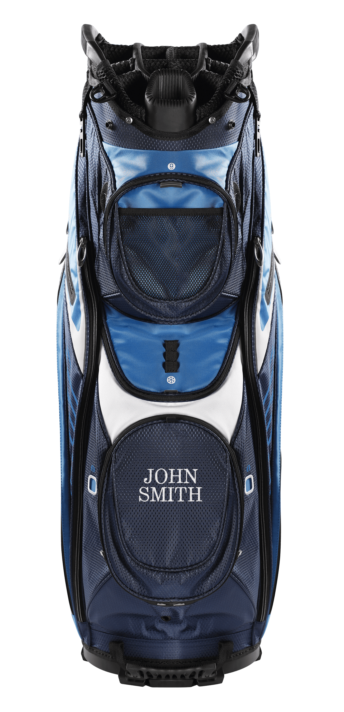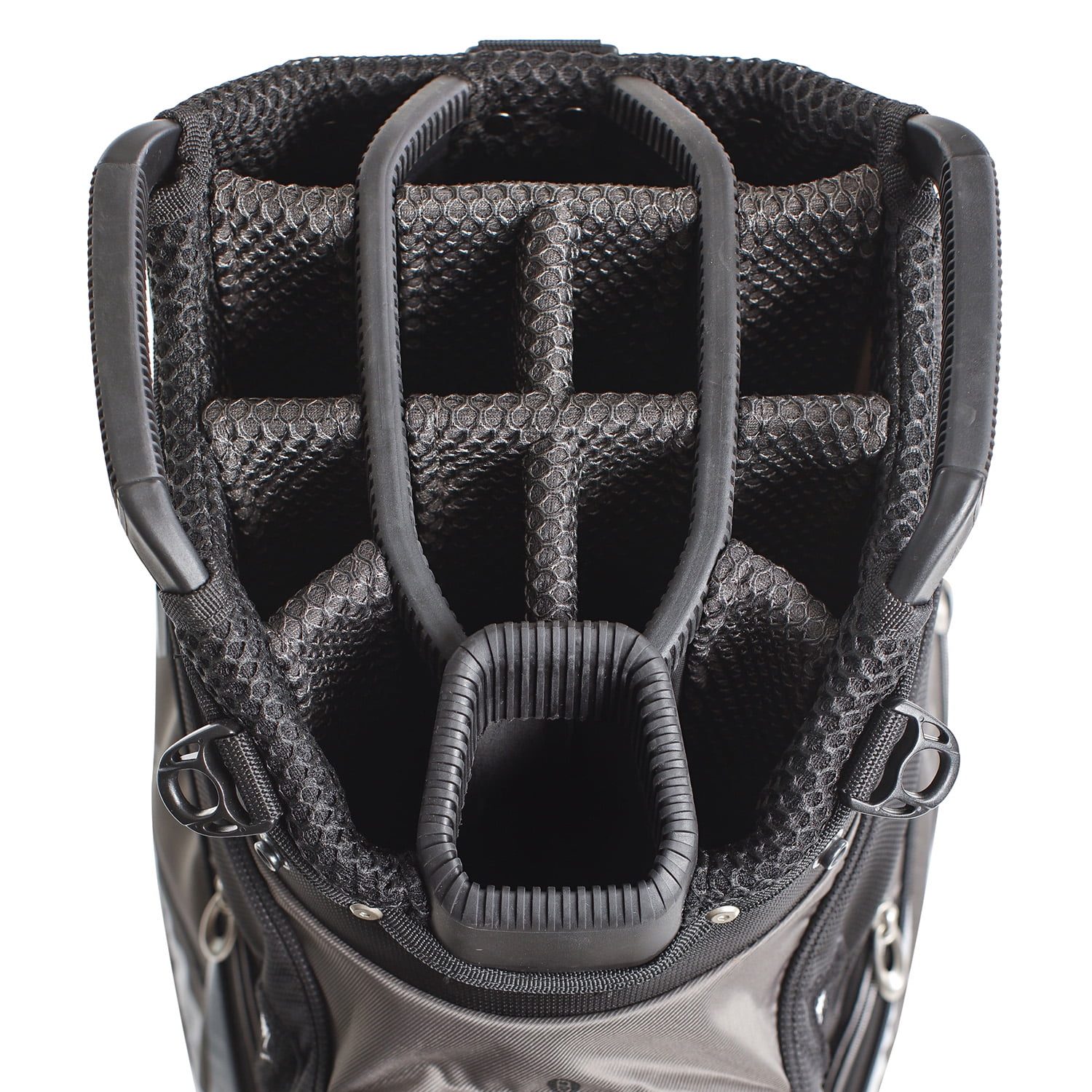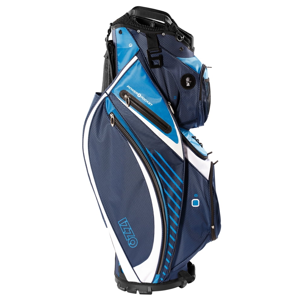 (14) full length club dividers keep your clubs separated and protected Heavy duty nylon construction ensures long lasting durability (3) easy open/close magnetic pockets and (2) velour-lined, water-resistant valuables pockets Includes dual Velcro glove holders, metal towel rings with built in bottle openers and umbrella holders FREE PERSONALIZATION (ball pocket) – mail provided form into Izzo