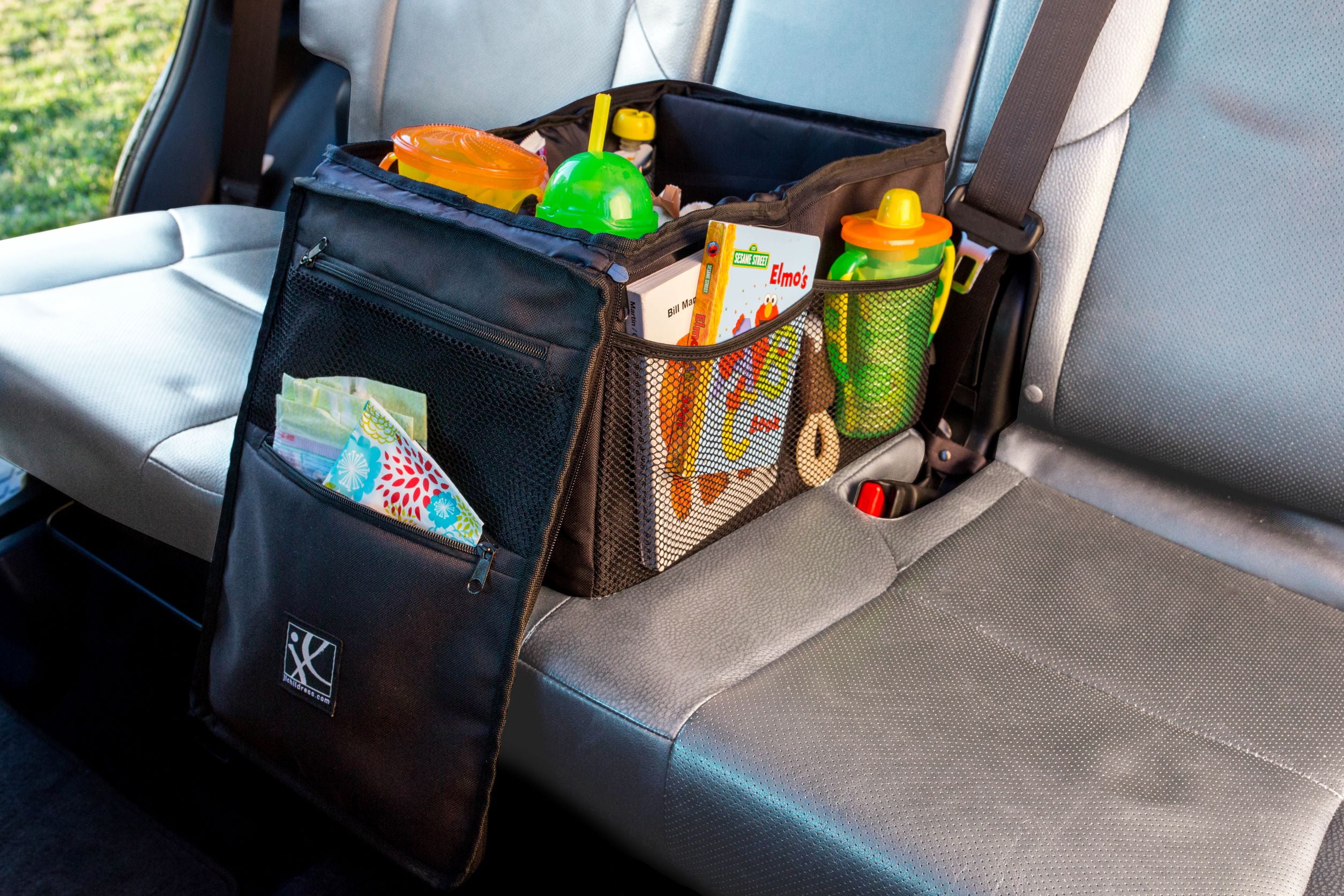 J.L. Childress Back Seat Organizer. Extra large, sturdy car organizer with solid sides for stability Attach directly to your car seat with adjustable buckle Features two cup holders with wipeable, easy-to-clean lining 10 total mesh and zippered pockets with an extra large main compartment Parent panel folds forward and provides accessible pockets Dual carry handles Conveniently fits on the back seat of your car or on the floor between bucket seats
