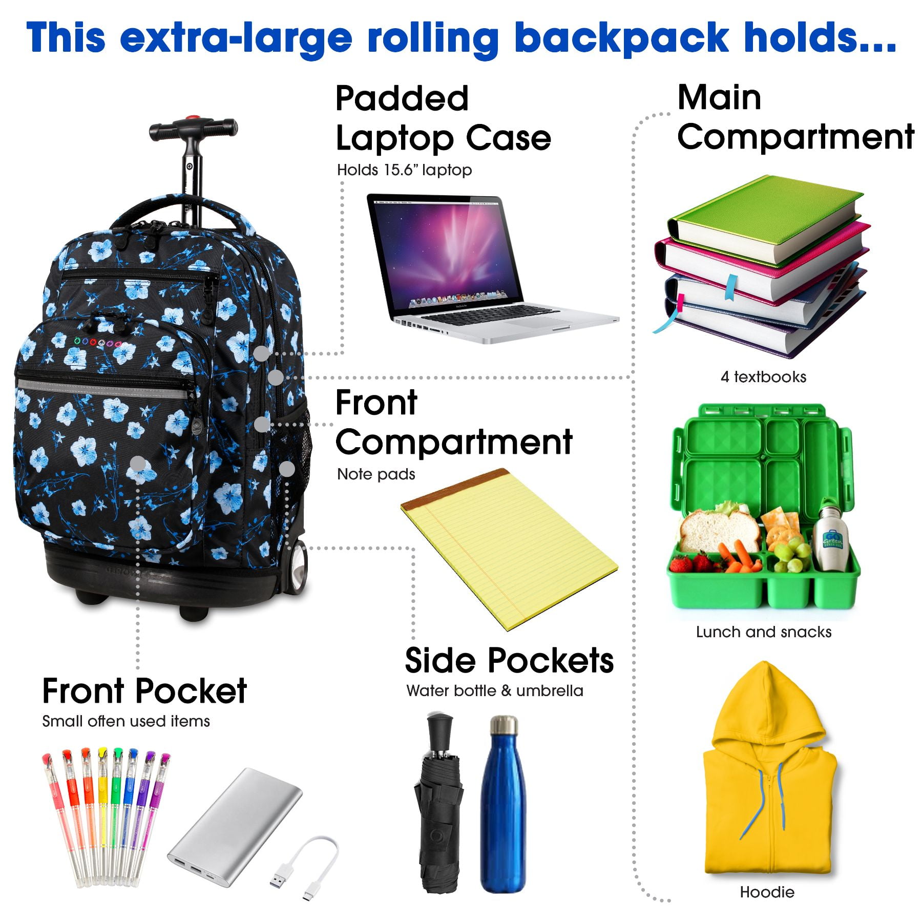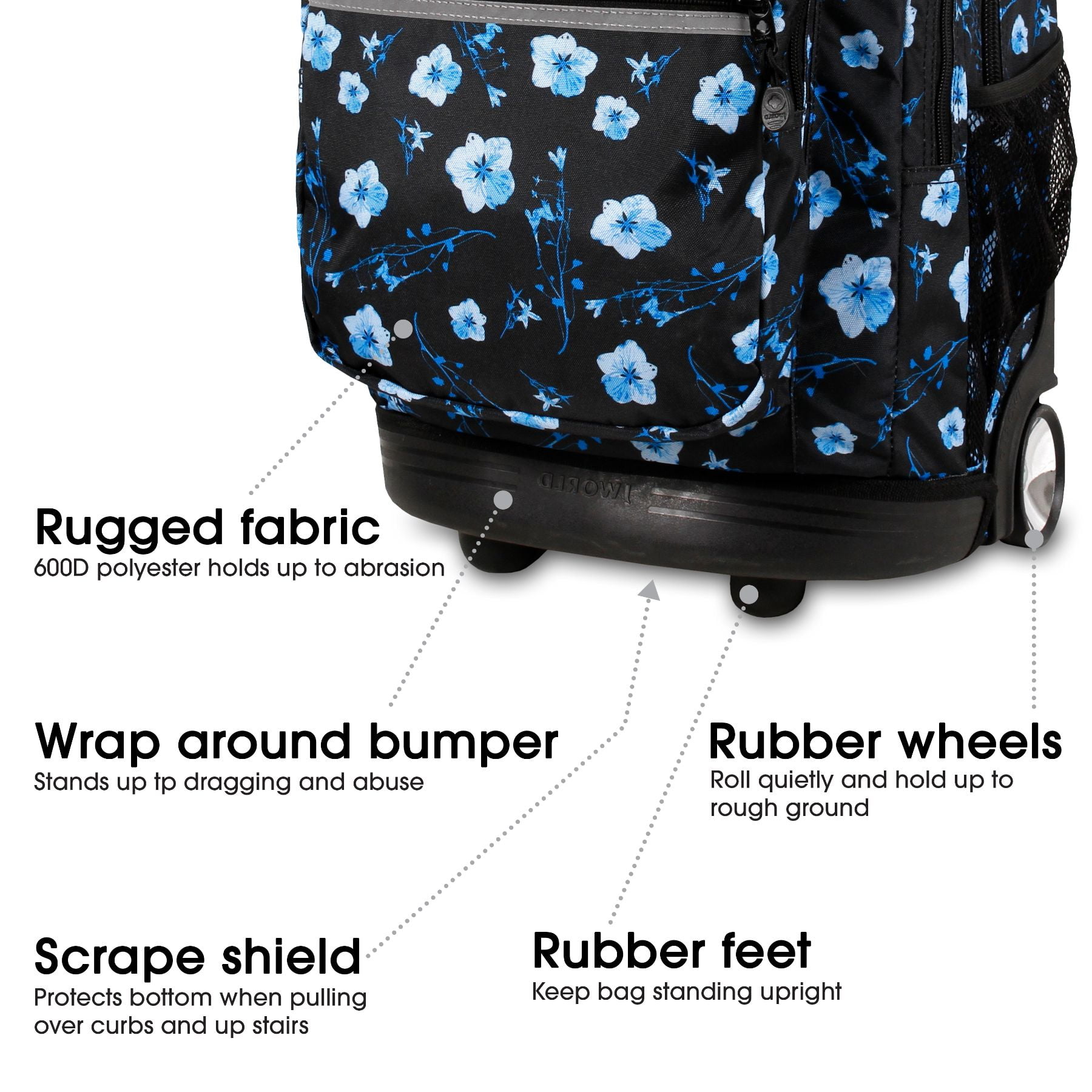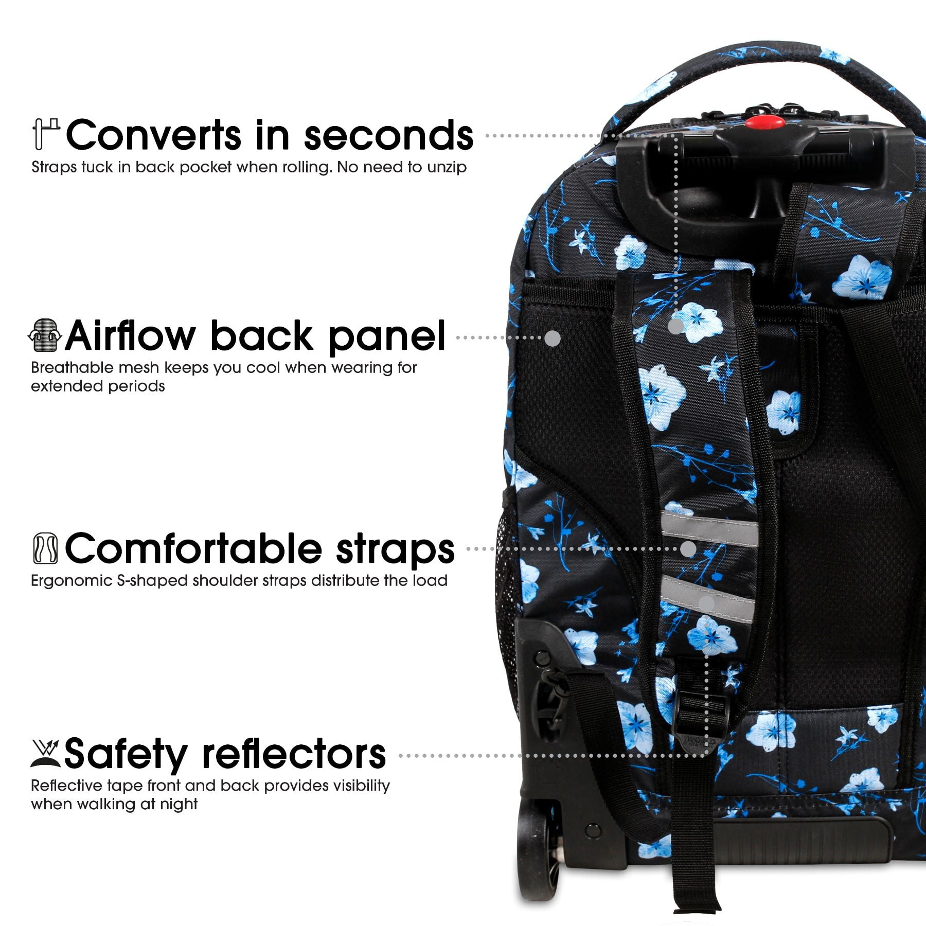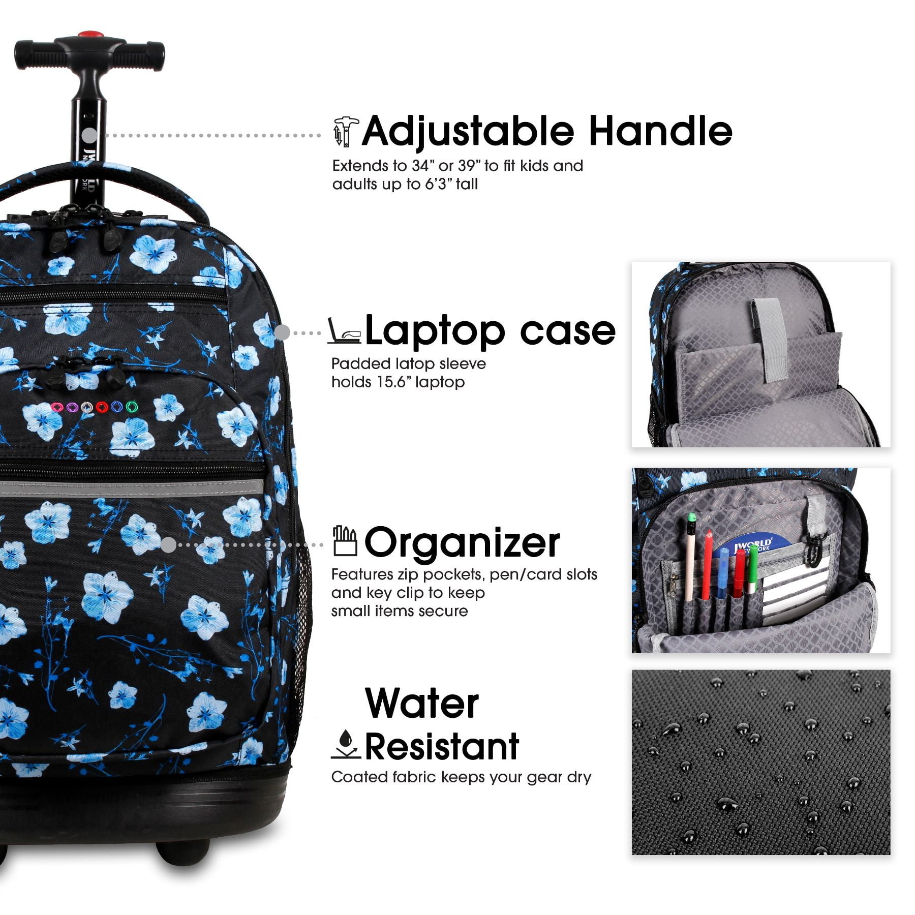 ROLLING BACKPACK: Convertible wheeled backpack offers the load carrying ability of a rolling bag with wheels and the portability of a school backpack. HUGE CAPACITY: Easily carries a computer laptop, 3″ binder, 3 college textbooks, notebooks, portable hard drive and lunch with room to spare. 15.6 inch LAPTOP CASE: Fully-padded interior laptop carrying case is designed to keep your laptop safe ORGANIZER: A place for everything with 2 large compartments, 3 exterior zipper pockets, 2 mesh pockets, plus internal pockets, key clip and pen/card slots for keeping small items secure ADJUSTABLE HANDLE: Single-tube aluminum handle extends to 34 or 39 inches for easy maneuverability by kids and adults up to 6 feet 3 inches tall. CONVERTS QUICKLY: Pull out backpack straps in seconds when going up stairs or over rough ground. Straps easily tuck away in back pocket when rolling-no having to unzip DURABLE: Made of durable ripstop polyester fabric with a sturdy frame, reinforced edges and a molded bottom to protect against abrasion. Water resistant coating keeps your gear dry SIZE: 20 X 13 X 9″ (H X W X D)